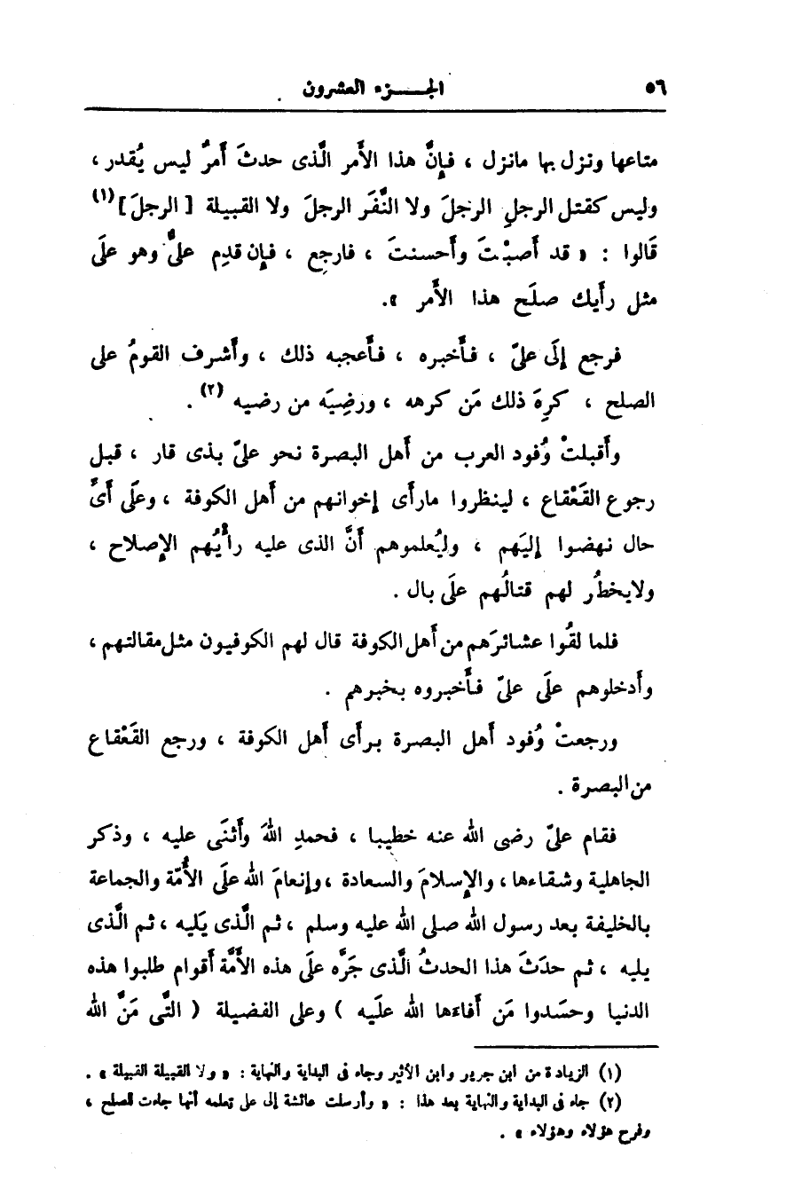 [2] جاء فى البداية والنهاية بعد هذا: «وأرسلت عائشة إلى على تعلمه أنها جاءت الصلح، وفرح هؤلاء وهؤلاء» .