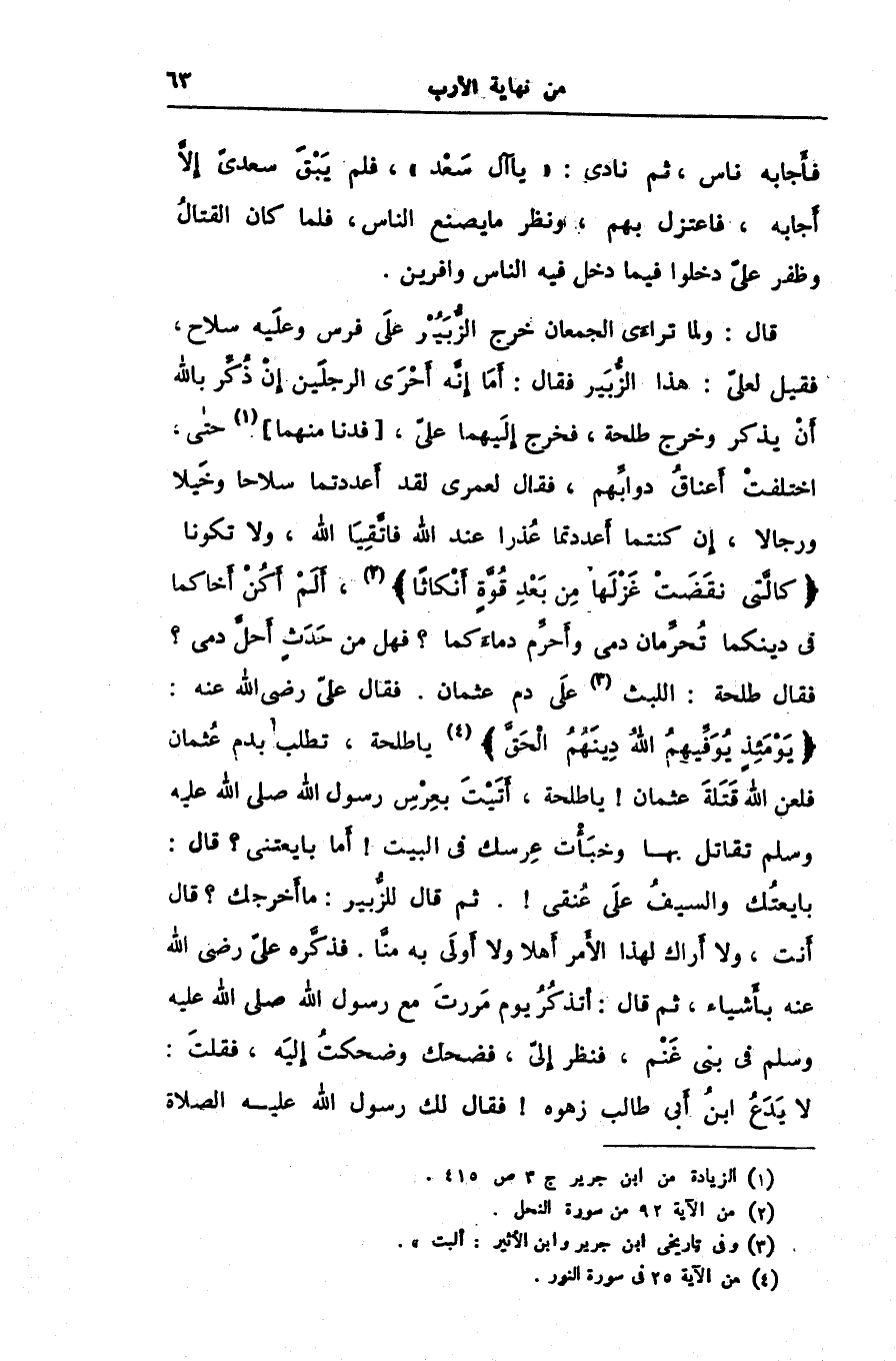 قال: ولما تراءى الجمعان خرج الزّبير على فرس وعليه سلاح، فقيل لعلىّ: هذا الزّبير فقال: أما إنّه أحرى الرجلين إن ذكّر بالله أن يذكر وخرج طلحة، فخرج إليهما علىّ، [فدنا منهما] [1] حتى، اختلفت أعناق دوابّهم، فقال لعمرى لقد أعددتما سلاحا وخيلا ورجالا، إن كنتما أعددتما عذرا عند الله فاتّقيا الله، ولا تكونا كَالَّتِي نَقَضَتْ غَزْلَها مِنْ بَعْدِ قُوَّةٍ أَنْكاثاً