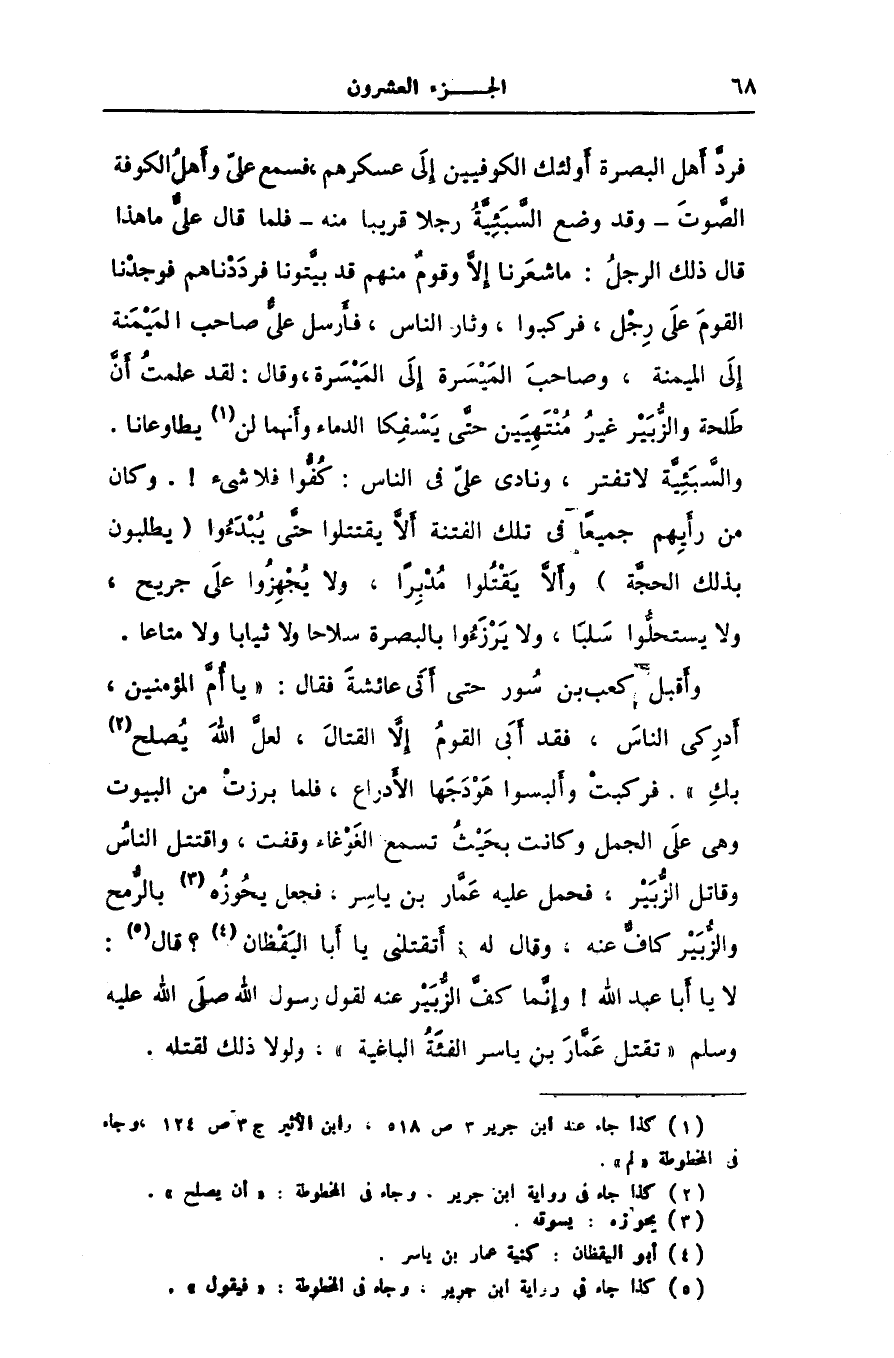والسّبئيّة لا تفتر، ونادى علىّ فى الناس: كفّوا فلا شىء!. وكان من رأيهم جميعا فى تلك الفتنة ألّا يقتتلوا حتّى يبدءوا (يطلبون بذلك الحجّة) وألّا يقتلوا مدبرا، ولا يجهزوا على جريح، ولا يستحلّوا سلبا، ولا يرزءوا بالبصرة سلاحا ولا ثيابا ولا متاعا.
