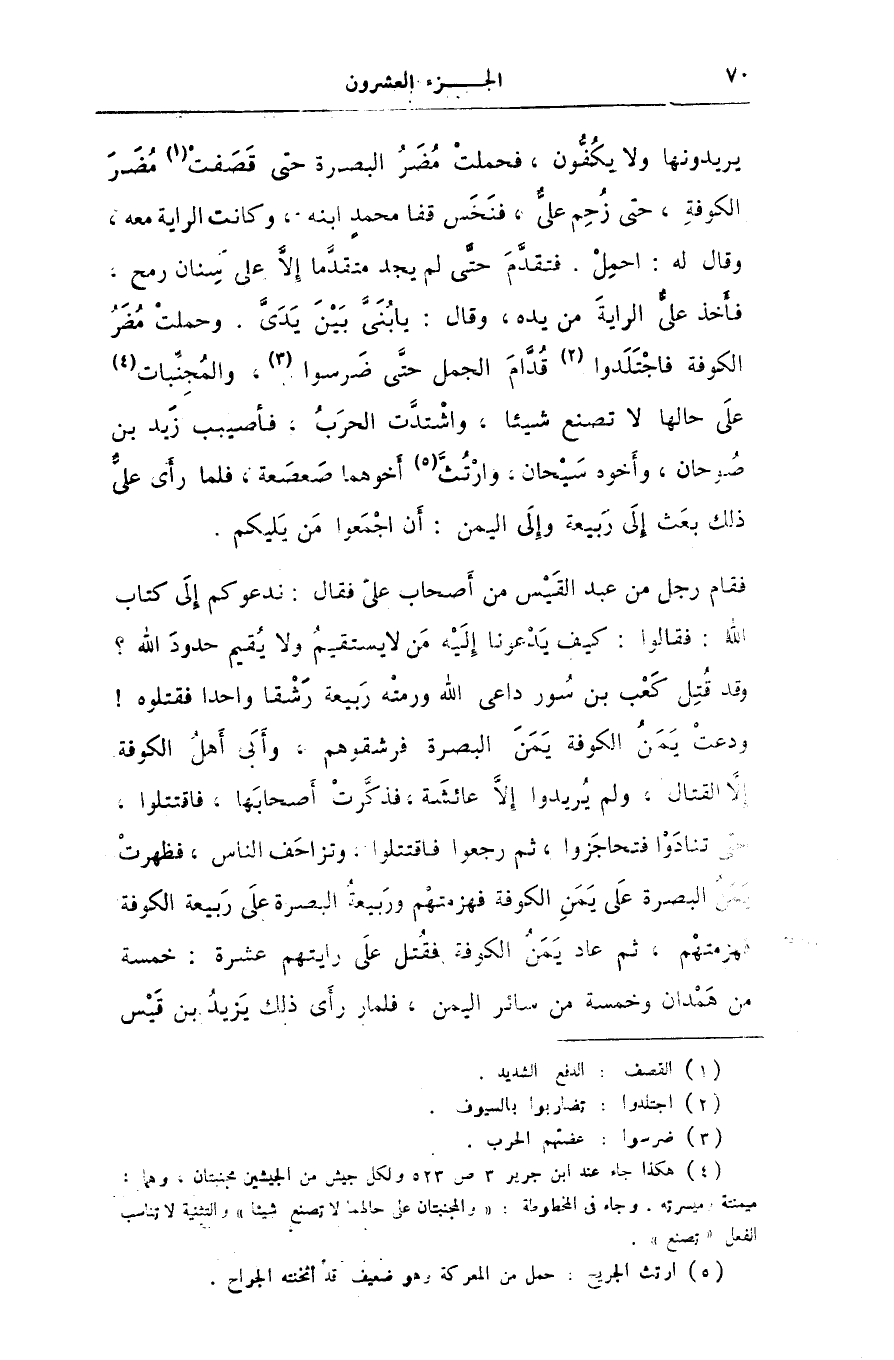 يريدونها ولا يكفّون، فحملت مضر البصرة حتى قصفت [1] مضر الكوفة، حتى زحم علىّ، فنخس قفا محمد ابنه، وكانت الراية معه، وقال له: احمل. فتقدّم حتّى لم يجد متقدّما إلّا على سنان رمح، فأخذ علىّ الراية من يده، وقال: يا بنىّ بين يدىّ. وحملت مضر الكوفة فاجتلدوا [2] قدّام الجمل حتّى ضرسوا [3] ، والمجنّبات [4] على حالها لا تصنع شيئا، واشتدّت الحرب، فأصيبب زيد بن صوحان، وأخوه سيحان، وارتثّ [5] أخوهما صعصعة، فلما رأى علىّ ذلك بعث إلى ربيعة وإلى اليمن: أن اجمعوا من يليكم.