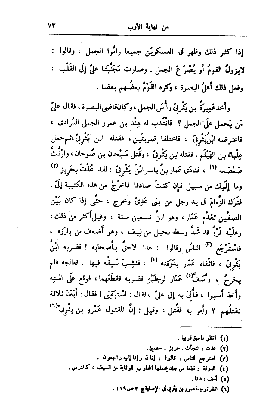 وأخذ عميرة بن يثربىّ رأس الجمل، وكان قاضى البصرة، فقال علىّ من يحمل على الجمل؟ فانتدب له هند بن عمرو الجملى المرادى، فاعترضه ابن يثربىّ، فاختلفا ضربتين، فقتله ابن يثربىّ، ثم حمل علباء بن الهيثم، فقتله ابن يثربىّ، وقتل سيحان بن صوحان، وارتثّ صعصعه [1] ، فنادى عمار بن ياسر ابن يثربىّ: لقد عذت بحريز [2] وما إليك من سبيل فإن كنت صادقا فاخرج من هذه الكتيبة إلىّ.
