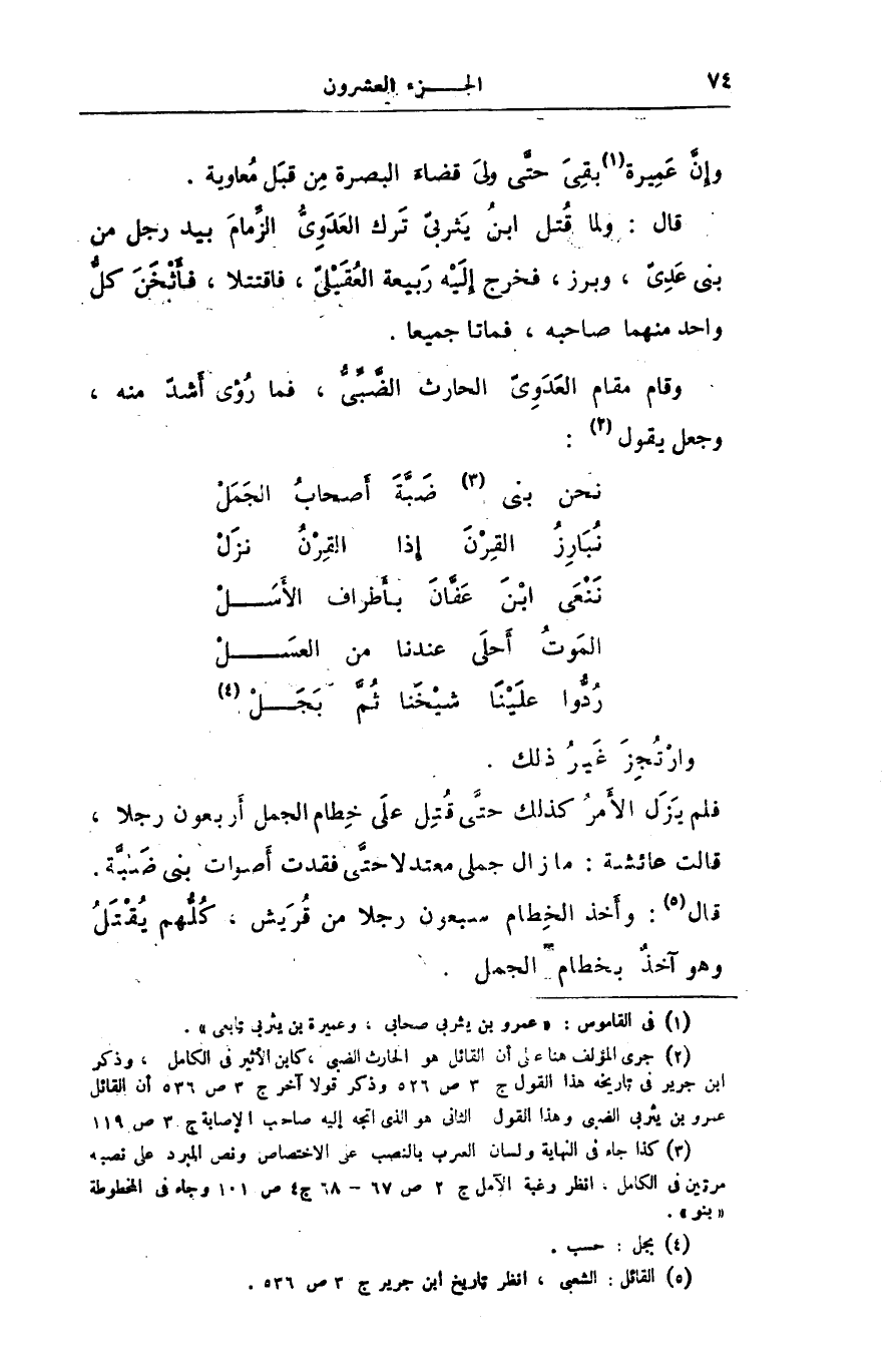 [2] جرى المؤلف هنا على أن القائل هو الحارث الضبى، كابن الأثير فى الكامل، وذكر ابن جرير فى تاريخه هذا القول ج 3 ص 526 وذكر قولا آخر ج 3 ص 536 أن القائل عمرو بن يثربى الضبى وهذا القول الثانى هو الذى اتجه إليه صاحب الإصابة ج 3 ص 119.