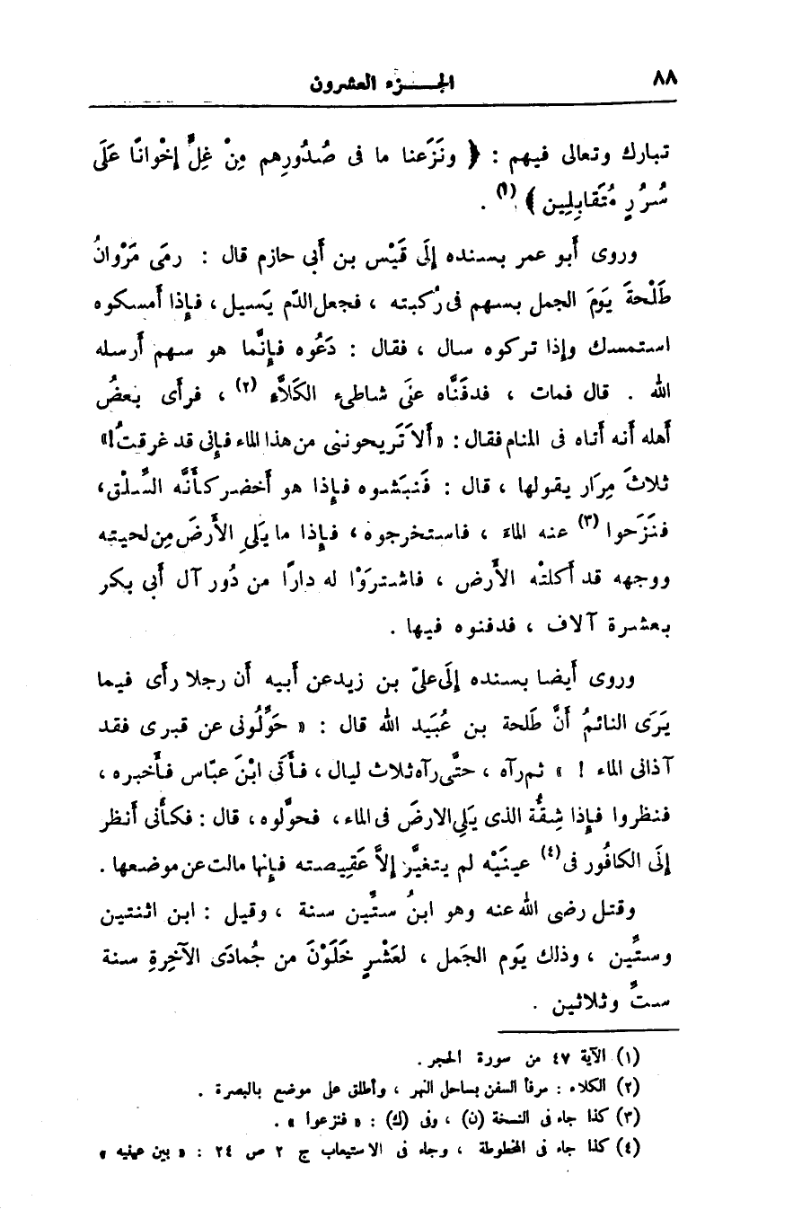وروى أبو عمر بسنده إلى قيس بن أبى حازم قال: رمى مروان طلحة يوم الجمل بسهم فى ركبته، فجعل الدّم يسيل، فإذا أمسكوه استمسك وإذا تركوه سال، فقال: دعوه فإنّما هو سهم أرسله الله. قال فمات، فدفنّاه على شاطئ الكلّاء [2] ، فرأى بعض أهله أنه أتاه فى المنام فقال: «ألا تريحوننى من هذا الماء فإنى قد غرقت!» ثلاث مرار يقولها، قال: فنبشوه فإذا هو أخضر كأنّه السّلق، فنزحوا [3] عنه الماء، فاستخرجوه، فإذا ما يلى الأرض من لحيته ووجهه قد أكلته الأرض، فاشتروا له دارا من دور آل أبى بكر بعشرة آلاف، فدفنوه فيها.