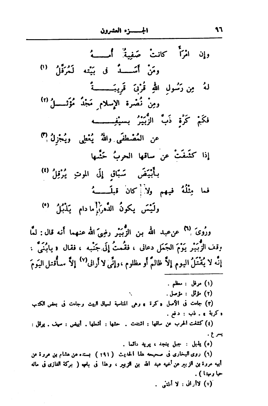 فكم كرّة ذبّ الزّبير بسيفه ... عن المصطفى والله يعطى ويجزل [3]