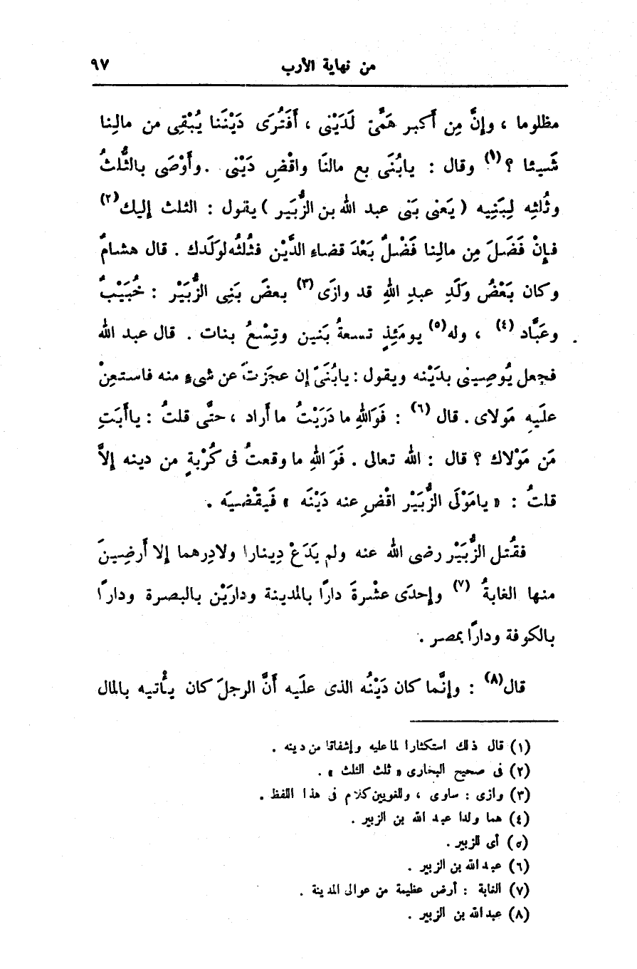 مظلوما، وإنّ من أكبر همّى لدينى، أفترى ديننا يبقى من مالنا شيئا؟ [1] وقال: يا بنى بع مالنا واقض دينى. وأوصى بالثّلث وثلثه لبنيه (يعنى بنى عبد الله بن الزّبير) يقول: الثلث إليك [2] فإن فضل من مالنا فضل بعد قضاء الدّين فثلثه لولدك. قال هشام وكان بعض ولد عبد الله قد وازى [3] بعض بنى الزّبير: خبيب وعبّاد [4] ، وله [5] يومئذ تسعة بنين وتسع بنات. قال عبد الله فجعل يوصينى بدينه ويقول: يا بنىّ إن عجزت عن شىء منه فاستعن عليه مولاى. قال [6] : فو الله ما دريت ما أراد، حتّى قلت: يا أبت من مولاك؟ قال: الله تعالى. فو الله ما وقعت فى كربة من دينه إلّا قلت: «يا مولى الزّبير اقض عنه دينه» فيقضيه.