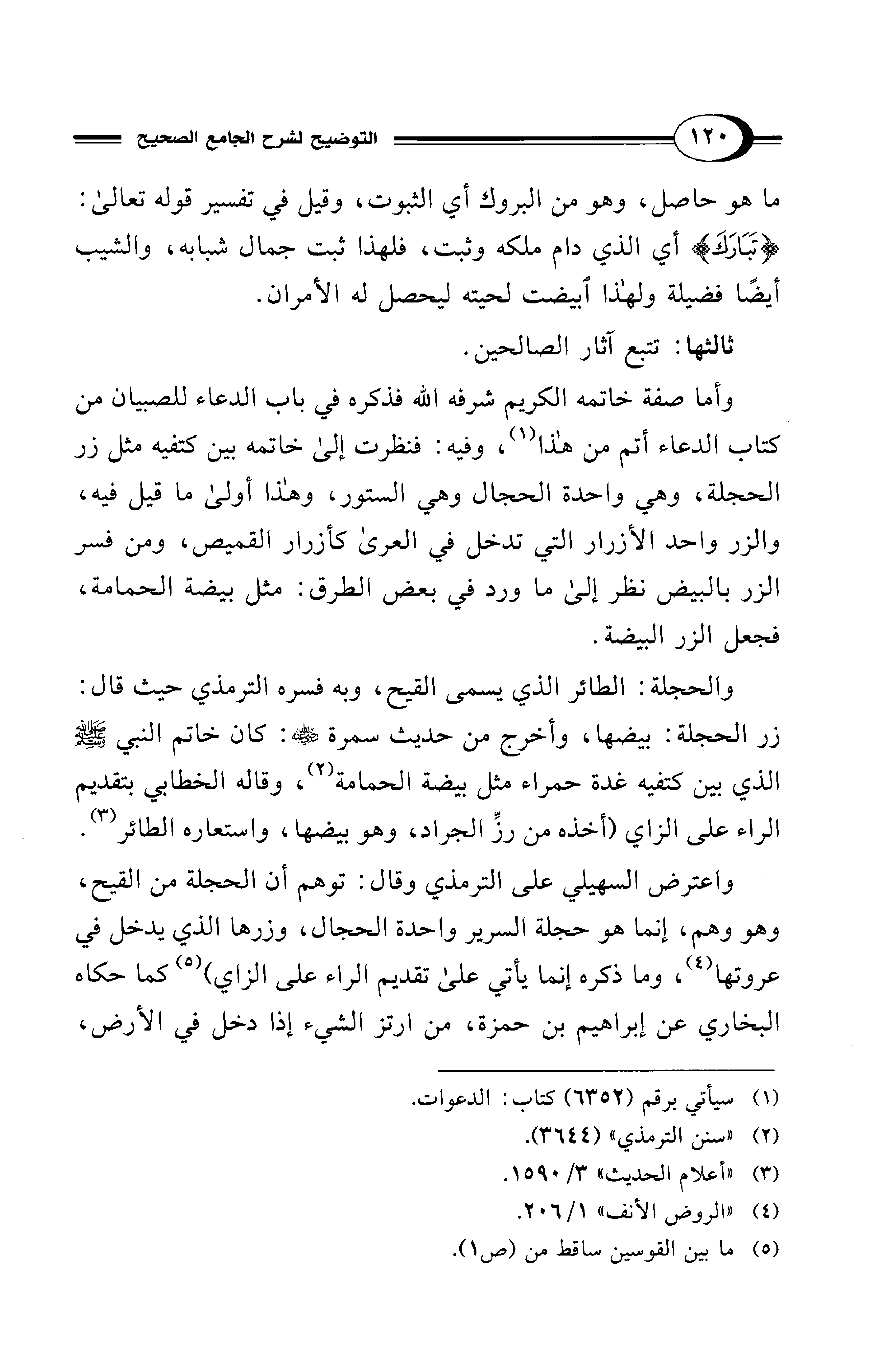وأما صفة خاتمه الكريم شرفه الله فذكره في باب الدعاء للصبيان من كتاب الدعاء أتم من هذا (¬1)، وفيه: فنظرت إلا خاتمه بين كتفيه مثل زر الحجلة، وهي واحدة الحجال وهي الستور، وهذا أولى ما قيل فيه، والزر واحد الأزرار التي تدخل في العربي كأزرار القميص، ومن فسر الزر بالبيض نظر إلى ما ورد في بعض الطرق: مثل بيضة الحمامة، فجعل الزر البيضة.