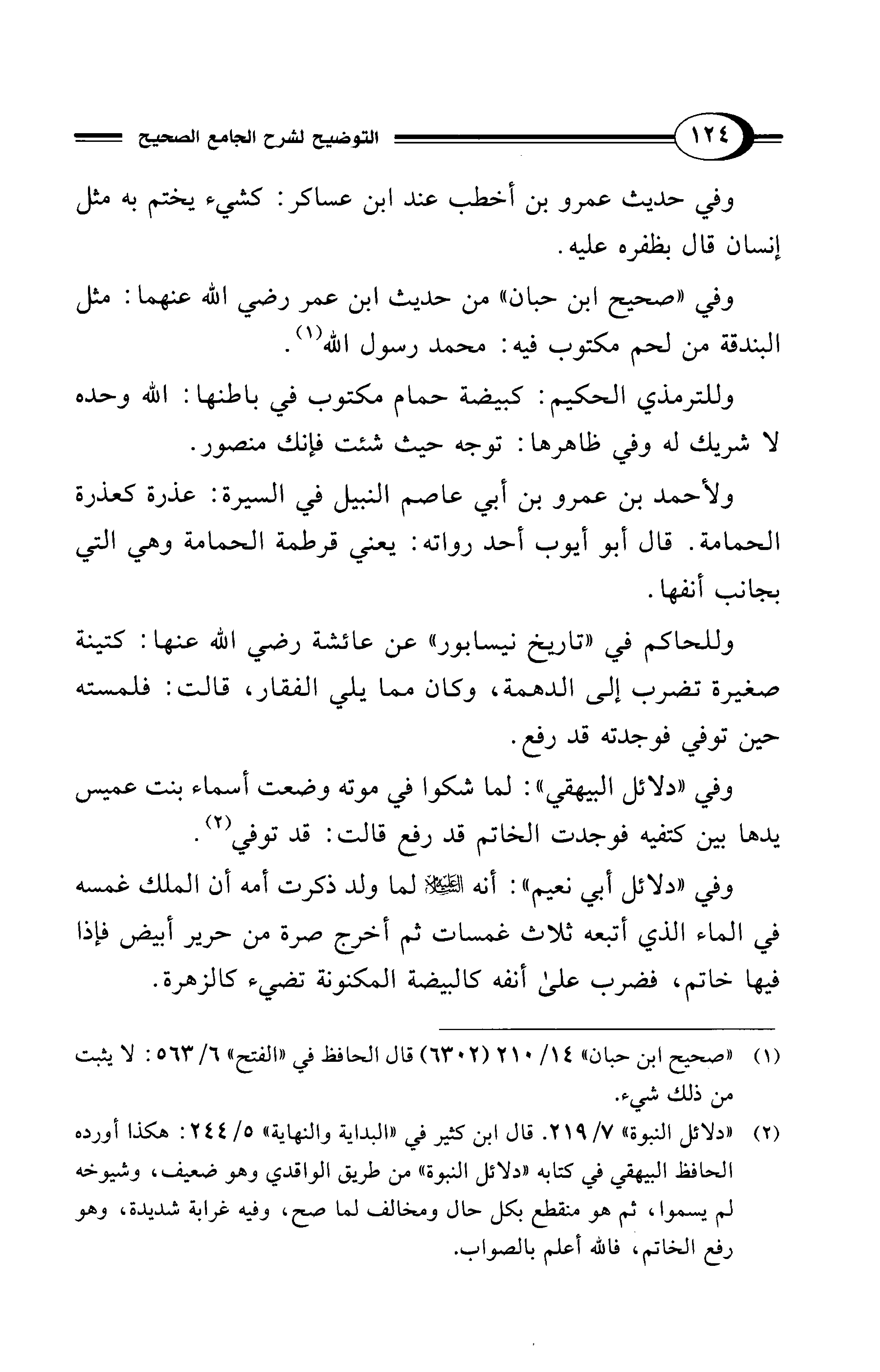 وفي "صحيح ابن حبان" من حديث ابن عمر - رضي الله عنهما -: مثل البندقة من لحم مكتوب فيه: محمد رسول الله (¬1).