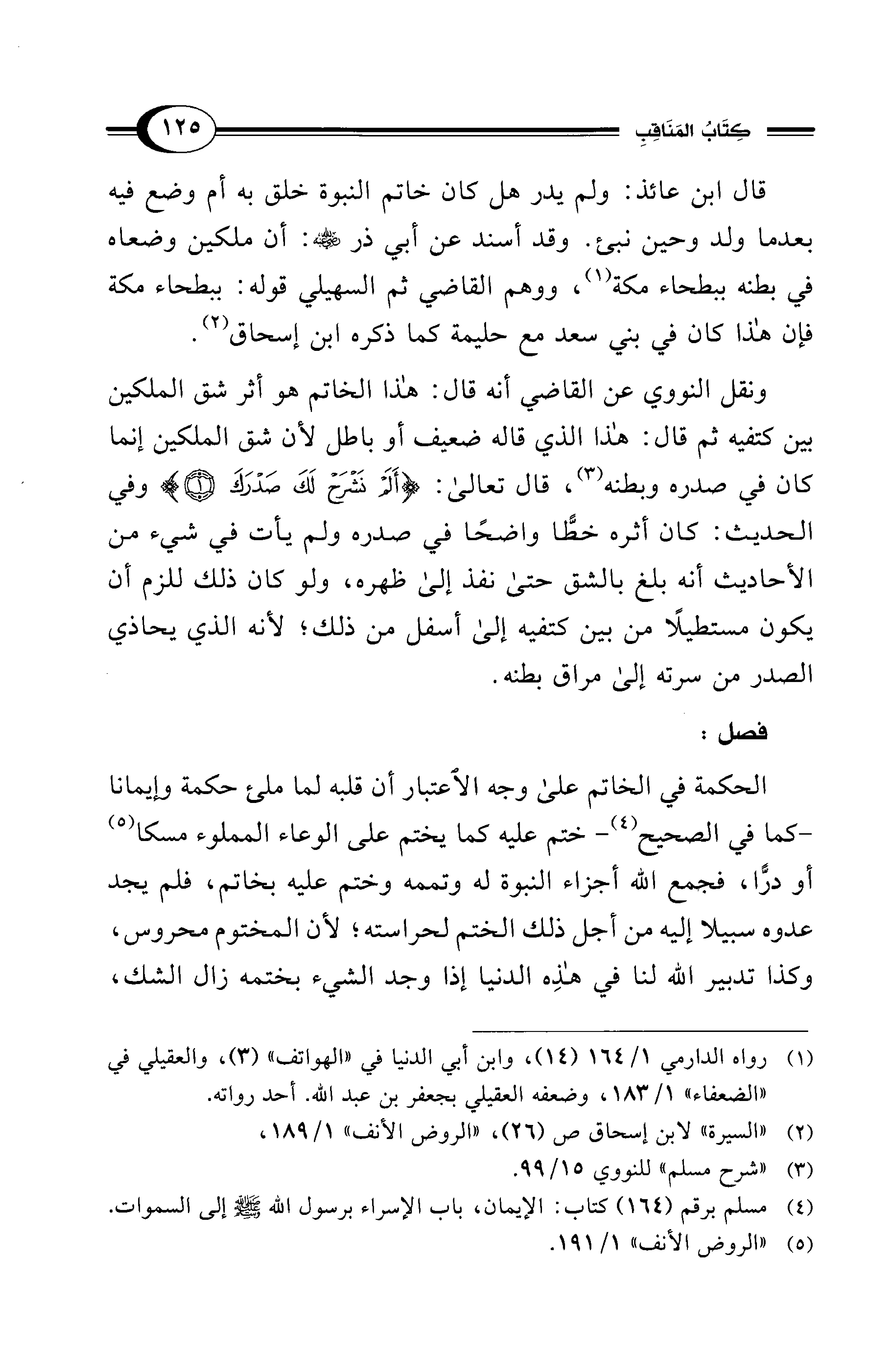 ونقل النووي عن القاضي أنه قال: هذا الخاتم هو أثر شق الملكين بين كتفيه ثم قال: هذا الذي قاله ضعيف أو باطل لأن شق الملكين إنما كان في صدره وبطنه (¬3)، قال تعالى: {أَلَمْ نَشْرَحْ لَكَ صَدْرَكَ (1)} وفي الحديث: كان أثره خطًّا واضحًا في صدره ولم يأت في شيء من الأحاديث أنه بلغ بالشق حتى نفذ إلى ظهره، ولو كان ذلك للزم أن يكون مستطيلًا من بين كتفيه إلا أسفل من ذلك؛ لأنه الذي يحاذي الصدر من سرته إلى مراق بطنه.
