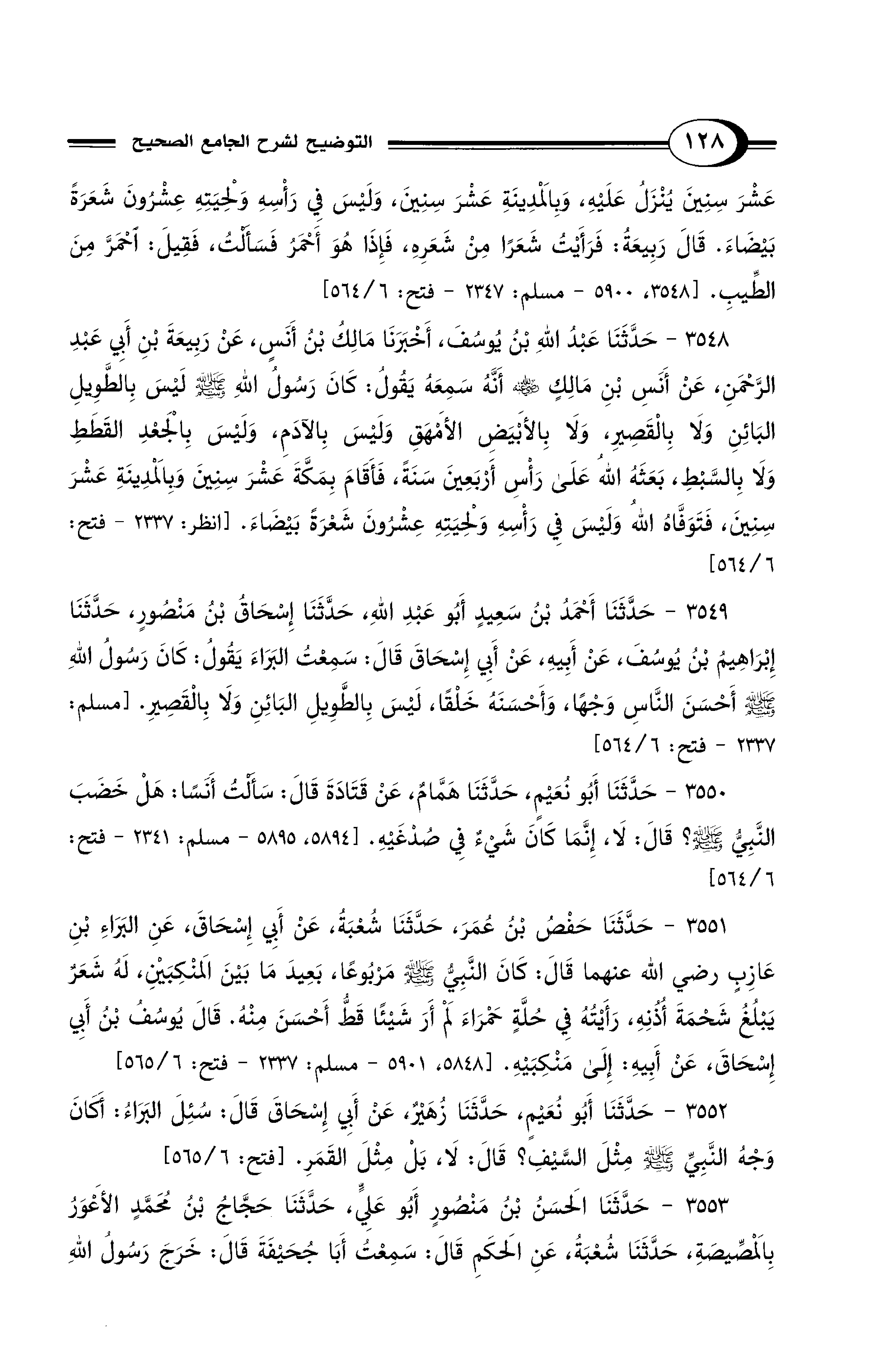 3548 - حَدَّثَنَا عَبْدُ اللهِ بْنُ يُوسُفَ, أَخْبَرَنَا مَالِكُ بْنُ أَنَسٍ, عَنْ رَبِيعَةَ بْنِ أَبِي عَبْدِ الرَّحْمَنِ, عَنْ أَنَسِ بْنِ مَالِكٍ - رضي الله عنه - أَنَّهُ سَمِعَهُ يَقُولُ: كَانَ رَسُولُ اللهِ - صلى الله عليه وسلم - لَيْسَ بِالطَّوِيلِ الْبَائِنِ وَلاَ بِالْقَصِيرِ، وَلاَ بِالأَبْيَضِ الأَمْهَقِ وَلَيْسَ بِالآدَمِ, وَلَيْسَ بِالْجَعْدِ الْقَطَطِ وَلاَ بِالسَّبْطِ، بَعَثَهُ اللهُ عَلَى رَأْسِ أَرْبَعِينَ سَنَةً، فَأَقَامَ بِمَكَّةَ عَشْرَ سِنِينَ وَبِالْمَدِينَةِ عَشْرَ سِنِينَ، فَتَوَفَّاهُ اللهُ وَلَيْسَ فِي رَأْسِهِ وَلِحْيَتِهِ عِشْرُونَ شَعْرَةً بَيْضَاءَ. [انظر: 2337 - فتح: 6/ 564]