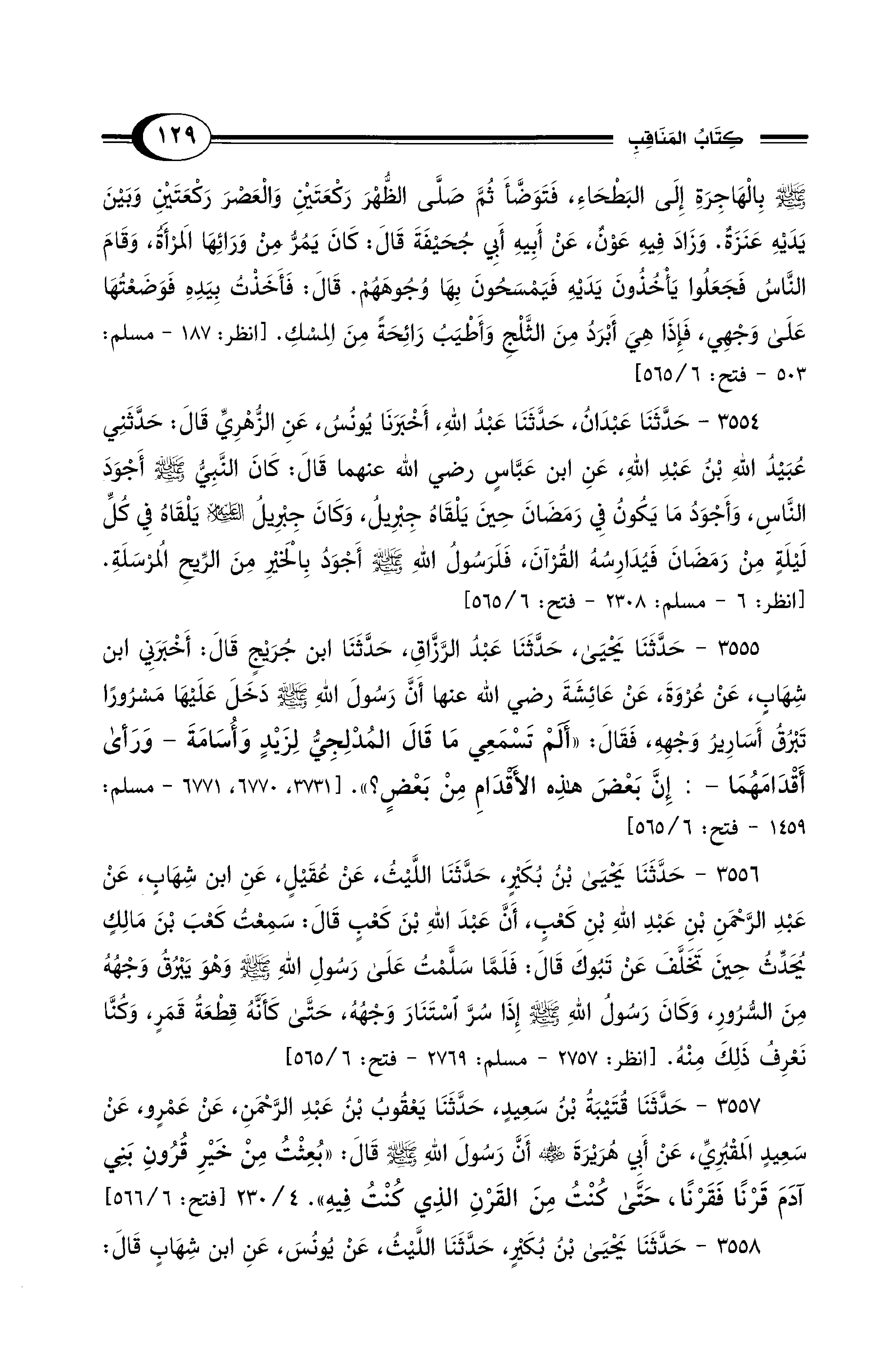 3556 - حَدَّثَنَا يَحْيَى بْنُ بُكَيْرٍ, حَدَّثَنَا اللَّيْثُ, عَنْ عُقَيْلٍ, عَنِ ابْنِ شِهَابٍ, عَنْ عَبْدِ الرَّحْمَنِ بْنِ عَبْدِ اللهِ بْنِ كَعْبٍ, أَنَّ عَبْدَ اللهِ بْنَ كَعْبٍ قَالَ: سَمِعْتُ كَعْبَ بْنَ مَالِكٍ يُحَدِّثُ حِينَ تَخَلَّفَ عَنْ تَبُوكَ قَالَ: فَلَمَّا سَلَّمْتُ عَلَى رَسُولِ اللهِ - صلى الله عليه وسلم - وَهْوَ يَبْرُقُ وَجْهُهُ مِنَ السُّرُورِ، وَكَانَ رَسُولُ اللهِ - صلى الله عليه وسلم - إِذَا سُرَّ اسْتَنَارَ وَجْهُهُ، حَتَّى كَأَنَّهُ قِطْعَةُ قَمَرٍ، وَكُنَّا نَعْرِفُ ذَلِكَ مِنْهُ. [انظر: 2757 - مسلم: 2769 - فتح: 6/ 565]