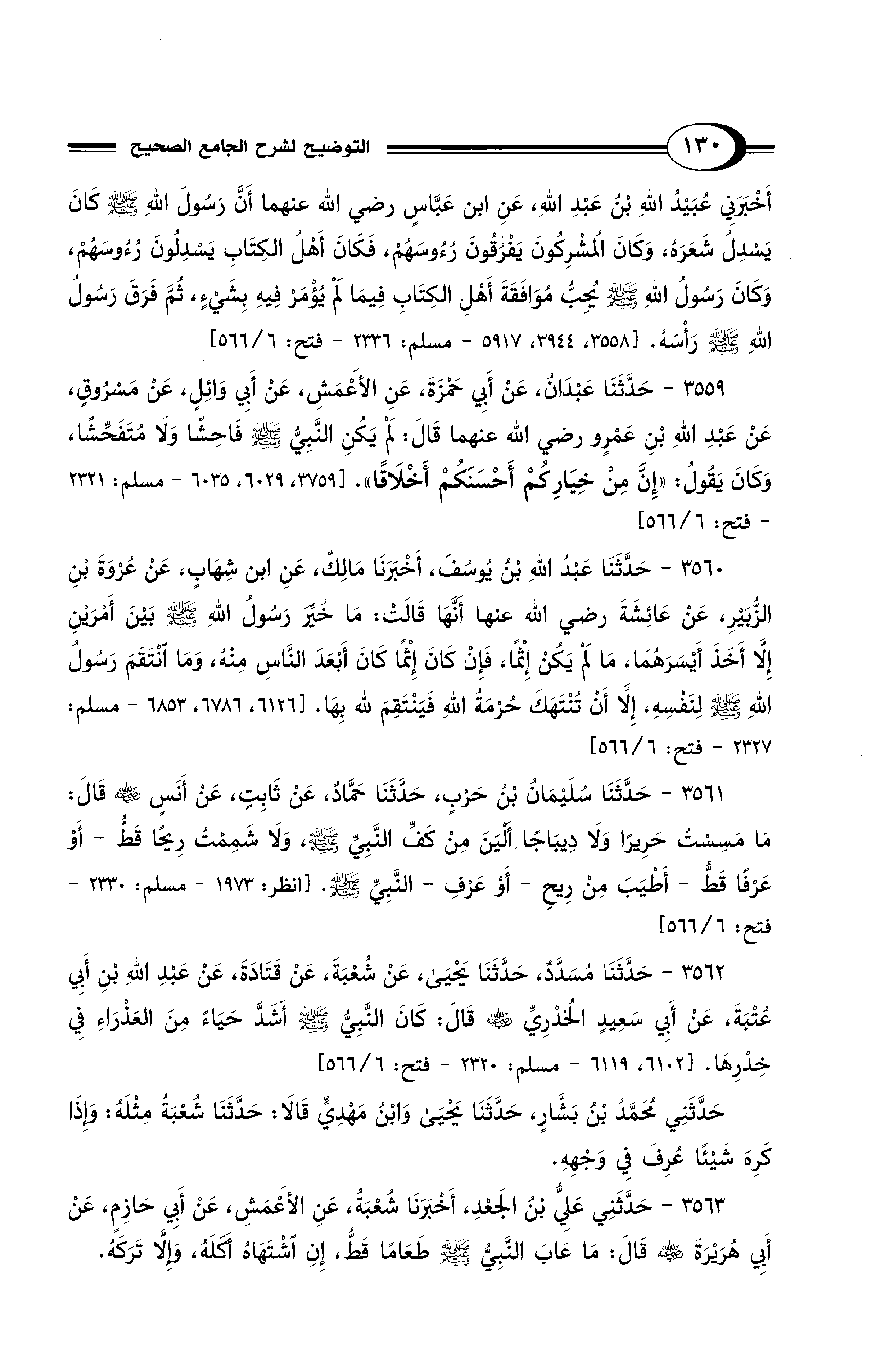 3559 - حَدَّثَنَا عَبْدَانُ, عَنْ أَبِي حَمْزَةَ, عَنِ الأَعْمَشِ, عَنْ أَبِي وَائِلٍ, عَنْ مَسْرُوقٍ, عَنْ عَبْدِ اللهِ بْنِ عَمْرٍو - رضي الله عنهما - قَالَ: لَمْ يَكُنِ النَّبِيُّ - صلى الله عليه وسلم - فَاحِشًا وَلاَ مُتَفَحِّشًا, وَكَانَ يَقُولُ: «إِنَّ مِنْ خِيَارِكُمْ أَحْسَنَكُمْ أَخْلاَقًا». [3759, 6029, 6035 - مسلم: 2321 - فتح: 6/ 566]