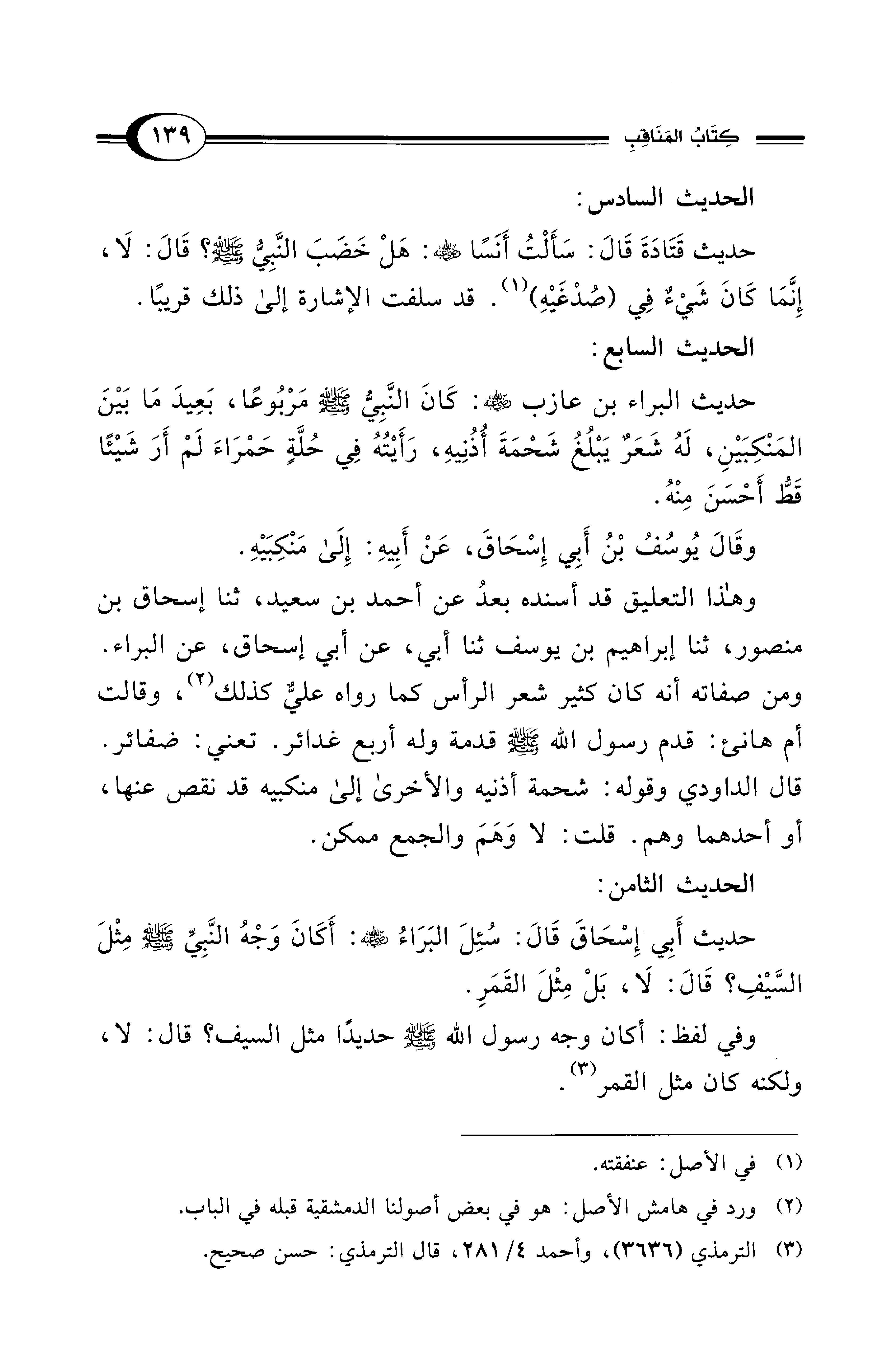 حديث أَبِي إِسْحَاقَ قَالَ: سُئِلَ البَرَاءُ - رضي الله عنه -: أَكَانَ وَجْهُ النَّبِيِّ - صلى الله عليه وسلم - مِثْلَ السَّيْفِ؟ قَالَ: لَا، بَلْ مِثْلَ القَمَرِ.