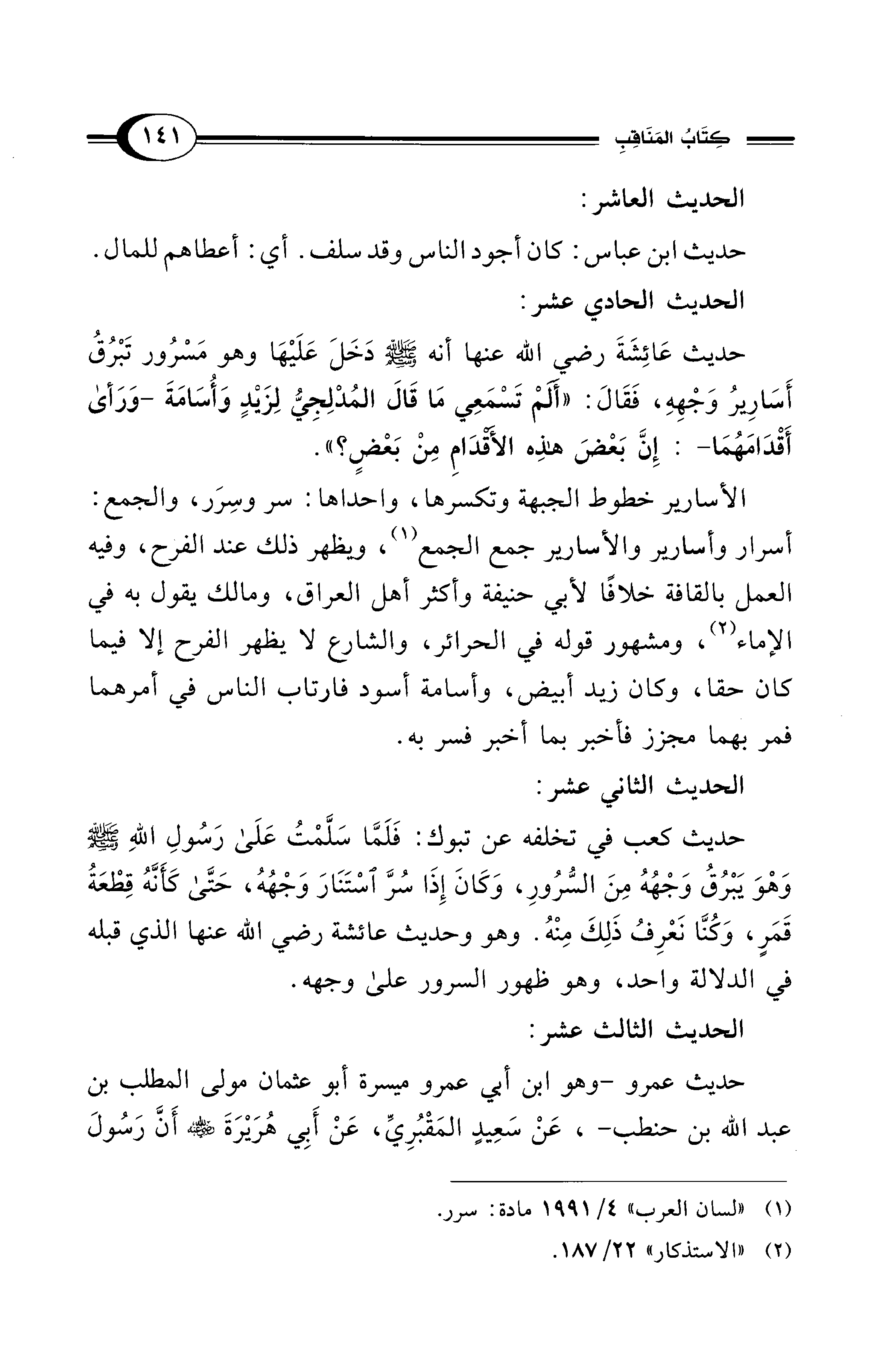 حديث كعب في تخلفه عن تبوك: فَلَمَّا سَلَّمْتُ عَلَى رَسُولِ اللهِ - صلى الله عليه وسلم - وَهْوَ يَبْرُقُ وَجْهُهُ مِنَ السُّرُورِ، وَكَانَ إِذَا سُرَّ اسْتَنَارَ وَجْهُهُ، حَتَّى كَأَنَّهُ قِطْعَةُ قَمَرٍ، وَكُنَّا نَعْرِفُ ذَلِكَ مِنْهُ. وهو وحديث عائشة - رضي الله عنها - الذي قبله في الدلالة واحد، وهو ظهور السرور على وجهه.
