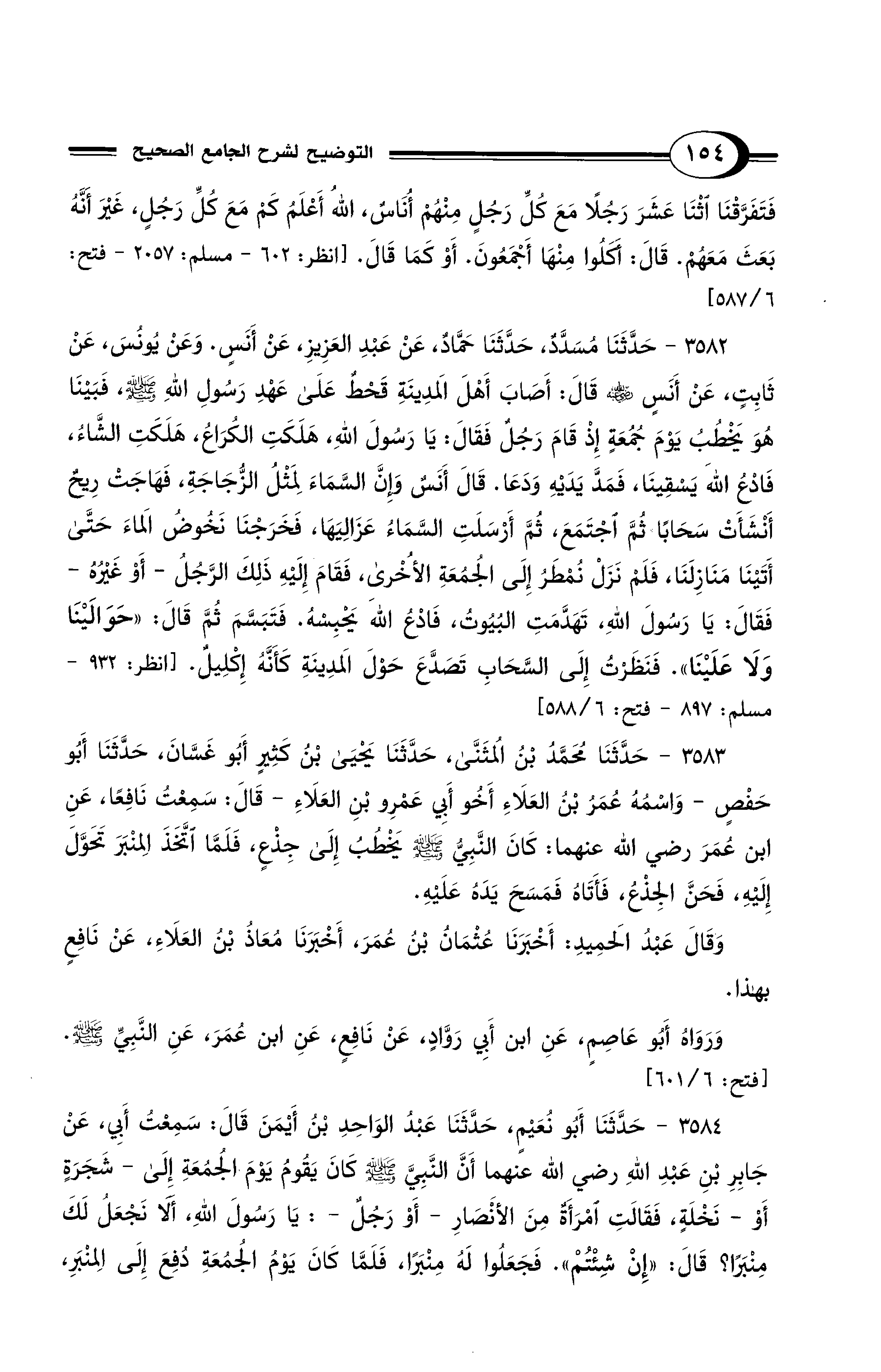3582 - حَدَّثَنَا مُسَدَّدٌ, حَدَّثَنَا حَمَّادٌ, عَنْ عَبْدِ العَزِيزِ, عَنْ أَنَسٍ. وَعَنْ يُونُسَ, عَنْ ثَابِتٍ, عَنْ أَنَسٍ - رضي الله عنه - قَالَ: أَصَابَ أَهْلَ المَدِينَةِ قَحْطٌ عَلَى عَهْدِ رَسُولِ اللهِ - صلى الله عليه وسلم -، فَبَيْنَا هُوَ يَخْطُبُ يَوْمَ جُمُعَةٍ إِذْ قَامَ رَجُلٌ فَقَالَ: يَا رَسُولَ اللهِ, هَلَكَتِ الكُرَاعُ، هَلَكَتِ الشَّاءُ، فَادْعُ اللهَ يَسْقِينَا، فَمَدَّ يَدَيْهِ وَدَعَا. قَالَ أَنَسٌ وَإِنَّ السَّمَاءَ لَمِثْلُ الزُّجَاجَةِ, فَهَاجَتْ رِيحٌ أَنْشَأَتْ سَحَابًا ثُمَّ اجْتَمَعَ، ثُمَّ أَرْسَلَتِ السَّمَاءُ عَزَالِيَهَا، فَخَرَجْنَا نَخُوضُ الْمَاءَ حَتَّى أَتَيْنَا مَنَازِلَنَا، فَلَمْ نَزَلْ نُمْطَرُ إِلَى الْجُمُعَةِ الأُخْرَى، فَقَامَ إِلَيْهِ ذَلِكَ الرَّجُلُ -أَوْ غَيْرُهُ- فَقَالَ: يَا رَسُولَ اللهِ، تَهَدَّمَتِ البُيُوتُ، فَادْعُ اللهَ يَحْبِسْهُ. فَتَبَسَّمَ ثُمَّ قَالَ: «حَوَالَيْنَا وَلاَ عَلَيْنَا». فَنَظَرْتُ إِلَى السَّحَابِ تَصَدَّعَ حَوْلَ المَدِينَةِ كَأَنَّهُ إِكْلِيلٌ. [انظر: 932 - مسلم: 897 - فتح: 6/ 588]