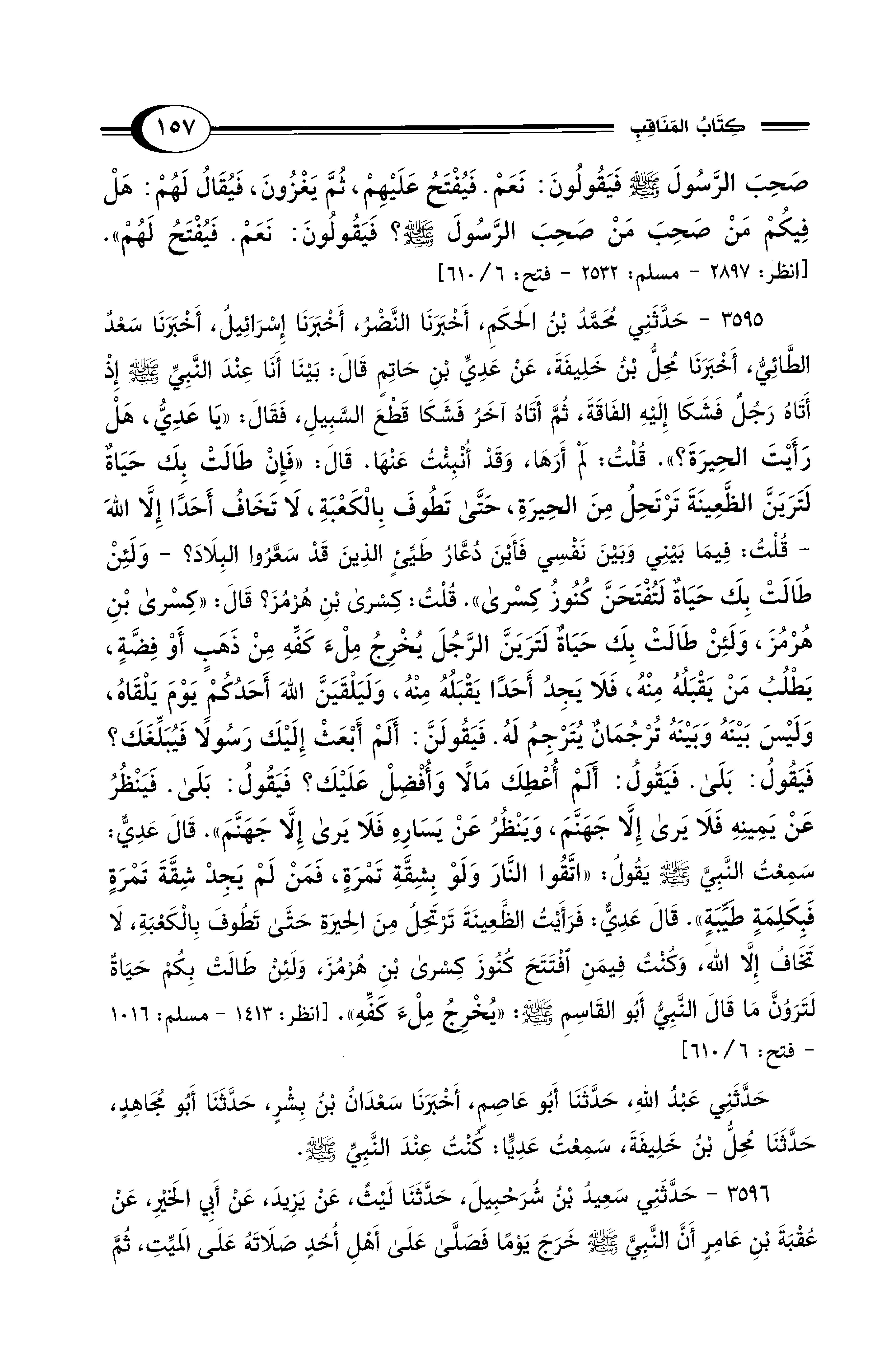 3595 - حَدَّثَنِي مُحَمَّدُ بْنُ الحَكَمِ, أَخْبَرَنَا النَّضْرُ, أَخْبَرَنَا إِسْرَائِيلُ, أَخْبَرَنَا سَعْدٌ الطَّائِيُّ, أَخْبَرَنَا مُحِلُّ بْنُ خَلِيفَةَ, عَنْ عَدِيِّ بْنِ حَاتِمٍ قَالَ: بَيْنَا أَنَا عِنْدَ النَّبِيِّ - صلى الله عليه وسلم - إِذْ أَتَاهُ رَجُلٌ فَشَكَا إِلَيْهِ الفَاقَةَ، ثُمَّ أَتَاهُ آخَرُ، فَشَكَا قَطْعَ السَّبِيلِ. فَقَالَ: «يَا عَدِيُّ, هَلْ رَأَيْتَ الْحِيرَةَ؟». قُلْتُ: لَمْ أَرَهَا وَقَدْ أُنْبِئْتُ عَنْهَا. قَالَ: «فَإِنْ طَالَتْ بِكَ حَيَاةٌ لَتَرَيَنَّ الظَّعِينَةَ تَرْتَحِلُ مِنَ الحِيرَةِ، حَتَّى تَطُوفَ بِالْكَعْبَةِ، لاَ تَخَافُ أَحَدًا إِلاَّ اللهَ» - قُلْتُ: فِيمَا بَيْنِي وَبَيْنَ نَفْسِي فَأَيْنَ دُعَّارُ طَيِّئٍ الَّذِينَ قَدْ سَعَّرُوا الْبِلاَدَ؟ -وَلَئِنْ طَالَتْ بِكَ حَيَاةٌ لَتُفْتَحَنَّ كُنُوزُ كِسْرَى». قُلْتُ: كِسْرَى بْنِ هُرْمُزَ؟ قَالَ: «كِسْرَى بْنِ هُرْمُزَ، وَلَئِنْ طَالَتْ بِكَ حَيَاةٌ لَتَرَيَنَّ الرَّجُلَ يُخْرِجُ مِلْءَ كَفِّهِ مِنْ ذَهَبٍ أَوْ فِضَّةٍ، يَطْلُبُ مَنْ يَقْبَلُهُ مِنْهُ، فَلاَ يَجِدُ أَحَدًا يَقْبَلُهُ مِنْهُ، وَلَيَلْقَيَنَّ اللهَ أَحَدُكُمْ يَوْمَ يَلْقَاهُ، وَلَيْسَ بَيْنَهُ وَبَيْنَهُ تُرْجُمَانٌ يُتَرْجِمُ لَهُ. فَيَقُولَنَّ: أَلَمْ أَبْعَثْ إِلَيْكَ رَسُولاً فَيُبَلِّغَكَ؟ فَيَقُولُ: بَلَى. فَيَقُولُ: أَلَمْ أُعْطِكَ مَالاً وَأُفْضِلْ عَلَيْكَ؟ فَيَقُولُ: بَلَى. فَيَنْظُرُ عَنْ يَمِينِهِ فَلاَ يَرَى إِلاَّ جَهَنَّمَ، وَيَنْظُرُ عَنْ يَسَارِهِ فَلاَ يَرَى إِلاَّ جَهَنَّمَ». قَالَ عَدِيٌّ: سَمِعْتُ النَّبِيَّ - صلى الله عليه وسلم - يَقُولُ: «اتَّقُوا النَّارَ وَلَوْ بِشِقَّةِ تَمْرَةٍ، فَمَنْ لَمْ يَجِدْ شِقَّةَ تَمْرَةٍ فَبِكَلِمَةٍ طَيِّبَةٍ». قَالَ عَدِيٌّ: فَرَأَيْتُ الظَّعِينَةَ تَرْتَحِلُ مِنَ الْحِيرَةِ حَتَّى تَطُوفَ بِالْكَعْبَةِ، لاَ تَخَافُ إِلاَّ اللهَ، وَكُنْتُ فِيمَنِ افْتَتَحَ كُنُوزَ كِسْرَى بْنِ هُرْمُزَ، وَلَئِنْ طَالَتْ بِكُمْ حَيَاةٌ لَتَرَوُنَّ مَا قَالَ النَّبِيُّ أَبُو القَاسِمِ - صلى الله عليه وسلم -: «يُخْرِجُ مِلْءَ كَفِّهِ». [انظر: 1413 - مسلم: 1016 - فتح: 6/ 610]
