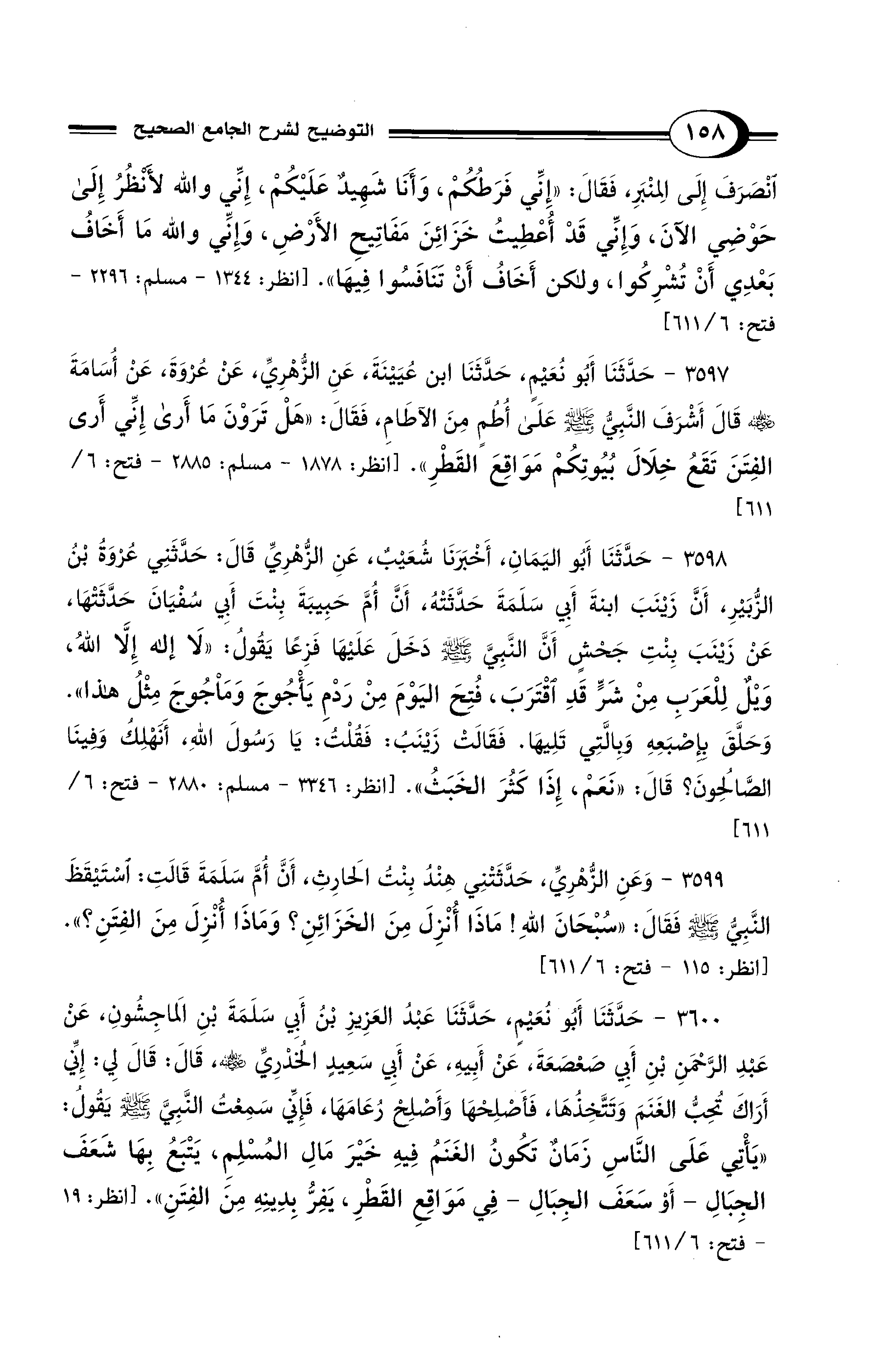 3597 - حَدَّثَنَا أَبُو نُعَيْمٍ, حَدَّثَنَا ابْنُ عُيَيْنَةَ, عَنِ الزُّهْرِيِّ, عَنْ عُرْوَةَ عَنْ أُسَامَةَ - رضي الله عنه - قَالَ أَشْرَفَ النَّبِيُّ - صلى الله عليه وسلم - عَلَى أُطُمٍ مِنَ الآطَامِ، فَقَالَ: «هَلْ تَرَوْنَ مَا أَرَى إِنِّي أَرَى الْفِتَنَ تَقَعُ خِلاَلَ بُيُوتِكُمْ مَوَاقِعَ الْقَطْرِ». [انظر: 1878 - مسلم: 2885 - فتح: 6/ 611]