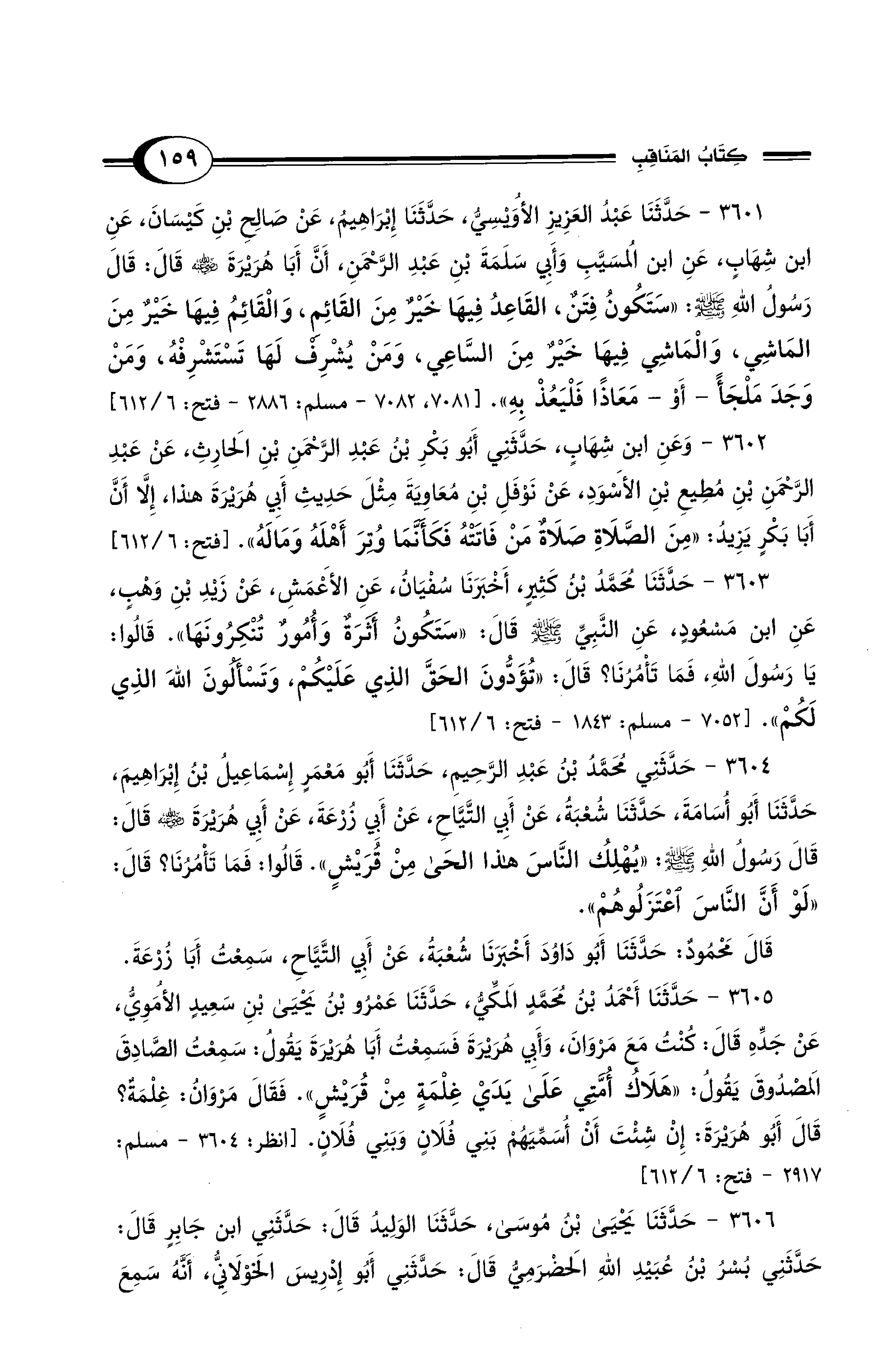 3601 - حَدَّثَنَا عَبْدُ العَزِيزِ الأُوَيْسِيُّ, حَدَّثَنَا إِبْرَاهِيمُ, عَنْ صَالِحِ بْنِ كَيْسَانَ, عَنِ ابْنِ شِهَابٍ, عَنِ ابْنِ المُسَيَّبِ وَأَبِي سَلَمَةَ بْنِ عَبْدِ الرَّحْمَنِ, أَنَّ أَبَا هُرَيْرَةَ - رضي الله عنه - قَالَ: قَالَ رَسُولُ اللهِ - صلى الله عليه وسلم -: «سَتَكُونُ فِتَنٌ، القَاعِدُ فِيهَا خَيْرٌ مِنَ القَائِمِ، وَالْقَائِمُ فِيهَا خَيْرٌ مِنَ الْمَاشِي، وَالْمَاشِي فِيهَا خَيْرٌ مِنَ السَّاعِي، وَمَنْ يُشْرِفْ لَهَا تَسْتَشْرِفْهُ، وَمَنْ وَجَدَ مَلْجَأً -أَوْ- مَعَاذًا فَلْيَعُذْ بِهِ». [انظر: 7081, 7082 - مسلم: 2886 - فتح: 6/ 612]