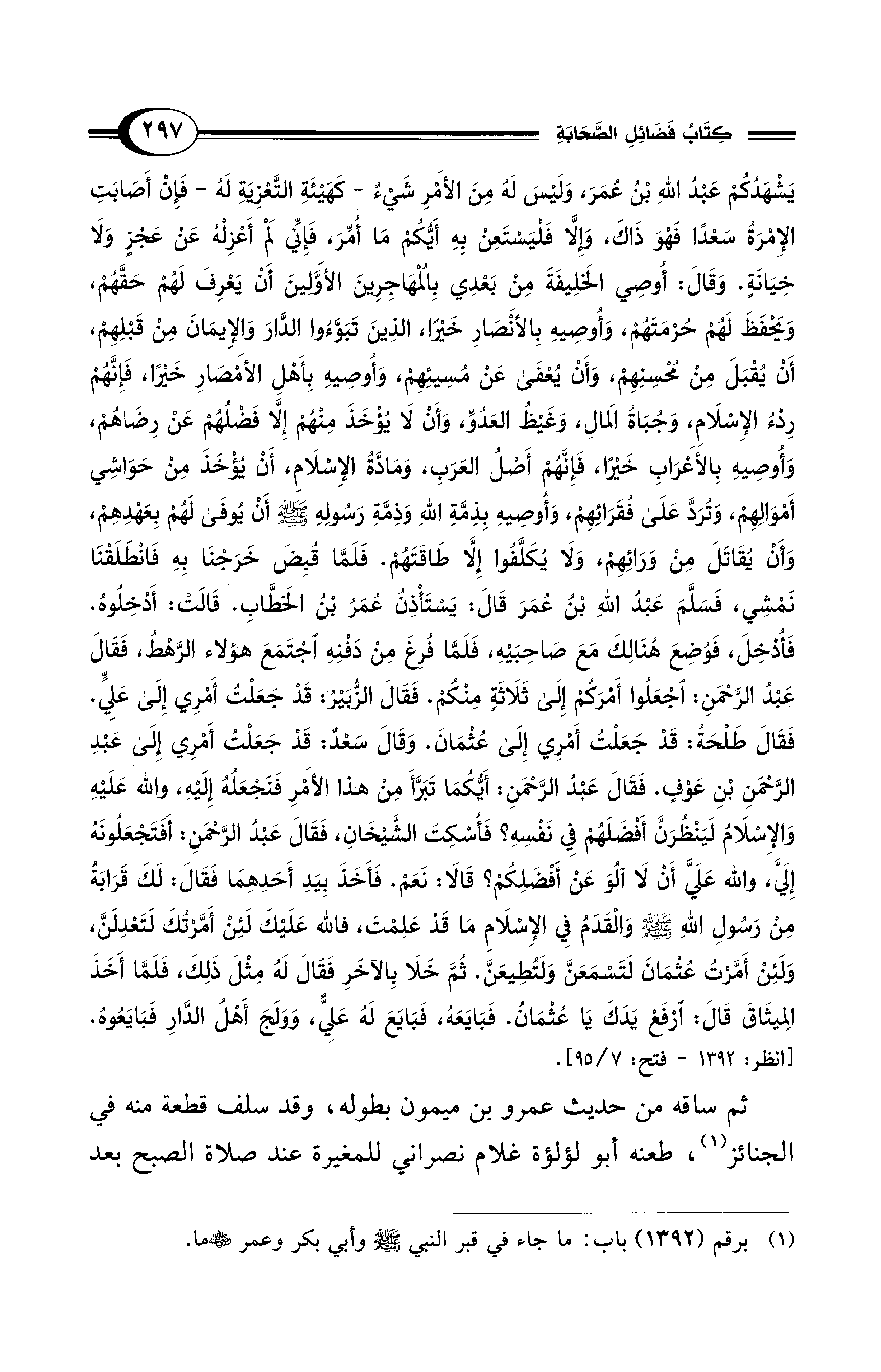 يَشْهَدُكُمْ عَبْدُ اللهِ بْنُ عُمَرَ, وَلَيْسَ لَهُ مِنَ الأَمْرِ شَيْءٌ -كَهَيْئَةِ التَّعْزِيَةِ لَهُ- فَإِنْ أَصَابَتِ الإِمْرَةُ سَعْدًا فَهْوَ ذَاكَ، وَإِلاَّ فَلْيَسْتَعِنْ بِهِ أَيُّكُمْ مَا أُمِّرَ، فَإِنِّي لَمْ أَعْزِلْهُ عَنْ عَجْزٍ وَلاَ خِيَانَةٍ وَقَالَ: أُوصِي الخَلِيفَةَ مِنْ بَعْدِي بِالْمُهَاجِرِينَ الأَوَّلِينَ أَنْ يَعْرِفَ لَهُمْ حَقَّهُمْ، وَيَحْفَظَ لَهُمْ حُرْمَتَهُمْ، وَأُوصِيهِ بِالأَنْصَارِ خَيْرًا، الَّذِينَ تَبَوَّءُوا الدَّارَ وَالإِيمَانَ مِنْ قَبْلِهِمْ، أَنْ يُقْبَلَ مِنْ مُحْسِنِهِمْ، وَأَنْ يُعْفَى عَنْ مُسِيئِهِمْ، وَأُوصِيهِ بِأَهْلِ الأَمْصَارِ خَيْرًا, فَإِنَّهُمْ رِدْءُ الإِسْلاَمِ، وَجُبَاةُ المَالِ، وَغَيْظُ العَدُوِّ، وَأَنْ لاَ يُؤْخَذَ مِنْهُمْ إِلاَّ فَضْلُهُمْ عَنْ رِضَاهُمْ، وَأُوصِيهِ بِالأَعْرَابِ خَيْرًا، فَإِنَّهُمْ أَصْلُ العَرَبِ, وَمَادَّةُ الإِسْلاَمِ, أَنْ يُؤْخَذَ مِنْ حَوَاشِي أَمْوَالِهِمْ وَتُرَدَّ عَلَى فُقَرَائِهِمْ، وَأُوصِيهِ بِذِمَّةِ اللهِ وَذِمَّةِ رَسُولِهِ - صلى الله عليه وسلم - أَنْ يُوفَى لَهُمْ بِعَهْدِهِمْ، وَأَنْ يُقَاتَلَ مِنْ وَرَائِهِمْ، وَلاَ يُكَلَّفُوا إِلاَّ طَاقَتَهُمْ. فَلَمَّا قُبِضَ خَرَجْنَا بِهِ فَانْطَلَقْنَا نَمْشِي, فَسَلَّمَ عَبْدُ اللهِ بْنُ عُمَرَ قَالَ: يَسْتَأْذِنُ عُمَرُ بْنُ الخَطَّابِ. قَالَتْ: أَدْخِلُوهُ. فَأُدْخِلَ، فَوُضِعَ هُنَالِكَ مَعَ صَاحِبَيْهِ، فَلَمَّا فُرِغَ مِنْ دَفْنِهِ اجْتَمَعَ هَؤُلاَءِ الرَّهْطُ، فَقَالَ عَبْدُ الرَّحْمَنِ: اجْعَلُوا أَمْرَكُمْ إِلَى ثَلاَثَةٍ مِنْكُمْ. فَقَالَ الزُّبَيْرُ: قَدْ جَعَلْتُ أَمْرِي إِلَى عَلِيٍّ. فَقَالَ طَلْحَةُ: قَدْ جَعَلْتُ أَمْرِي إِلَى عُثْمَانَ. وَقَالَ سَعْدٌ: قَدْ جَعَلْتُ أَمْرِي إِلَى عَبْدِ الرَّحْمَنِ بْنِ عَوْفٍ. فَقَالَ عَبْدُ الرَّحْمَنِ: أَيُّكُمَا تَبَرَّأَ مِنْ هَذَا الأَمْرِ فَنَجْعَلُهُ إِلَيْهِ، وَاللهُ عَلَيْهِ وَالإِسْلاَمُ لَيَنْظُرَنَّ أَفْضَلَهُمْ فِي نَفْسِهِ؟ فَأُسْكِتَ الشَّيْخَانِ، فَقَالَ عَبْدُ الرَّحْمَنِ: أَفَتَجْعَلُونَهُ إِلَيَّ، وَاللهُ عَلَيَّ أَنْ لاَ آلُوَ عَنْ أَفْضَلِكُمْ؟ قَالاَ: نَعَمْ، فَأَخَذَ بِيَدِ أَحَدِهِمَا فَقَالَ لَكَ قَرَابَةٌ مِنْ رَسُولِ اللهِ - صلى الله عليه وسلم - وَالْقَدَمُ فِي الإِسْلاَمِ مَا قَدْ عَلِمْتَ، فَاللهُ عَلَيْكَ لَئِنْ أَمَّرْتُكَ لَتَعْدِلَنَّ، وَلَئِنْ أَمَّرْتُ عُثْمَانَ لَتَسْمَعَنَّ وَلَتُطِيعَنَّ. ثُمَّ خَلاَ بِالآخَرِ فَقَالَ لَهُ مِثْلَ ذَلِكَ، فَلَمَّا أَخَذَ المِيثَاقَ قَالَ: ارْفَعْ يَدَكَ يَا عُثْمَانُ. فَبَايَعَهُ، فَبَايَعَ لَهُ عَلِيٌّ، وَوَلَجَ أَهْلُ الدَّارِ فَبَايَعُوهُ. [انظر: 1392 - فتح: 7/ 95]