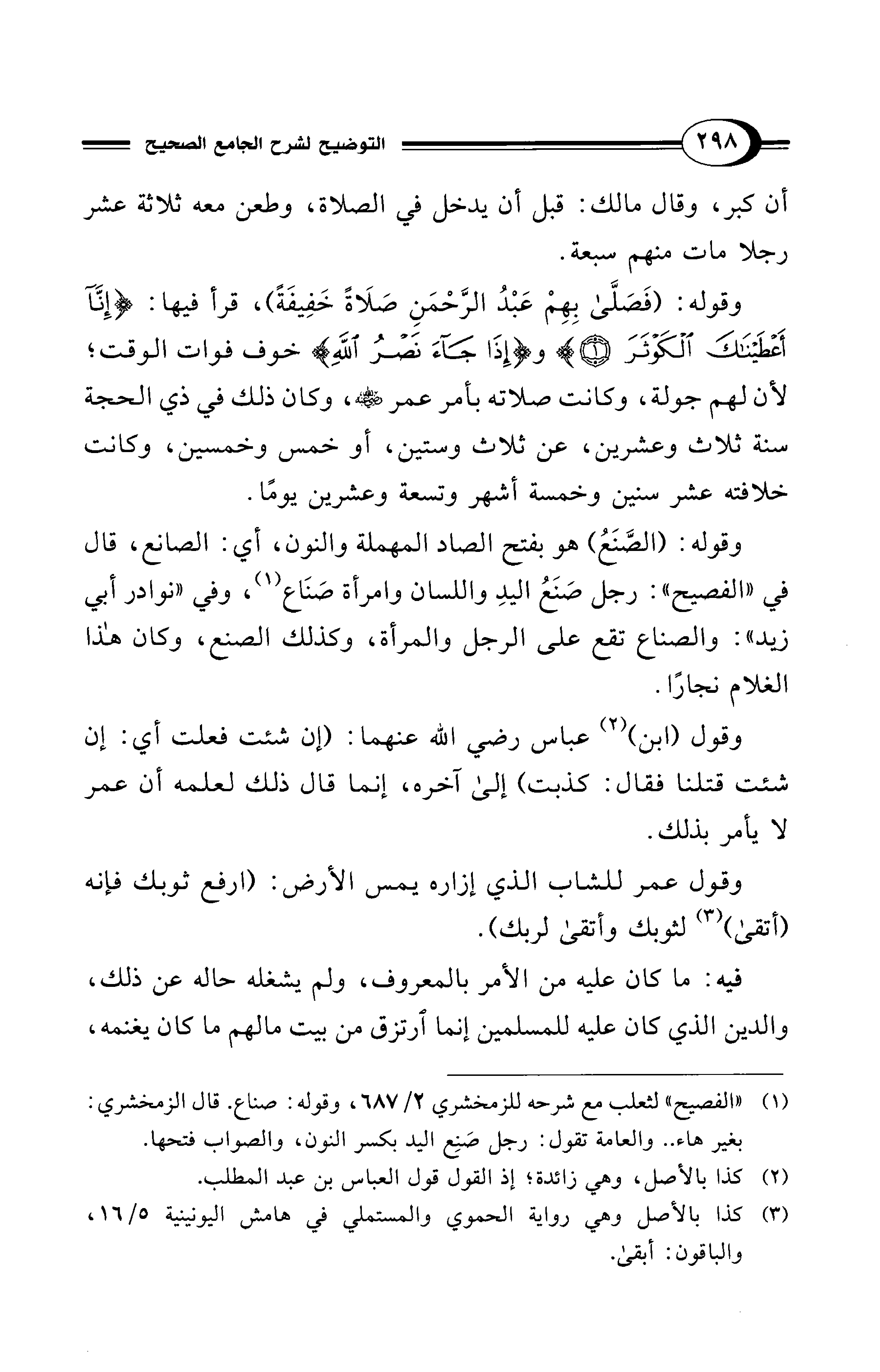 وقوله: (فَصَلَّى بِهِمْ عَبْدُ الرَّحْمَنِ صلَاةً خَفِيفَةً)، قرأ فيها: {إِنَّا أَعْطَيْنَاكَ الْكَوْثَرَ (1)} و {إِذَا جَاءَ نَصْرُ اللهِ وَالْفَتْحُ} خوف فوات الوقت؛ لأن لهم جولة، وكانت صلاته بأمر عمر - رضي الله عنه -، وكان ذلك في ذي الحجة سنة ثلاث وعشرين، عن ثلاث وستين، أو خمس وخمسين، وكانت خلافته عشر سنين وخمسة أشهر وتسعة وعشرين يومًا.