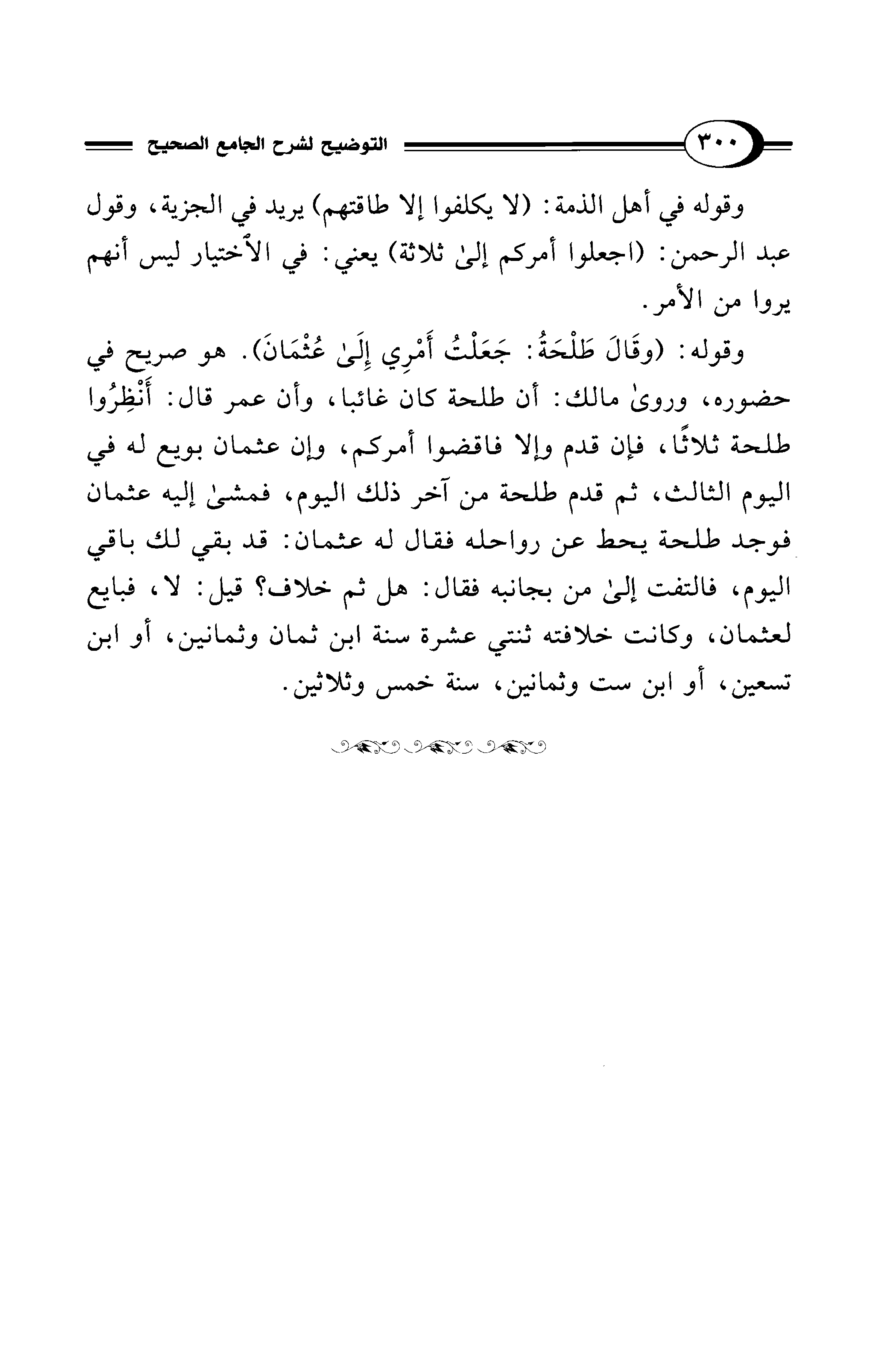 وقوله: (وقَالَ طَلْحَةُ: جَعَلْتُ أَمْرِي إِلَى عُثْمَانَ). هو صريح في حضوره، وروى مالك: أن طلحة كان غائبا، وأن عمر قال: أَنْظِرُوا طلحة ثلاثًا، فإن قدم وإلا فاقضوا أمركم، وإن عثمان بويع له في اليوم الثالث، ثم قدم طلحة من آخر ذلك اليوم، فمشى إليه عثمان فوجد طلحة يحط عن رواحله فقال له عثمان: قد بقي لك باقي اليوم، فالتفت إلى من بجانبه فقال: هل ثم خلاف؟ قيل: لا، فبايع لعثمان، وكانت خلافته ثنتي عشرة سنة ابن ثمان وثمانين، أو ابن تسعين، أو ابن ست وثمانين، سنة خمس وثلاثين.