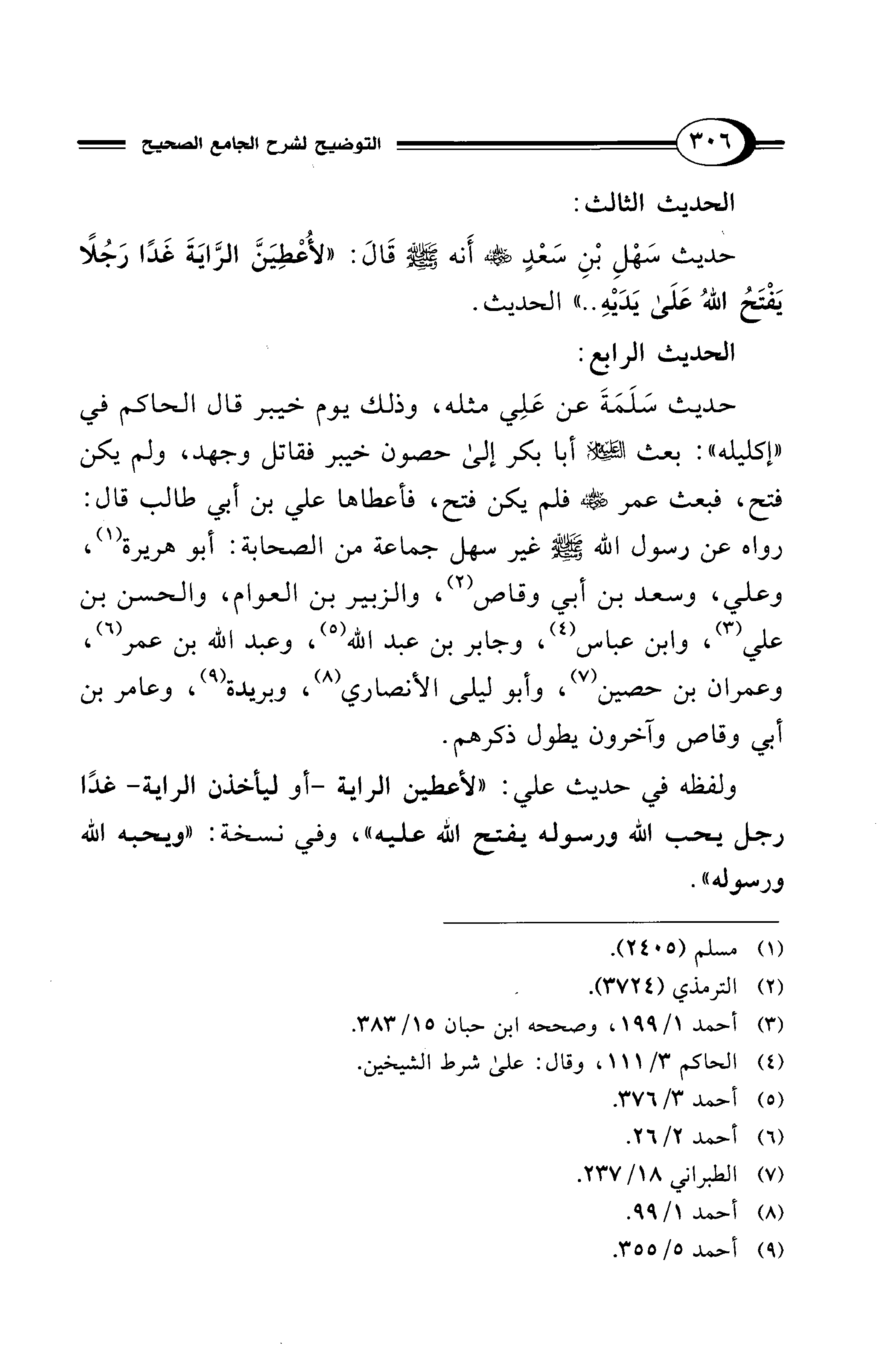 حديث سَهْلِ بْنِ سَعْدٍ - رضي الله عنه - أَنه - صلى الله عليه وسلم - قَالَ: «لأُعْطِيَنَّ الرَّايَةَ غَدًا رَجُلاً يَفْتَحُ الله عَلَى يَدَيْهِ ..» الحديث.