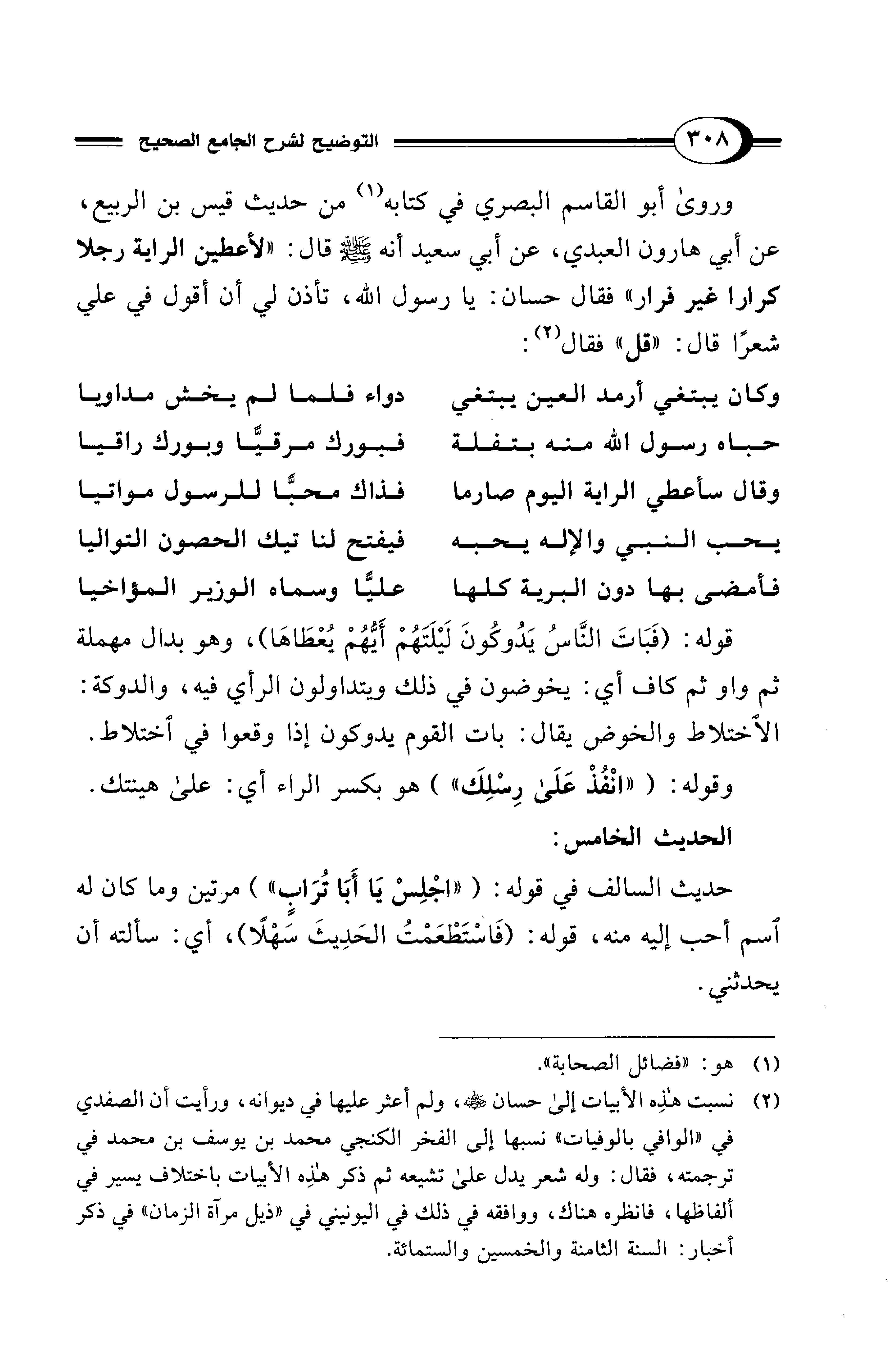 (¬2) نسبت هذِه الأبيات إلى حسان - رضي الله عنه -، ولم أعثر عليها في ديوانه، ورأيت أن الصفدي في "الوافي بالوفيات" نسبها إلى الفخر الكنجي محمد بن يوسف بن محمد في ترجمته، فقال: وله شعر يدل على تشيعه ثم ذكر هذِه الأبيات باختلاف يسير في ألفاظها، فانظره هناك، ووافقه في ذلك في اليونيني في "ذيل مرآة الزمان" في ذكر أخبار: السنة الثامنة والخمسين والستمائة.