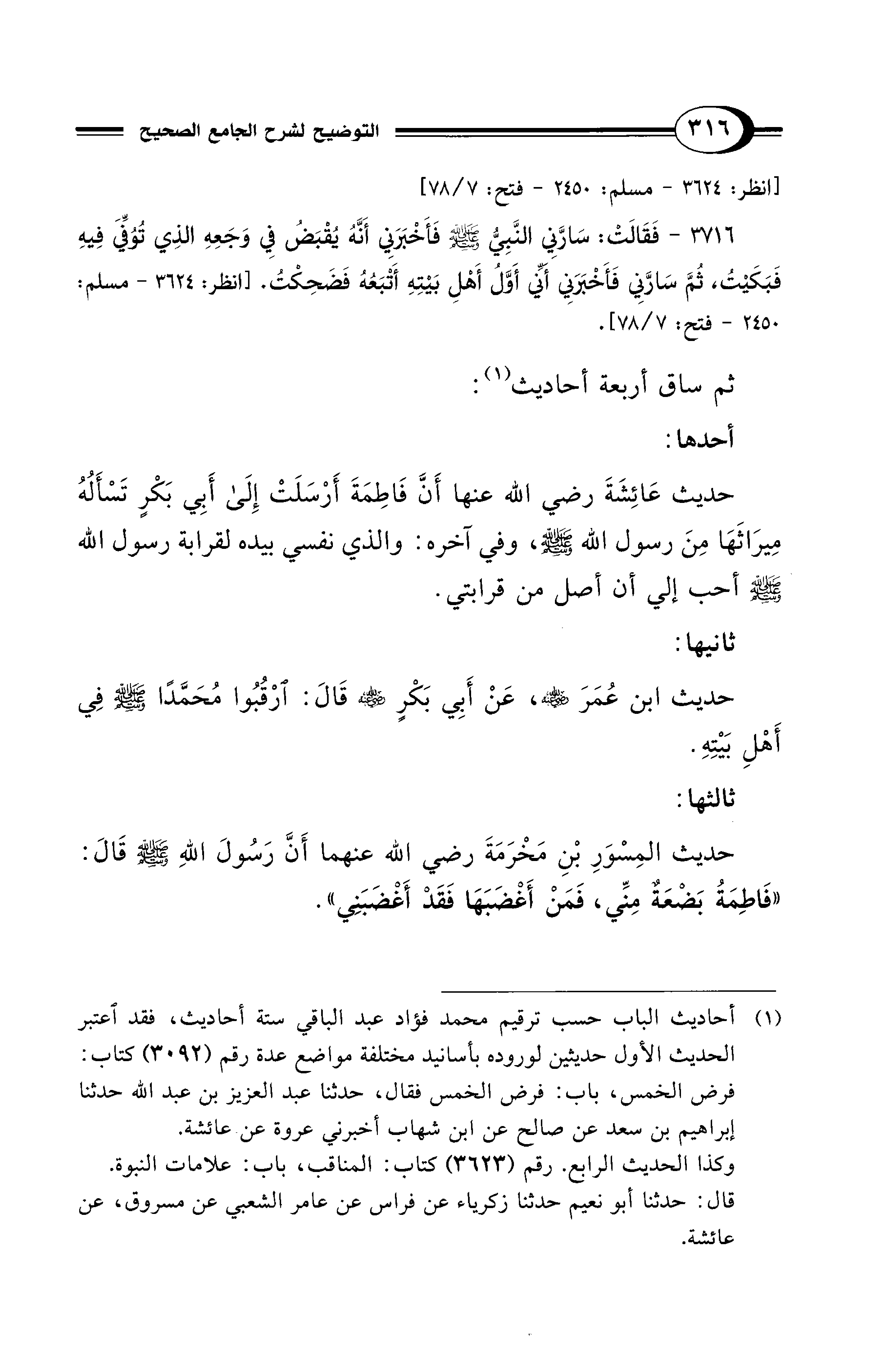 (¬1) أحاديث الباب حسب ترقيم محمد فؤاد عبد الباقي ستة أحاديث، فقد اعتبر الحديث الأول حديثين لوروده بأسانيد مختلفة مواضع عدة رقم (3092) كتاب: فرض الخمس، باب: فرض الخمس فقال، حدثنا عبد العزيز بن عبد الله حدثنا إبراهيم بن سعد عن صالح عن ابن شهاب أخبرني عروة عن عائشة.