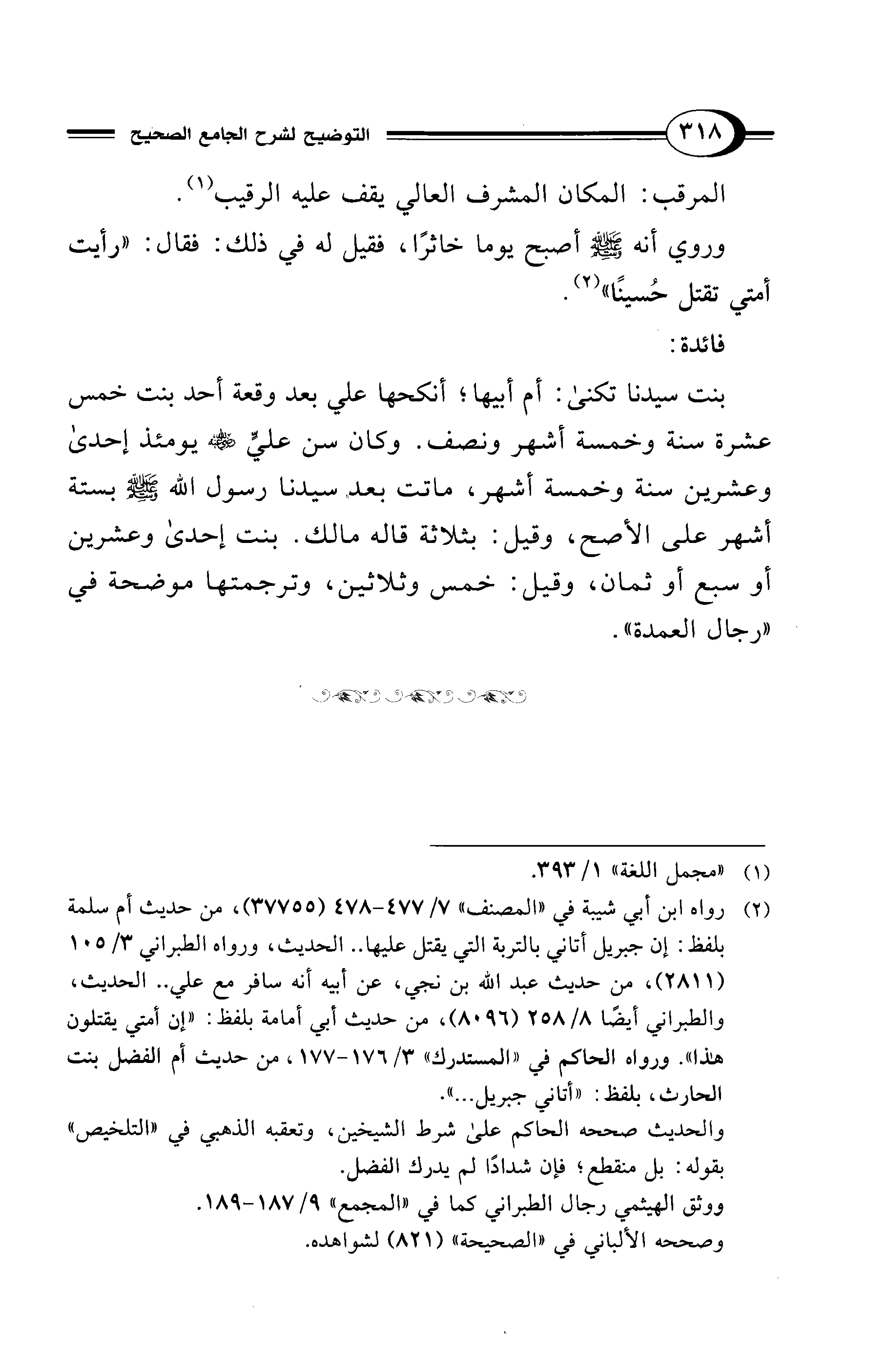 بنت سيدنا تكنى: أم أبيها؛ أنكحها على بعد وقعة أحد بنت خمس عشرة سنة وخمسة أشهر ونصف. وكان سن عليٍّ - رضي الله عنه - يومئذ إحدى وعشرين سنة وخمسة أشهر، ماتت بعد سيدنا رسول الله - صلى الله عليه وسلم - بستة أشهر على الأصح، وقيل: بثلاثة قاله مالك. بنت إحدى وعشرين أو سبع أو ثمان، وقيل: خمس وثلاثين، وترجمتها موضحة في دارجال العمدة".