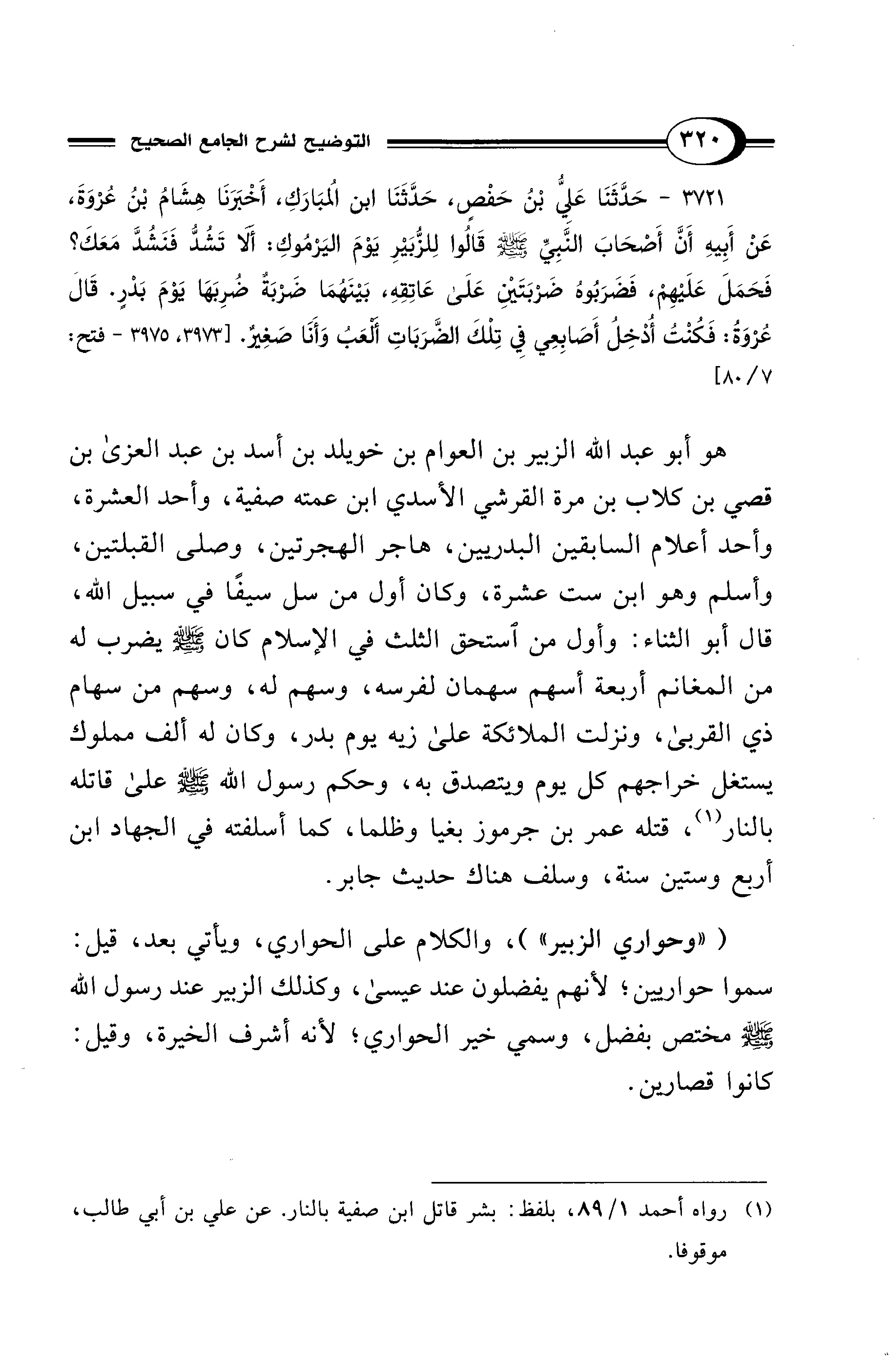 3721 - حَدَّثَنَا عَلِيُّ بْنُ حَفْصٍ, حَدَّثَنَا ابْنُ المُبَارَكِ, أَخْبَرَنَا هِشَامُ بْنُ عُرْوَةَ, عَنْ أَبِيهِ أَنَّ أَصْحَابَ النَّبِيِّ - صلى الله عليه وسلم - قَالُوا لِلزُّبَيْرِ يَوْمَ الْيَرْمُوكِ: أَلاَ تَشُدُّ فَنَشُدَّ مَعَكَ؟ فَحَمَلَ عَلَيْهِمْ، فَضَرَبُوهُ ضَرْبَتَيْنِ عَلَى عَاتِقِهِ، بَيْنَهُمَا ضَرْبَةٌ ضُرِبَهَا يَوْمَ بَدْرٍ. قَالَ عُرْوَةُ: فَكُنْتُ أُدْخِلُ أَصَابِعِي فِي تِلْكَ الضَّرَبَاتِ أَلْعَبُ وَأَنَا صَغِيرٌ. [3973, 3975 - فتح: 7/ 80]