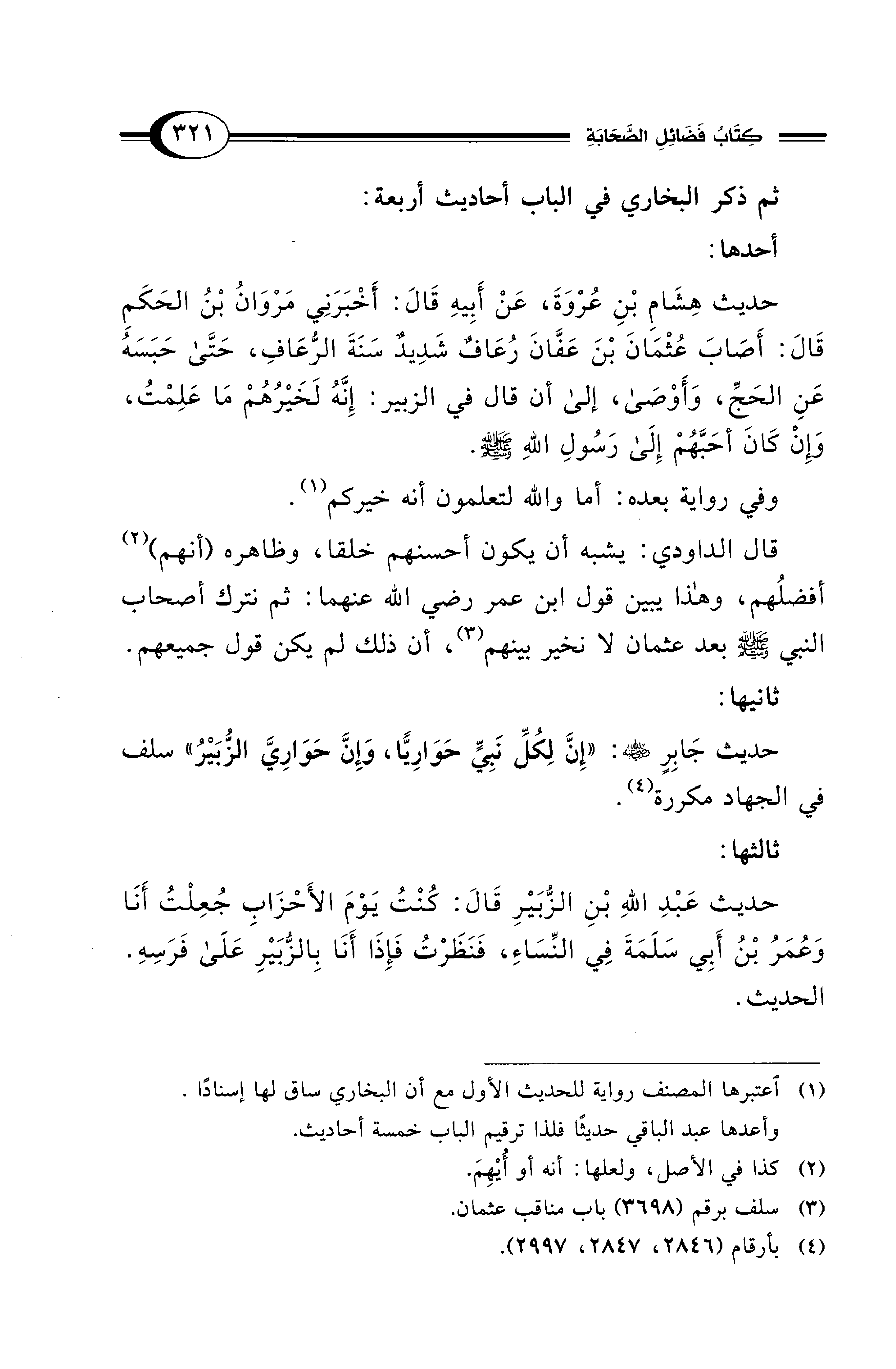 حديث هِشَامِ بْنِ عُرْوَةَ, عَنْ أَبِيهِ قَالَ: أَخْبَرَنِي مَرْوَانُ بْنُ الحَكَمِ قَالَ: أَصَابَ عُثْمَانَ بْنَ عَفَّانَ رُعَافٌ شَدِيدٌ سَنَةَ الرُّعَافِ، حَتَّى حَبَسَهُ عَنِ الْحَجِّ وَأَوْصَى، إلى أن قال في الزبير: إِنَّهُ لَخَيْرُهُمْ مَا عَلِمْتُ، وَإِنْ كَانَ لأَحَبَّهُمْ إِلَى رَسُولِ اللهِ - صلى الله عليه وسلم -.
