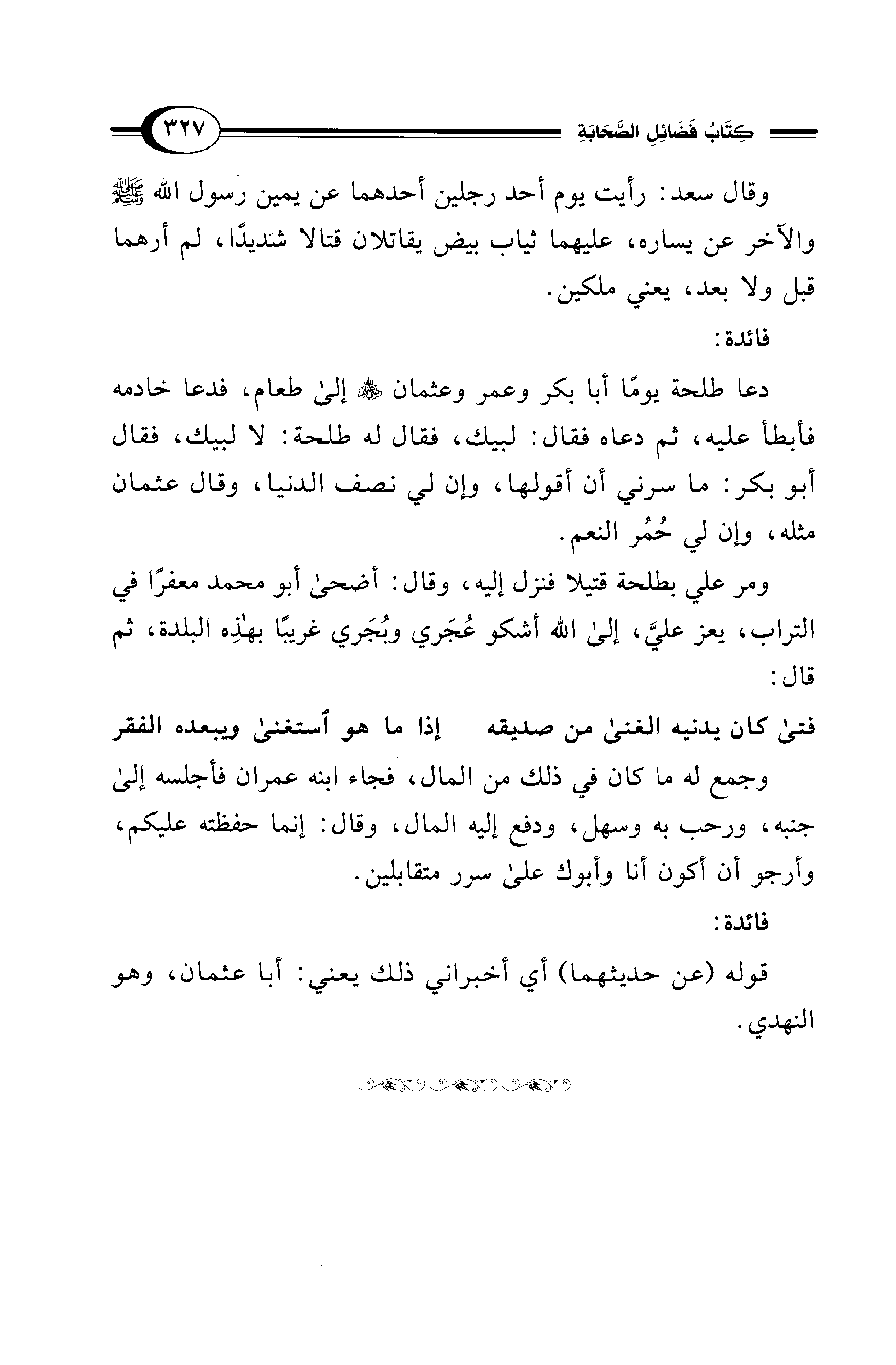 دعا طلحة يومًا أبا بكر وعمر وعثمان - رضي الله عنهم - إلى طعام، فدعا خادمه فأبطأ عليه، ثم دعاه فقال: لبيك، فقال له طلحة: لا لبيك، فقال أبو بكر: ما سرني أن أقولها، وإن لي نصف الدنيا، وقال عثمان مثله، وإن لي حُمُر النعم.