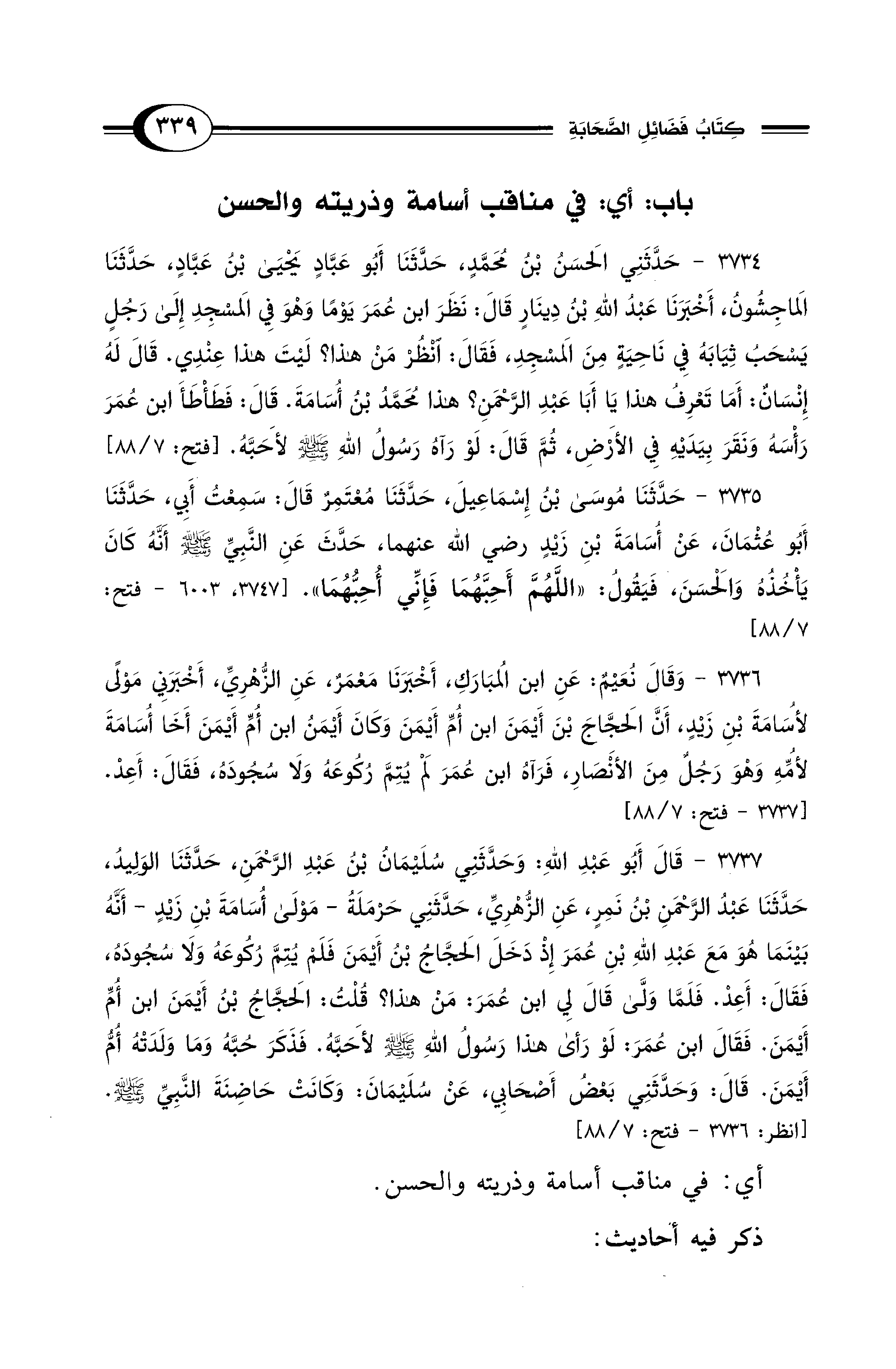 3735 - حَدَّثَنَا مُوسَى بْنُ إِسْمَاعِيلَ, حَدَّثَنَا مُعْتَمِرٌ قَالَ: سَمِعْتُ أَبِي, حَدَّثَنَا أَبُو عُثْمَانَ, عَنْ أُسَامَةَ بْنِ زَيْدٍ - رضي الله عنهما -, حَدَّثَ عَنِ النَّبِيِّ - صلى الله عليه وسلم - أَنَّهُ كَانَ يَأْخُذُهُ وَالْحَسَنَ, فَيَقُولُ: «اللَّهُمَّ أَحِبَّهُمَا فَإِنِّي أُحِبُّهُمَا». [3747, 6003 - فتح: 7/ 88]