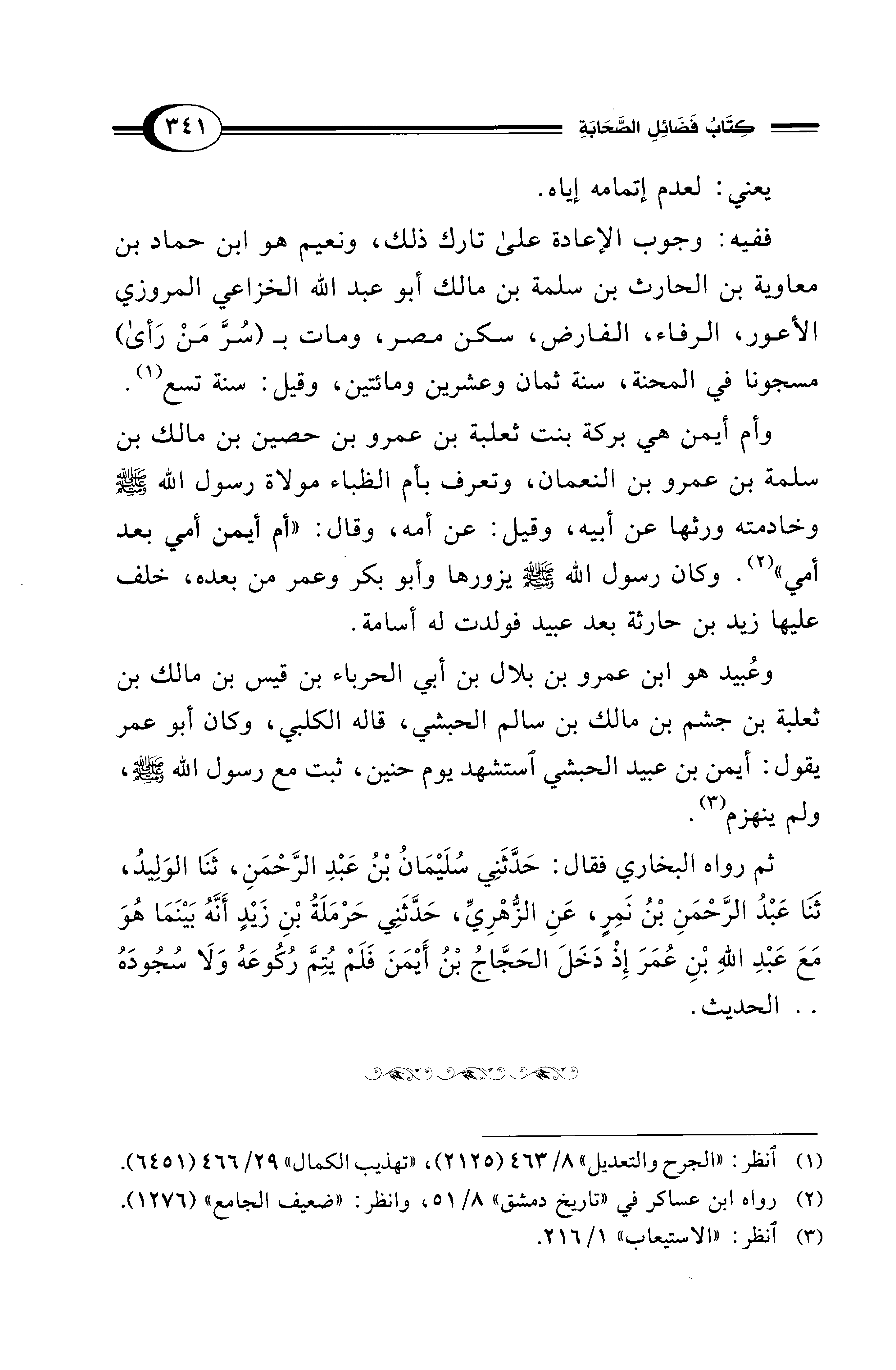ثم رواه البخاري فقال: حَدَّثَنِي سُلَيْمَانُ بْنُ عَبْدِ الرَّحْمَنِ, حَدَّثَنَا الوَلِيدُ, حَدَّثَنَا عَبْدُ الرَّحْمَنِ بْنُ نَمِرٍ, عَنِ الزُّهْرِيِّ, حَدَّثَنِي حَرْمَلَةُ بْنِ زَيْدٍ أَنَّهُ بَيْنَمَا هُوَ مَعَ عَبْدِ اللهِ بْنِ عُمَرَ إِذْ دَخَلَ الحَجَّاجُ بْنُ أَيْمَنَ فَلَمْ يُتِمَّ رُكُوعَهُ وَلاَ سُجُودَهُ .. الحديث.