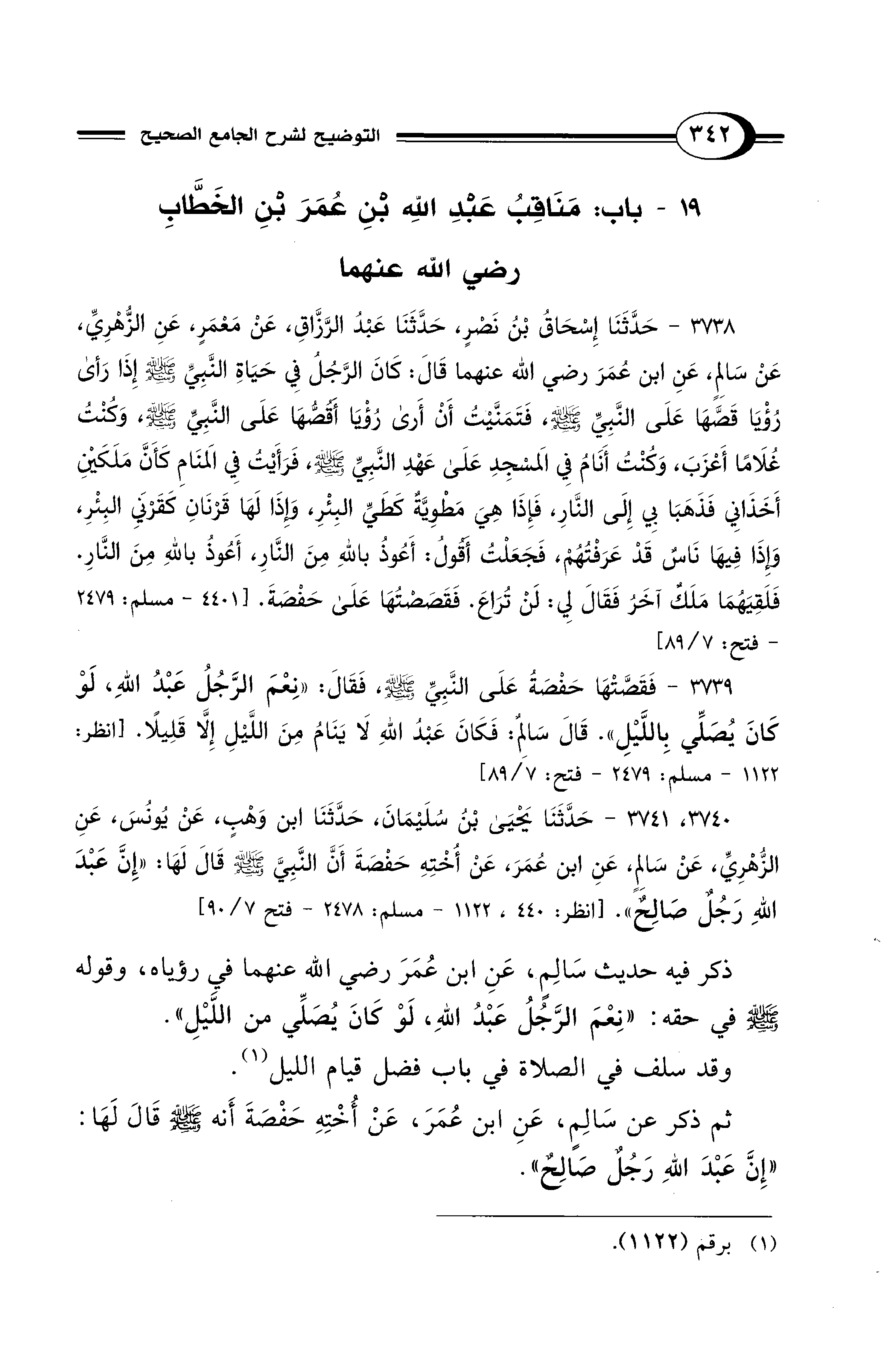 3739 - فَقَصَّتْهَا حَفْصَةُ عَلَى النَّبِيِّ - صلى الله عليه وسلم -, فَقَالَ: «نِعْمَ الرَّجُلُ عَبْدُ اللهِ، لَوْ كَانَ يُصَلِّي بِاللَّيْلِ». قَالَ سَالِمٌ: فَكَانَ عَبْدُ اللهِ لاَ يَنَامُ مِنَ اللَّيْلِ إِلاَّ قَلِيلاً. [انظر: 1122 - مسلم: 2479 - فتح: 7/ 89]