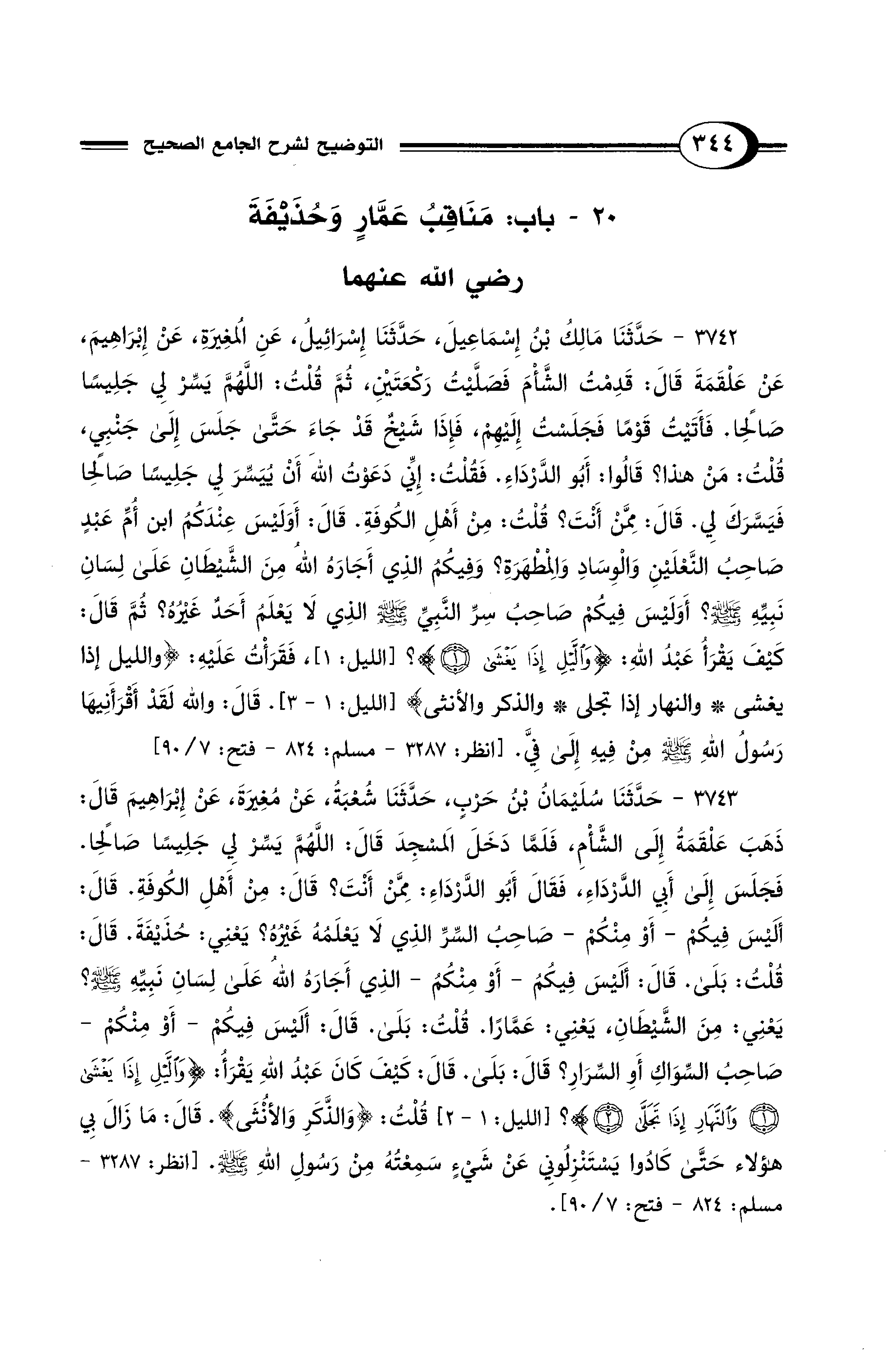 3742 - حَدَّثَنَا مَالِكُ بْنُ إِسْمَاعِيلَ, حَدَّثَنَا إِسْرَائِيلُ, عَنِ المُغِيرَةِ, عَنْ إِبْرَاهِيمَ, عَنْ عَلْقَمَةَ، قَالَ: قَدِمْتُ الشَّأْمَ فَصَلَّيْتُ رَكْعَتَيْنِ، ثُمَّ قُلْتُ: اللَّهُمَّ يَسِّرْ لِي جَلِيسًا صَالِحًا، فَأَتَيْتُ قَوْمًا فَجَلَسْتُ إِلَيْهِمْ، فَإِذَا شَيْخٌ قَدْ جَاءَ حَتَّى جَلَسَ إِلَى جَنْبِي، قُلْتُ: مَنْ هَذَا؟ قَالُوا: أَبُو الدَّرْدَاءِ. فَقُلْتُ: إِنِّي دَعَوْتُ اللهَ أَنْ يُيَسِّرَ لِي جَلِيسًا صَالِحًا فَيَسَّرَكَ لِي، قَالَ: مِمَّنْ أَنْتَ؟ قُلْتُ: مِنْ أَهْلِ الْكُوفَةِ. قَالَ: أَوَلَيْسَ عِنْدَكُمُ ابْنُ أُمِّ عَبْدٍ صَاحِبُ النَّعْلَيْنِ وَالْوِسَادِ وَالْمِطْهَرَةِ؟ وَفِيكُمُ الَّذِى أَجَارَهُ اللهُ مِنَ الشَّيْطَانِ عَلَى لِسَانِ نَبِيِّهِ - صلى الله عليه وسلم -؟ أَوَلَيْسَ فِيكُمْ صَاحِبُ سِرِّ النَّبِيِّ - صلى الله عليه وسلم - الذِي لاَ يَعْلَمُ أَحَدٌ غَيْرُهُ؟ ثُمَّ قَالَ: كَيْفَ يَقْرَأُ عَبْدُ اللهِ: {وَاللَّيْلِ إِذَا يَغْشَى (1)}؟ [الليل: 1]، فَقَرَأْتُ عَلَيْهِ: {وَاللَّيْلِ إِذَا يَغْشَى (1) وَالنَّهَارِ إِذَا تَجَلَّى (2) وَالذَّكَرَ وَالْأُنْثَى} [الليل: 1 - 3]. قَالَ: وَاللهِ لَقَدْ أَقْرَأَنِيهَا رَسُولُ اللهِ - صلى الله عليه وسلم - مِنْ فِيهِ إِلَى فِيَّ. [انظر: 3287, 1122 - مسلم: 824 - فتح: 7/ 90]