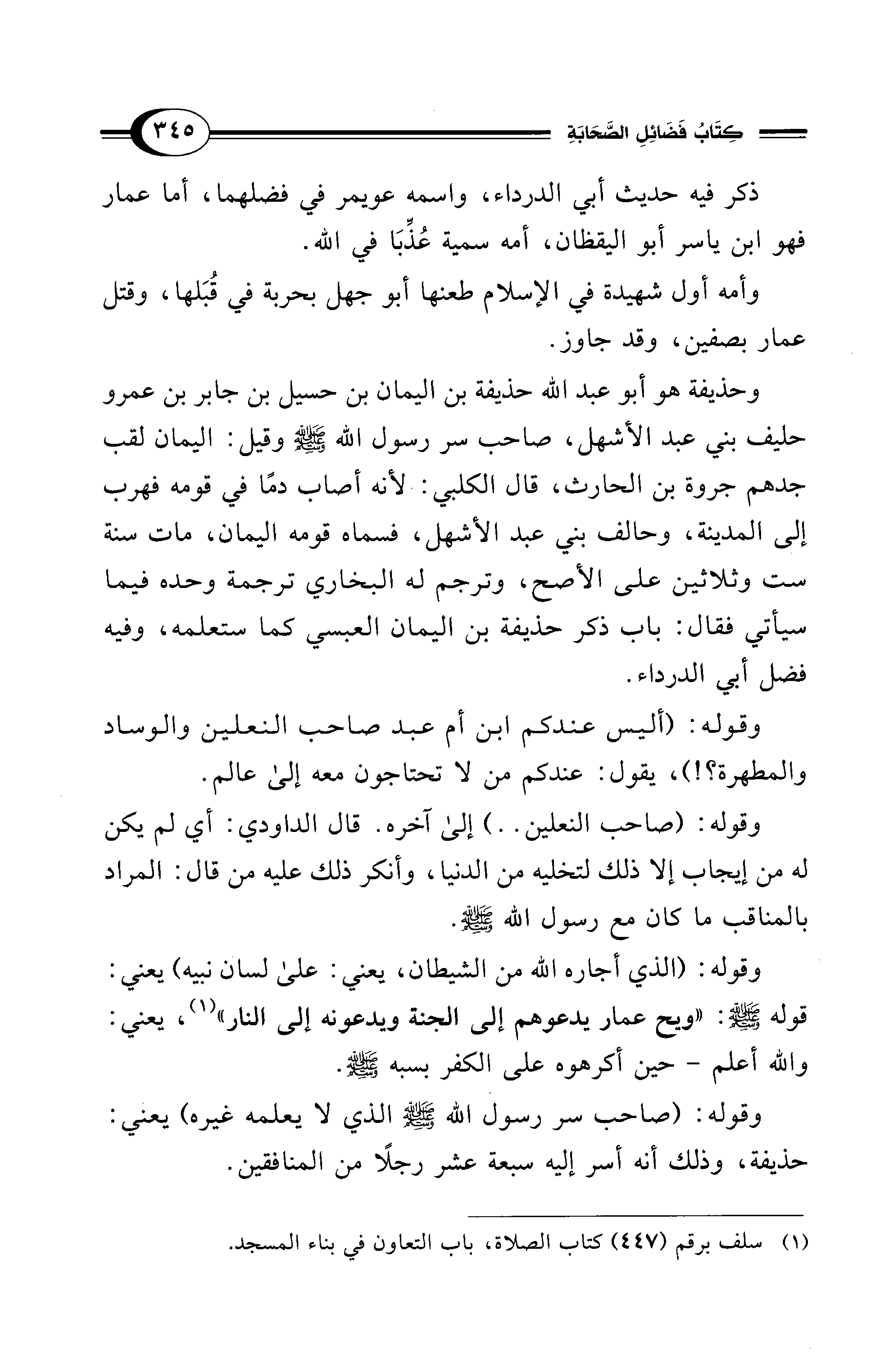 ذكر فيه حديث أبي الدرداء، واسمه عويمر في فضلهما، أما عمار فهو ابن ياسر أبو اليقظان، أمه سمية عُذِّبَا في الله.
