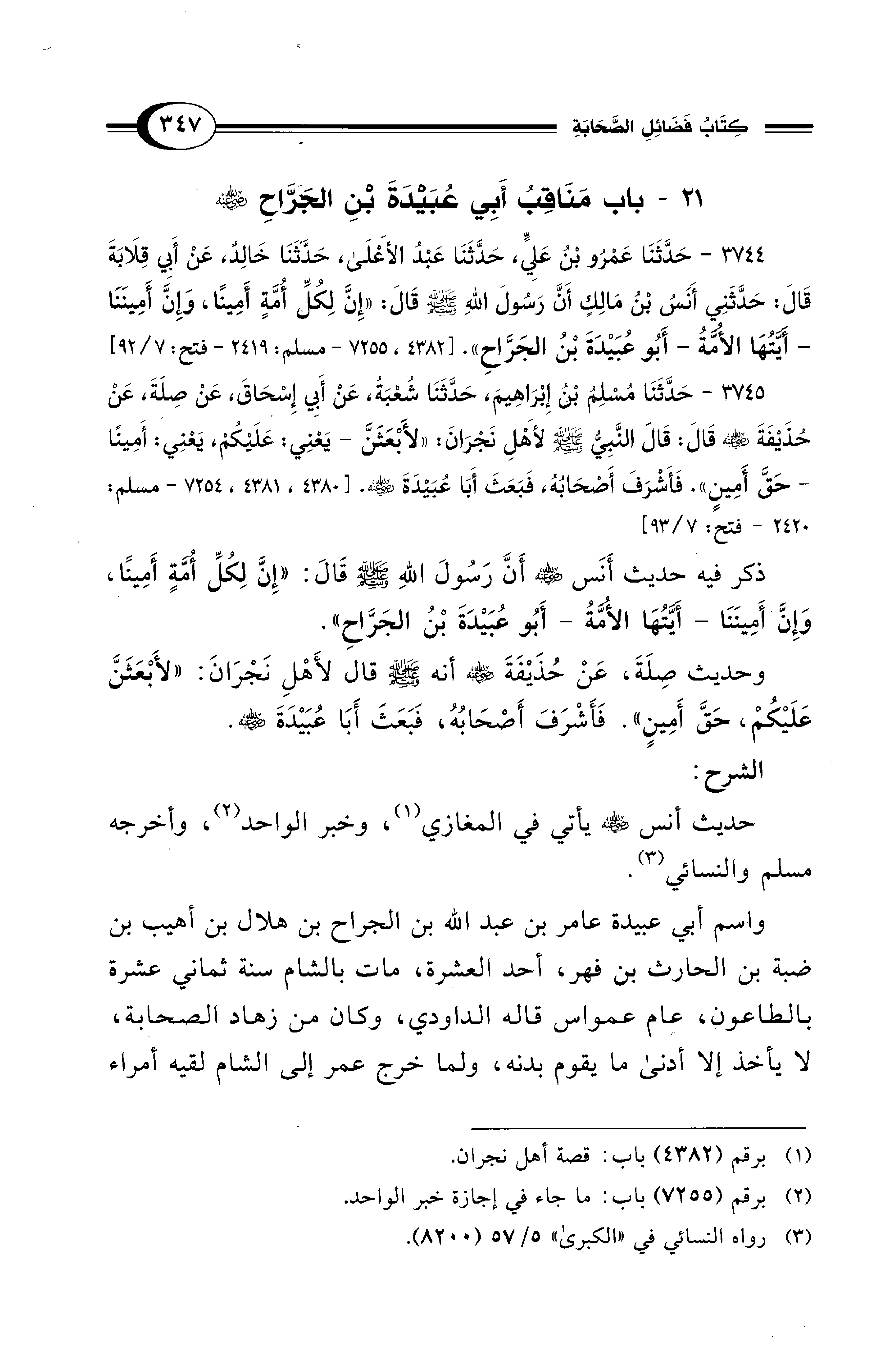 3744 - حَدَّثَنَا عَمْرُو بْنُ عَلِيٍّ, حَدَّثَنَا عَبْدُ الأَعْلَى, حَدَّثَنَا خَالِدٌ, عَنْ أَبِي قِلاَبَةَ قَالَ: حَدَّثَنِي أَنَسُ بْنُ مَالِكٍ أَنَّ رَسُولَ اللهِ - صلى الله عليه وسلم - قَالَ: «إِنَّ لِكُلِّ أُمَّةٍ أَمِينًا، وَإِنَّ أَمِينَنَا -أَيَّتُهَا الأُمَّةُ- أَبُو عُبَيْدَةَ بْنُ الجَرَّاحِ». [4382, 7255 - مسلم: 2419 - فتح: 7/ 92]