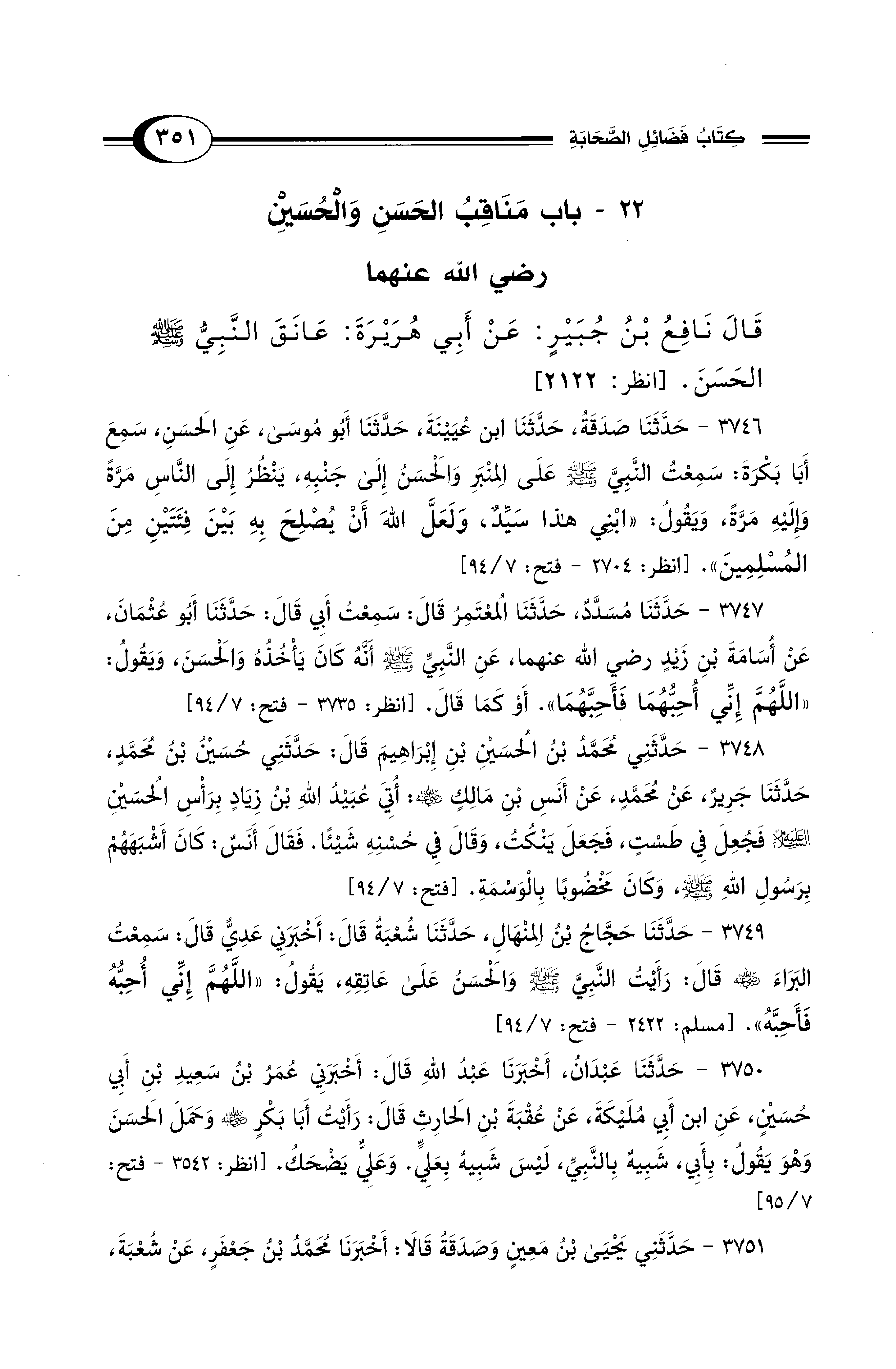 3747 - حَدَّثَنَا مُسَدَّدٌ, حَدَّثَنَا المُعْتَمِرُ قَالَ: سَمِعْتُ أَبِي قَالَ: حَدَّثَنَا أَبُو عُثْمَانَ عَنْ أُسَامَةَ بْنِ زَيْدٍ - رضي الله عنهما -, عَنِ النَّبِيِّ - صلى الله عليه وسلم - أَنَّهُ كَانَ يَأْخُذُهُ وَالْحَسَنَ, وَيَقُولُ: «اللَّهُمَّ إِنِّى أُحِبُّهُمَا فَأَحِبَّهُمَا». أَوْ كَمَا قَالَ. [انظر: 3735 - فتح: 7/ 94]