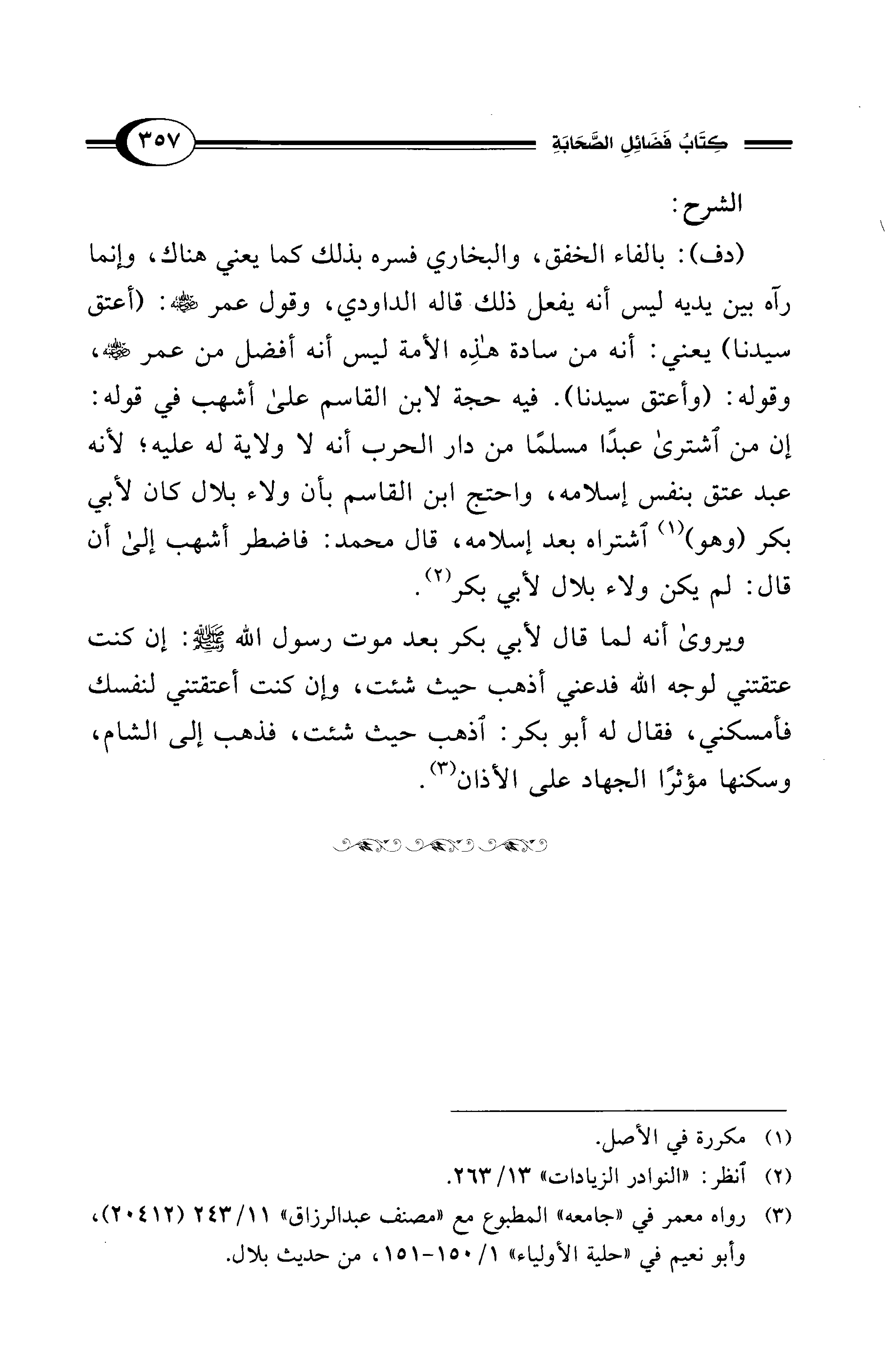 (دف): بالفاء الخفق، والبخاري فسره بذلك كما يعني هناك، وإنما رآه بين يديه ليس أنه يفعل ذلك قاله الداودي، وقول عمر - رضي الله عنه -: (أعتق سيدنا) يعني: أنه من سادة هذِه الأمة ليس أنه أفضل من عمر - رضي الله عنه -، وقوله: (وأعتق سيدنا). فيه حجة لابن القاسم على أشهب في قوله: إن من اشترى عبدًا مسلمًا من دار الحرب أنه لا ولاية له عليه؛ لأنه عبد عتق بنفس إسلامه، واحتج ابن القاسم بأن ولاء بلال كان لأبي بكر (وهو) (¬1) اشتراه بعد إسلامه، قال محمد: فاضطر أشهب إلى أن قال: لم يكن ولاء بلال لأبي بكر (¬2).