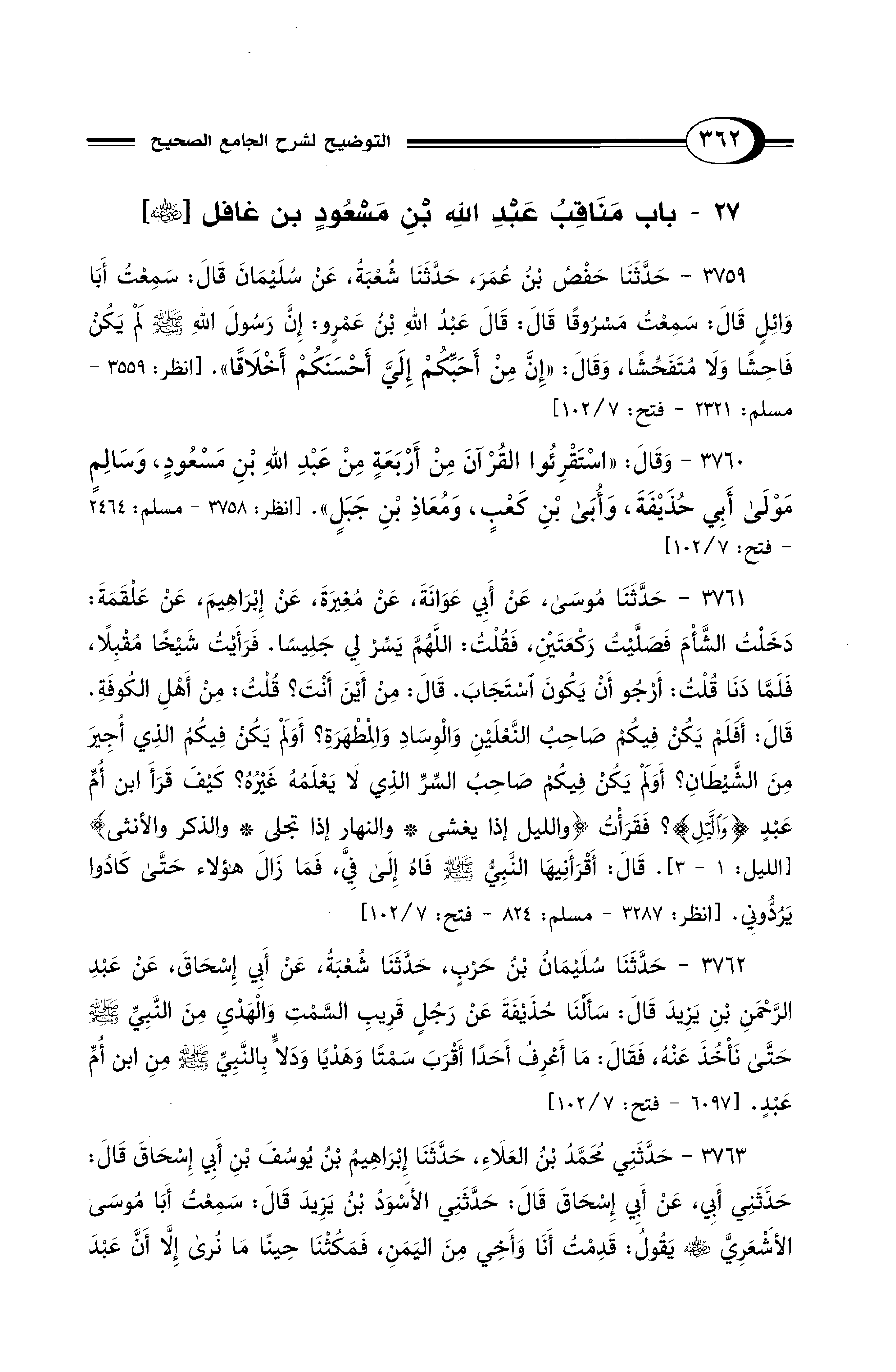 3761 - حَدَّثَنَا مُوسَى عَنْ أَبِي عَوَانَةَ, عَنْ مُغِيرَةَ, عَنْ إِبْرَاهِيمَ, عَنْ عَلْقَمَةَ: دَخَلْتُ الشَّأْمَ فَصَلَّيْتُ رَكْعَتَيْنِ، فَقُلْتُ: اللَّهُمَّ يَسِّرْ لِي جَلِيسًا. فَرَأَيْتُ شَيْخًا مُقْبِلاً، فَلَمَّا دَنَا قُلْتُ: أَرْجُو أَنْ يَكُونَ اسْتَجَابَ. قَالَ: مِنْ أَيْنَ أَنْتَ؟ قُلْتُ: مِنْ أَهْلِ الكُوفَةِ. قَالَ: أَفَلَمْ يَكُنْ فِيكُمْ صَاحِبُ النَّعْلَيْنِ وَالْوِسَادِ وَالْمِطْهَرَةِ؟ أَوَلَمْ يَكُنْ فِيكُمُ الَّذِى أُجِيرَ مِنَ الشَّيْطَانِ؟ أَوَلَمْ يَكُنْ فِيكُمْ صَاحِبُ السِّرِّ الَّذِى لاَ يَعْلَمُهُ غَيْرُهُ؟ كَيْفَ قَرَأَ ابْنُ أُمِّ عَبْدٍ {وَاللَّيْلِ}؟ فَقَرَأْتُ {وَاللَّيْلِ إِذَا يَغْشَى (1) وَالنَّهَارِ إِذَا تَجَلَّى (2) وَالذَّكَرَ وَالْأُنْثَى} [الليل: 1 - 3]. قَالَ: أَقْرَأَنِيهَا النَّبِيُّ - صلى الله عليه وسلم - فَاهُ إِلَى فِيَّ، فَمَا زَالَ هَؤُلاَءِ حَتَّى كَادُوا يَرُدُّونِي. [انظر: 3758 - مسلم: 824 - فتح: 7/ 102]