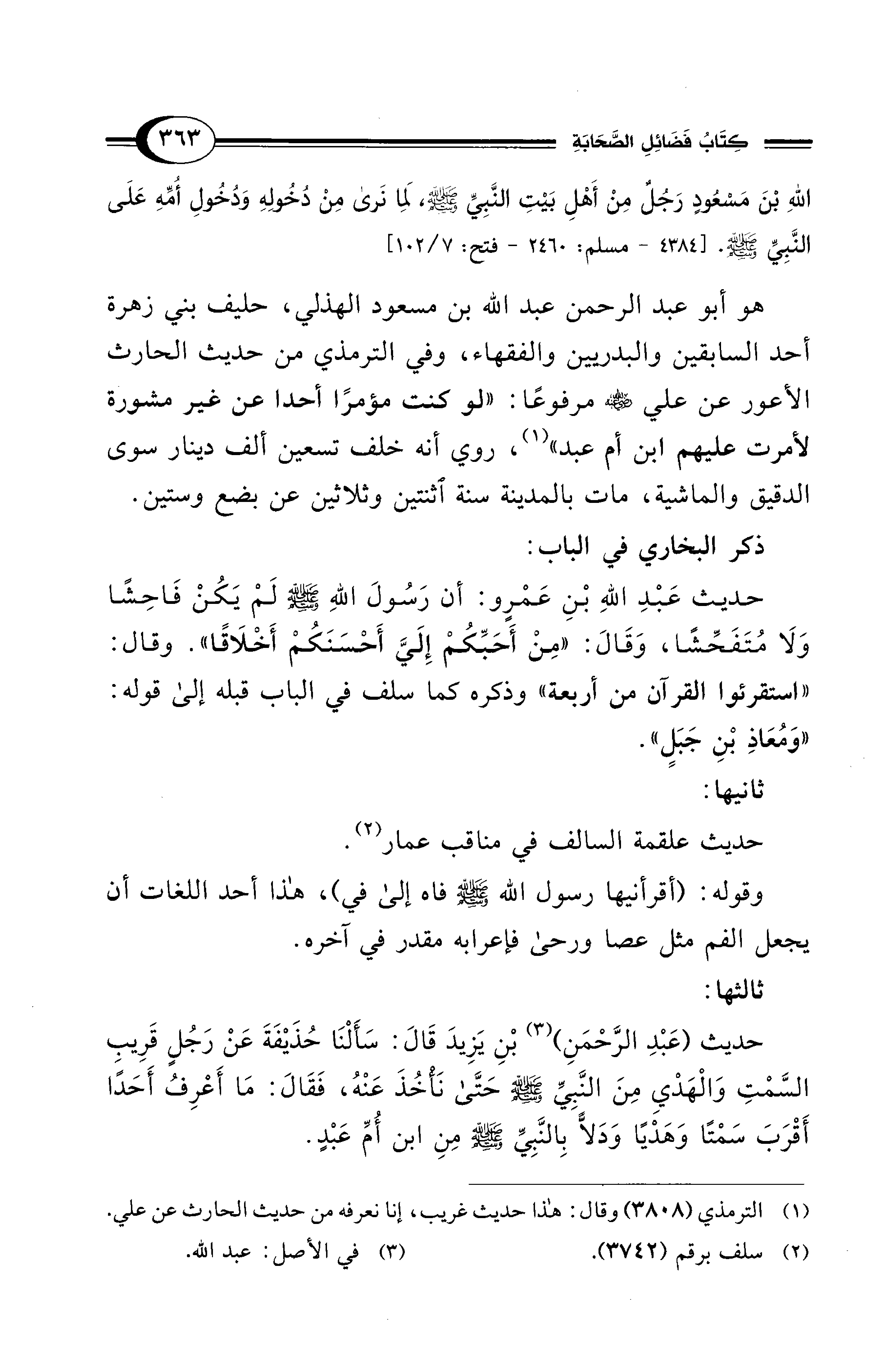 اللهِ بْنَ مَسْعُودٍ رَجُلٌ مِنْ أَهْلِ بَيْتِ النَّبِيِّ - صلى الله عليه وسلم -، لِمَا نَرَى مِنْ دُخُولِهِ وَدُخُولِ أُمِّهِ عَلَى النَّبِيِّ - صلى الله عليه وسلم -. [4384 - مسلم: 2460 - فتح: 7/ 102]