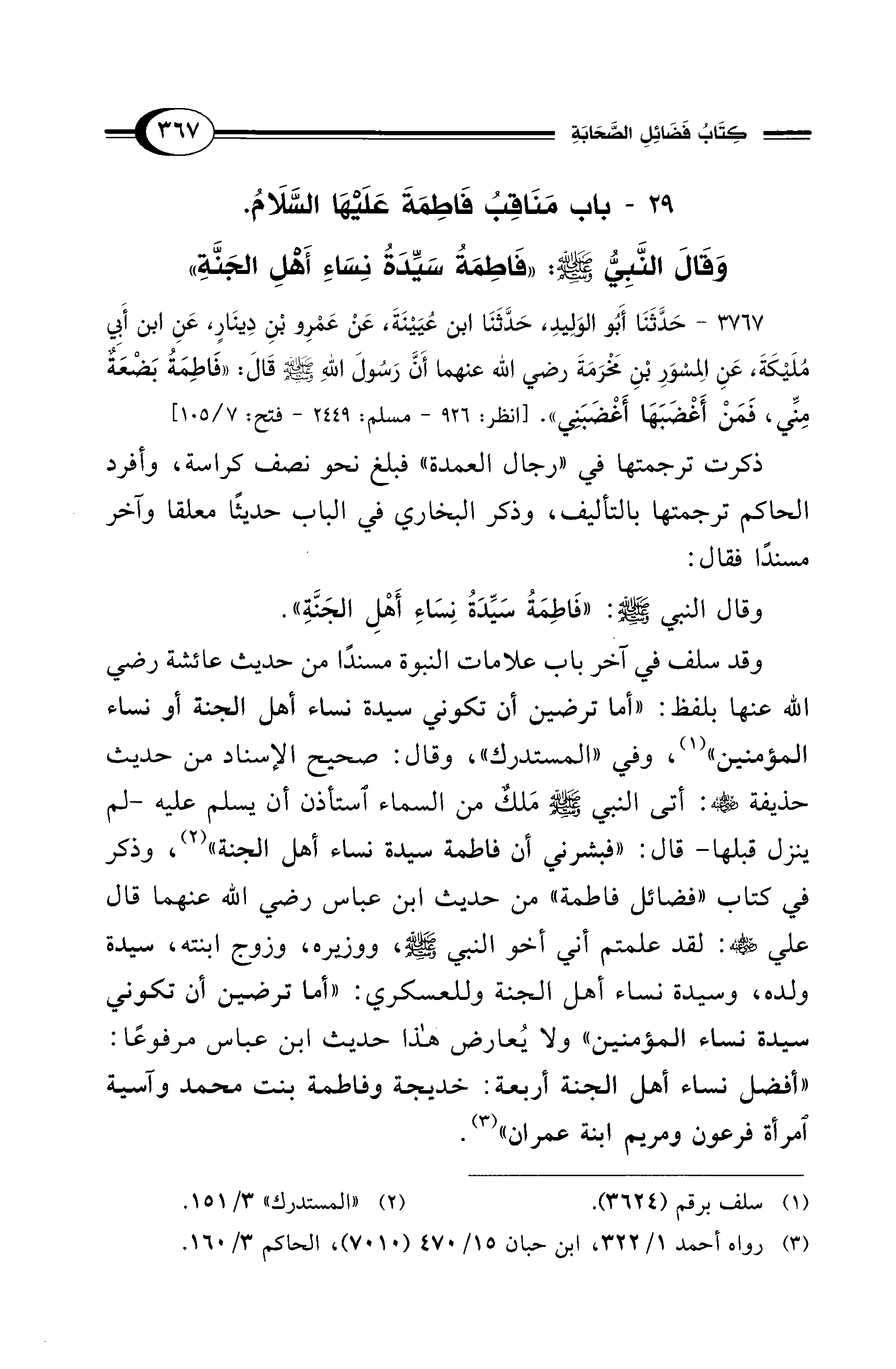 29 - باب مَنَاقِبُ فَاطِمَةَ - عَلَيْهَا السَّلاَمُ -. وَقَالَ النَّبِيُّ - صلى الله عليه وسلم -: «فَاطِمَةُ سَيِّدَةُ نِسَاءِ أَهْلِ الجَنَّةِ»