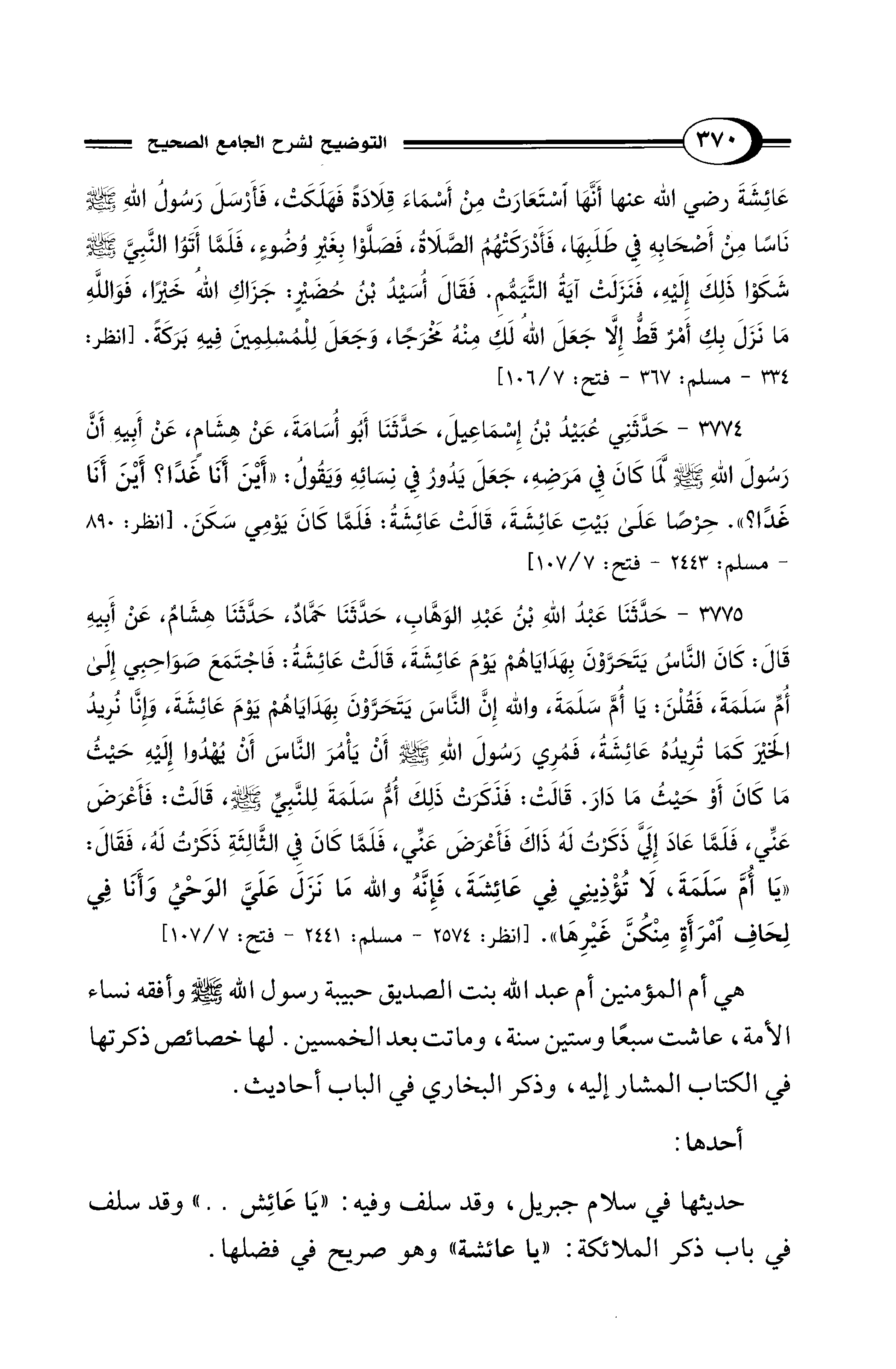3775 - حَدَّثَنَا عَبْدُ اللهِ بْنُ عَبْدِ الوَهَّابِ, حَدَّثَنَا حَمَّادٌ, حَدَّثَنَا هِشَامٌ, عَنْ أَبِيهِ، قَالَ: كَانَ النَّاسُ يَتَحَرَّوْنَ بِهَدَايَاهُمْ يَوْمَ عَائِشَةَ, قَالَتْ عَائِشَةُ: فَاجْتَمَعَ صَوَاحِبِي إِلَى أُمِّ سَلَمَةَ، فَقُلْنَ يَا أُمَّ سَلَمَةَ، وَاللهِ إِنَّ النَّاسَ يَتَحَرَّوْنَ بِهَدَايَاهُمْ يَوْمَ عَائِشَةَ، وَإِنَّا نُرِيدُ الخَيْرَ كَمَا تُرِيدُهُ عَائِشَةُ، فَمُرِي رَسُولَ اللهِ - صلى الله عليه وسلم - أَنْ يَأْمُرَ النَّاسَ أَنْ يُهْدُوا إِلَيْهِ حَيْثُ مَا كَانَ أَوْ حَيْثُ مَا دَارَ، قَالَتْ: فَذَكَرَتْ ذَلِكَ أُمُّ سَلَمَةَ لِلنَّبِيٍّ - صلى الله عليه وسلم -, قَالَتْ: فَأَعْرَضَ عَنِّي، فَلَمَّا عَادَ إِلَيَّ ذَكَرْتُ لَهُ ذَاكَ فَأَعْرَضَ عَنِّي، فَلَمَّا كَانَ فِي الثَّالِثَةِ ذَكَرْتُ لَهُ, فَقَالَ: «يَا أُمَّ سَلَمَةَ لاَ تُؤْذِينِي فِي عَائِشَةَ، فَإِنَّهُ وَاللهِ مَا نَزَلَ عَلَيَّ الوَحْيُ وَأَنَا فِي لِحَافِ امْرَأَةٍ مِنْكُنَّ غَيْرِهَا». [انظر: 2574 - مسلم: 2441 - فتح: 7/ 107]