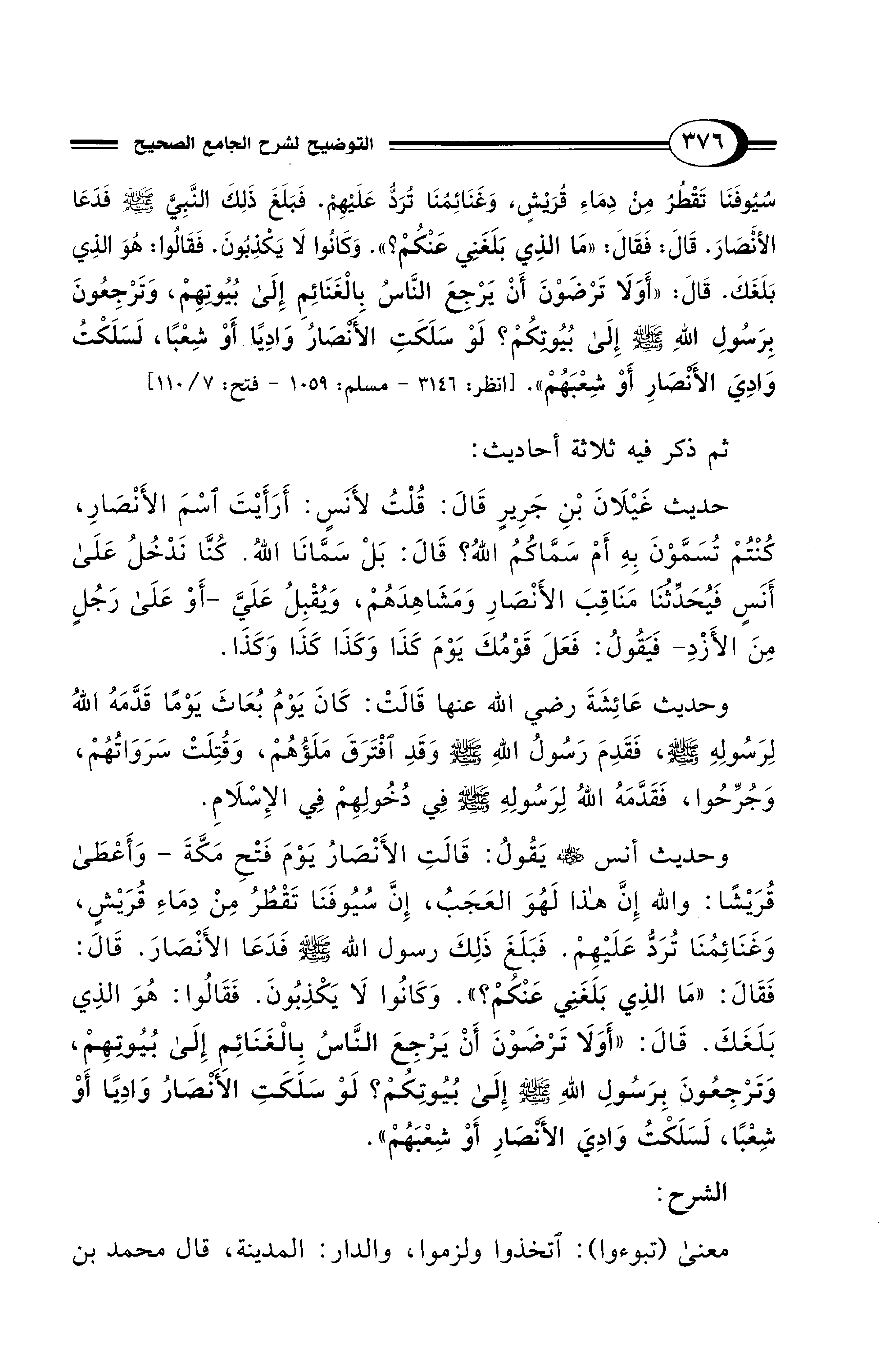 أَنَسًا - رضي الله عنه - يَقُولُ: قَالَتِ الأَنْصَارُ يَوْمَ فَتْحِ مَكَّةَ - وَأَعْطَى قُرَيْشًا: وَاللهِ إِنَّ هَذَا لَهُوَ العَجَبُ، إِنَّ سُيُوفَنَا تَقْطُرُ مِنْ دِمَاءِ قُرَيْشٍ، وَغَنَائِمُنَا تُرَدُّ عَلَيْهِمْ. فَبَلَغَ ذَلِكَ النَّبِيَّ - صلى الله عليه وسلم - فَدَعَا الأَنْصَارَ. قَالَ: فَقَالَ «مَا الَّذِى بَلَغَنِي عَنْكُمْ؟». وَكَانُوا لاَ يَكْذِبُونَ. فَقَالُوا: هُوَ الَّذِي بَلَغَكَ. قَالَ: «أَوَلاَ تَرْضَوْنَ أَنْ يَرْجِعَ النَّاسُ بِالْغَنَائِمِ إِلَى بُيُوتِهِمْ، وَتَرْجِعُونَ بِرَسُولِ اللهِ - صلى الله عليه وسلم - إِلَى بُيُوتِكُمْ؟ لَوْ سَلَكَتِ الأَنْصَارُ وَادِيًا أَوْ شِعْبًا، لَسَلَكْتُ وَادِيَ الأَنْصَارِ أَوْ شِعْبَهُمْ».