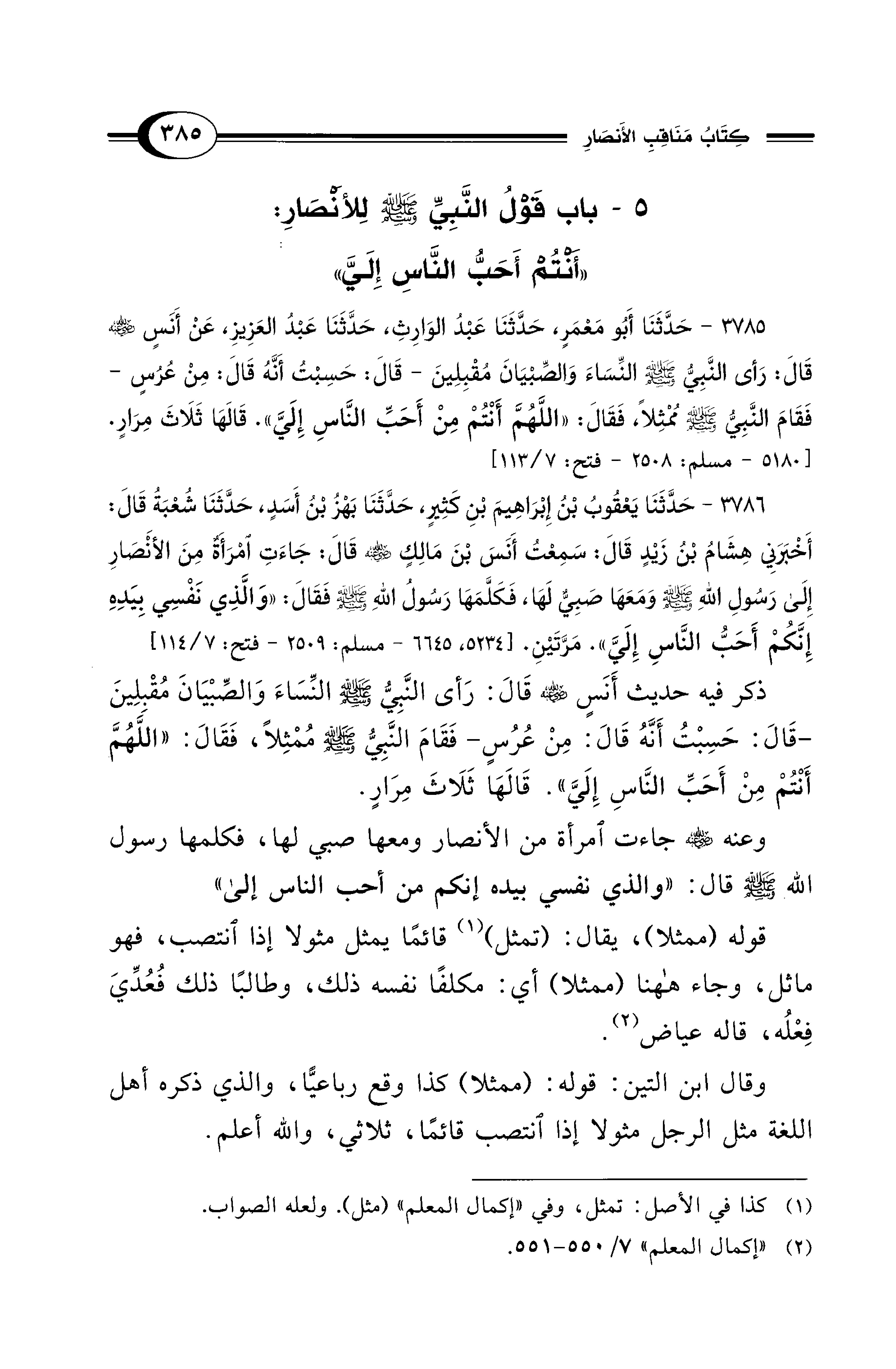 3785 - حَدَّثَنَا أَبُو مَعْمَرٍ, حَدَّثَنَا عَبْدُ الوَارِثِ, حَدَّثَنَا عَبْدُ العَزِيزِ, عَنْ أَنَسٍ - رضي الله عنه - قَالَ: رَأَى النَّبِيُّ - صلى الله عليه وسلم - النِّسَاءَ وَالصِّبْيَانَ مُقْبِلِينَ -قَالَ: حَسِبْتُ أَنَّهُ قَالَ مِنْ عُرُسٍ- فَقَامَ النَّبِيُّ - صلى الله عليه وسلم - مُمْثِلاً، فَقَالَ: «اللَّهُمَّ أَنْتُمْ مِنْ أَحَبِّ النَّاسِ إِلَيَّ». قَالَهَا ثَلاَثَ مِرَارٍ. [5180 - مسلم: 2508 - فتح: 7/ 113]