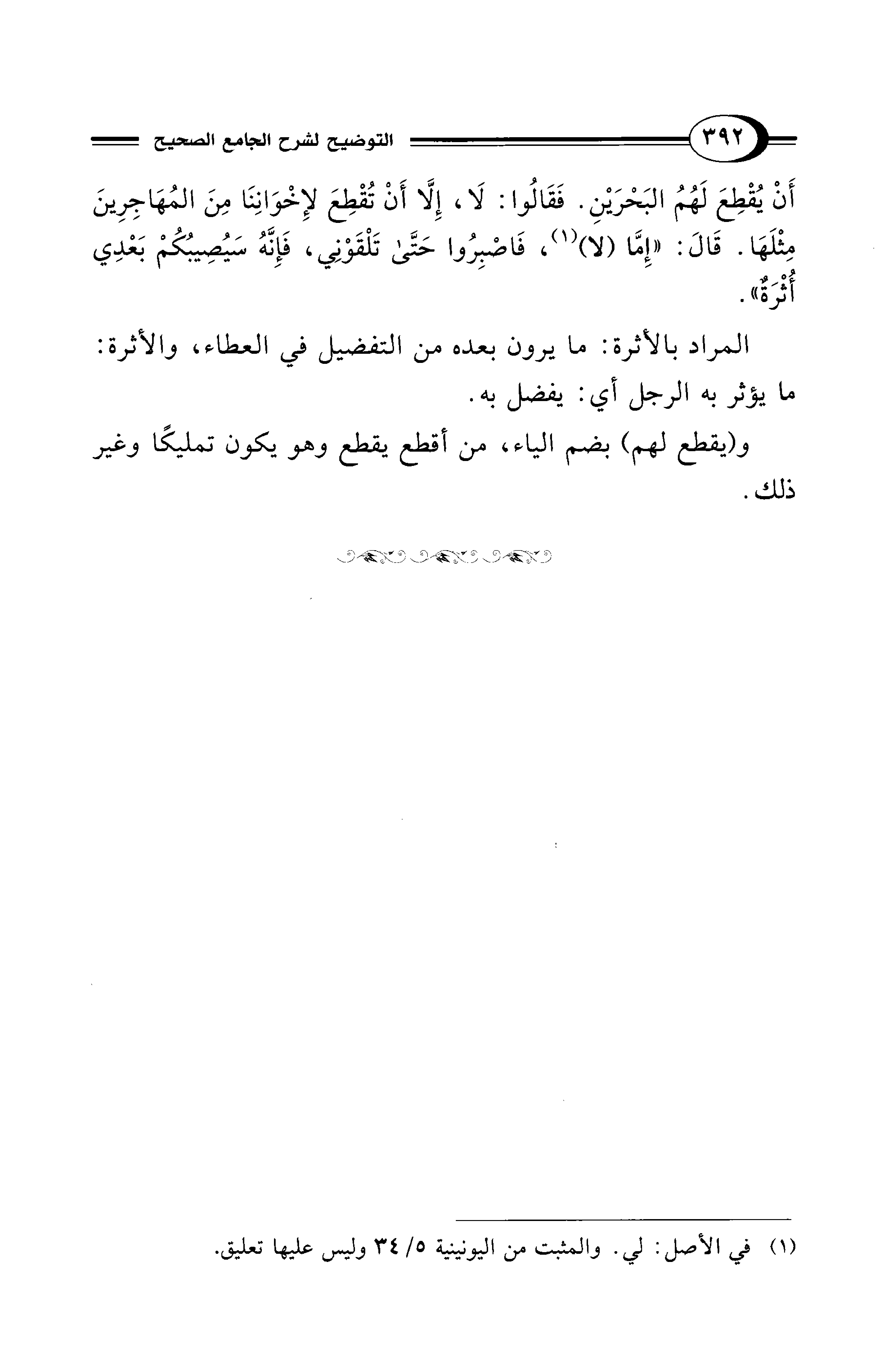 أَنْ يُقْطِعَ لَهُمُ البَحْرَيْنِ. فَقَالُوا: لَا، إِلَّا أَنْ تُقْطِعَ لإِخْوَانِنَا مِنَ المُهَاجِرِينَ مِثْلَهَا. قَالَ: "إِمَّا (لا) (¬1)، فَاصْبِرُوا حَتَّى تَلْقَوْنِي، فَإِنَّهُ سَيُصِيبُكُمْ بَعْدِي أُثْرَةٌ".