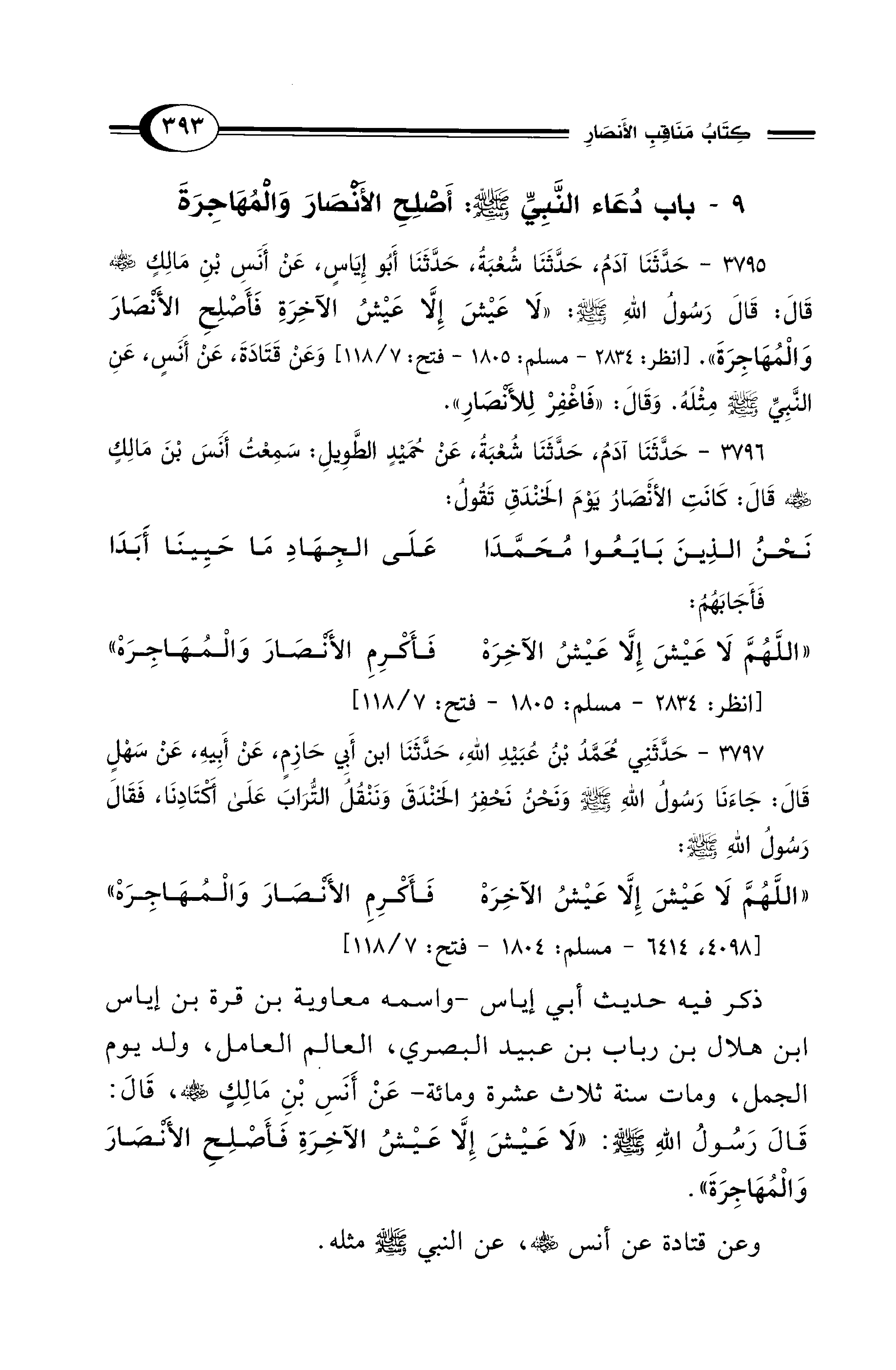 3795 - حَدَّثَنَا آدَمُ, حَدَّثَنَا شُعْبَةُ, حَدَّثَنَا أَبُو إِيَاسٍ, عَنْ أَنَسِ بْنِ مَالِكٍ - رضي الله عنه - قَالَ: قَالَ رَسُولُ اللهِ - صلى الله عليه وسلم -: «لاَ عَيْشَ إِلاَّ عَيْشُ الآخِرَةِ، فَأَصْلِحِ الأَنْصَارَ وَالْمُهَاجِرَةَ». [انظر: 2834 - مسلم: 1805 - فتح: 7/ 118] وَعَنْ قَتَادَةَ, عَنْ أَنَسٍ, عَنِ النَّبِيِّ - صلى الله عليه وسلم - مِثْلَهُ، وَقَالَ: "فَاغْفِرْ لِلأَنْصَارِ".