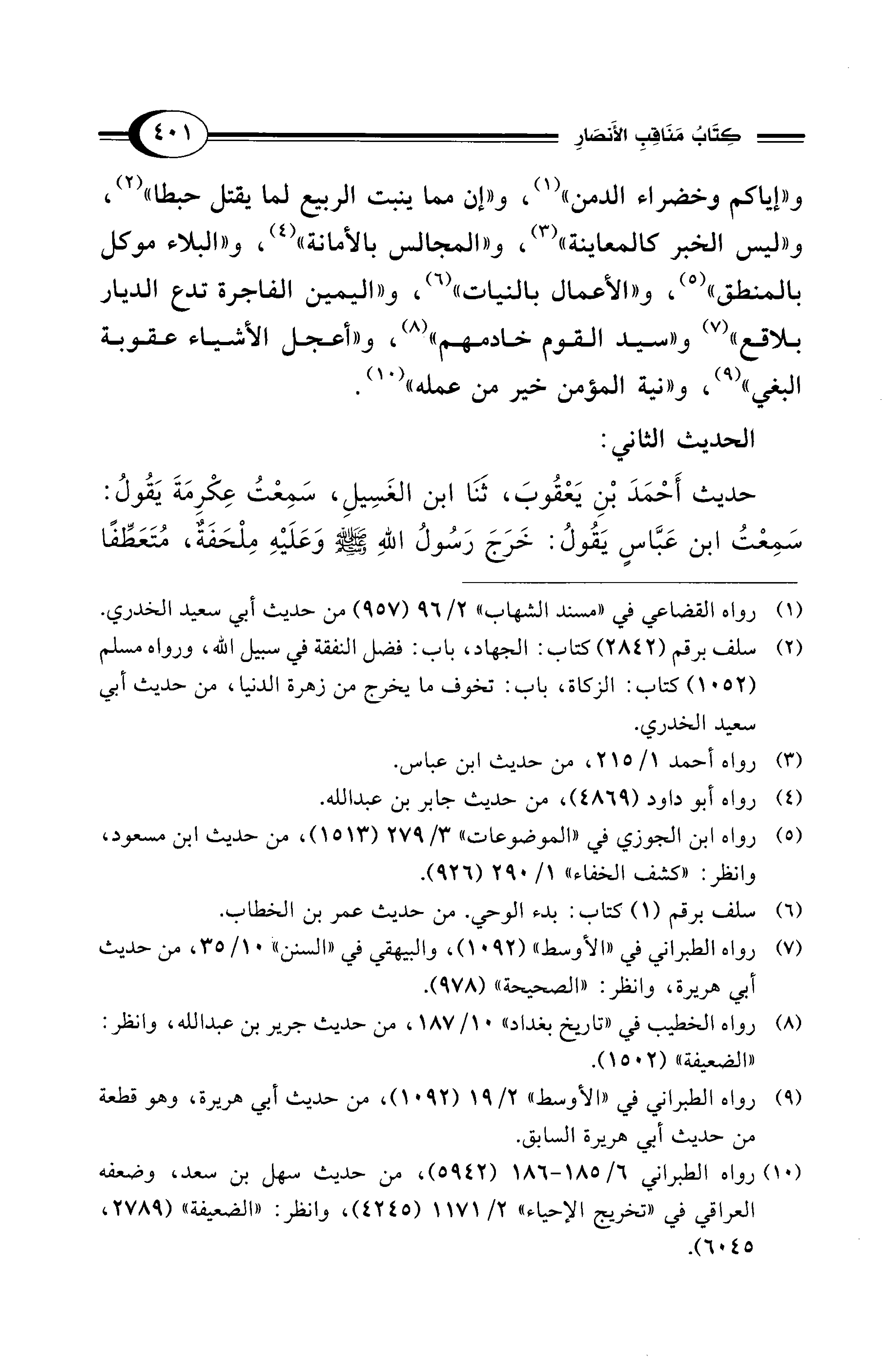 و"إياكم وخضراء الدمن" (¬1)، و"إن مما ينبت الربيع لما يقتل حبطا" (¬2)، و"ليس الخبر كالمعاينة " (¬3)، و"المجالس بالأمانة" (¬4)، و"البلاء موكل بالمنطق" (¬5)، و"الأعمال بالنيات" (¬6)، و"اليمين الفاجرة تدع الديار بلاقع" (¬7) و"سيد القوم خادمهم" [ضعيف] (¬8)، و"أعجل الأشياء عقوبة البغي" (¬9)، و"نية المؤمن خير من عمله" [ضعيف] (¬10).