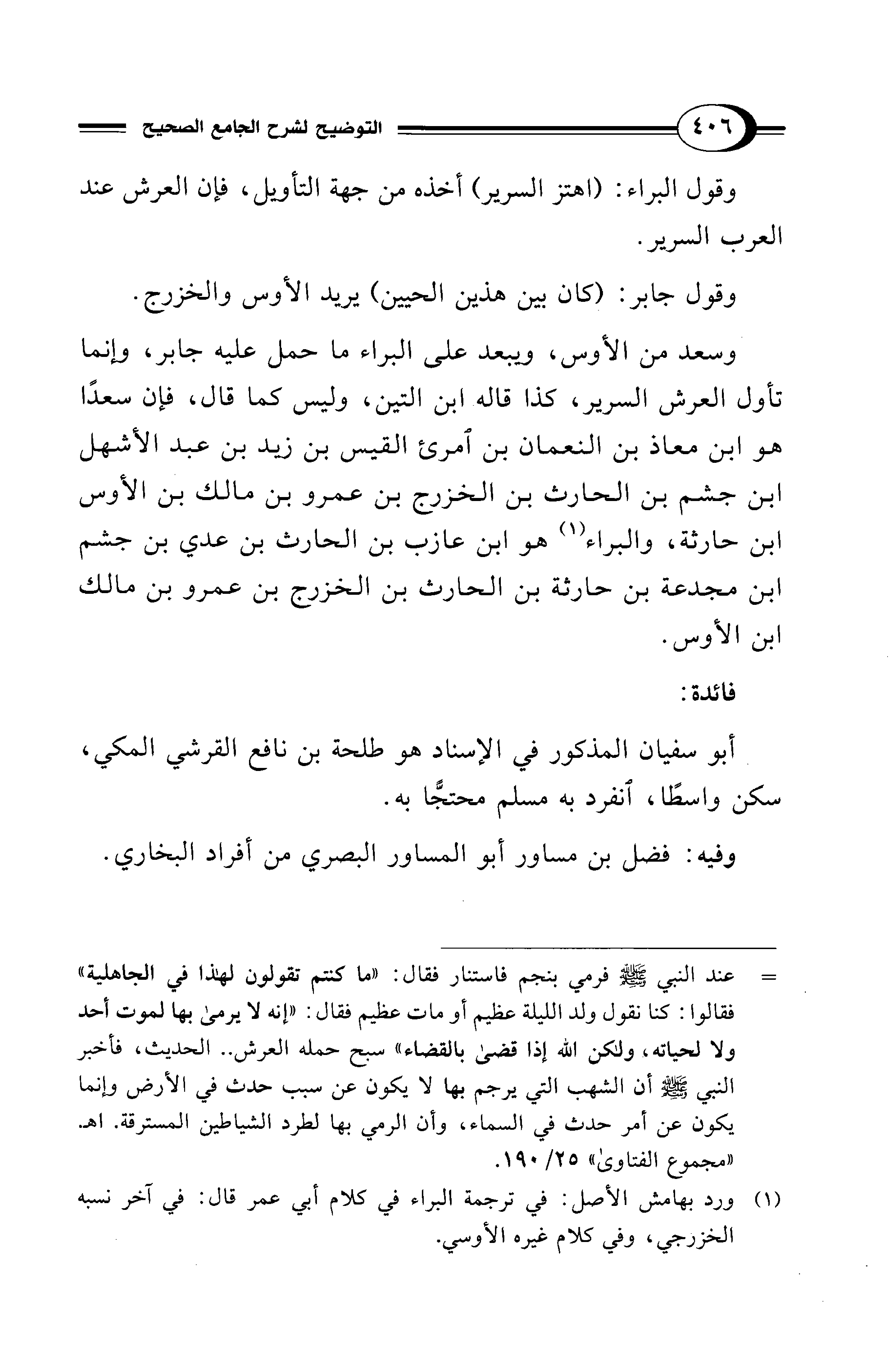وسعد من الأوس، ويبعد على البراء ما حمل عليه جابر، وإنما تأول العرش السرير، كذا قاله ابن التين، وليس كما قال، فإن سعدًا هو ابن معاذ بن النعمان بن امرئ القيس بن زيد بن عبد الأشهل ابن جشم بن الحارث بن الخزرج بن عمرو بن مالك بن الأوس ابن حارثة، والبراء (¬1) هو ابن عازب بن الحارث بن عدي بن جشم ابن مجدعة بن حارثة بن الحارث بن الخزرج بن عمرو بن مالك ابن الأوس.