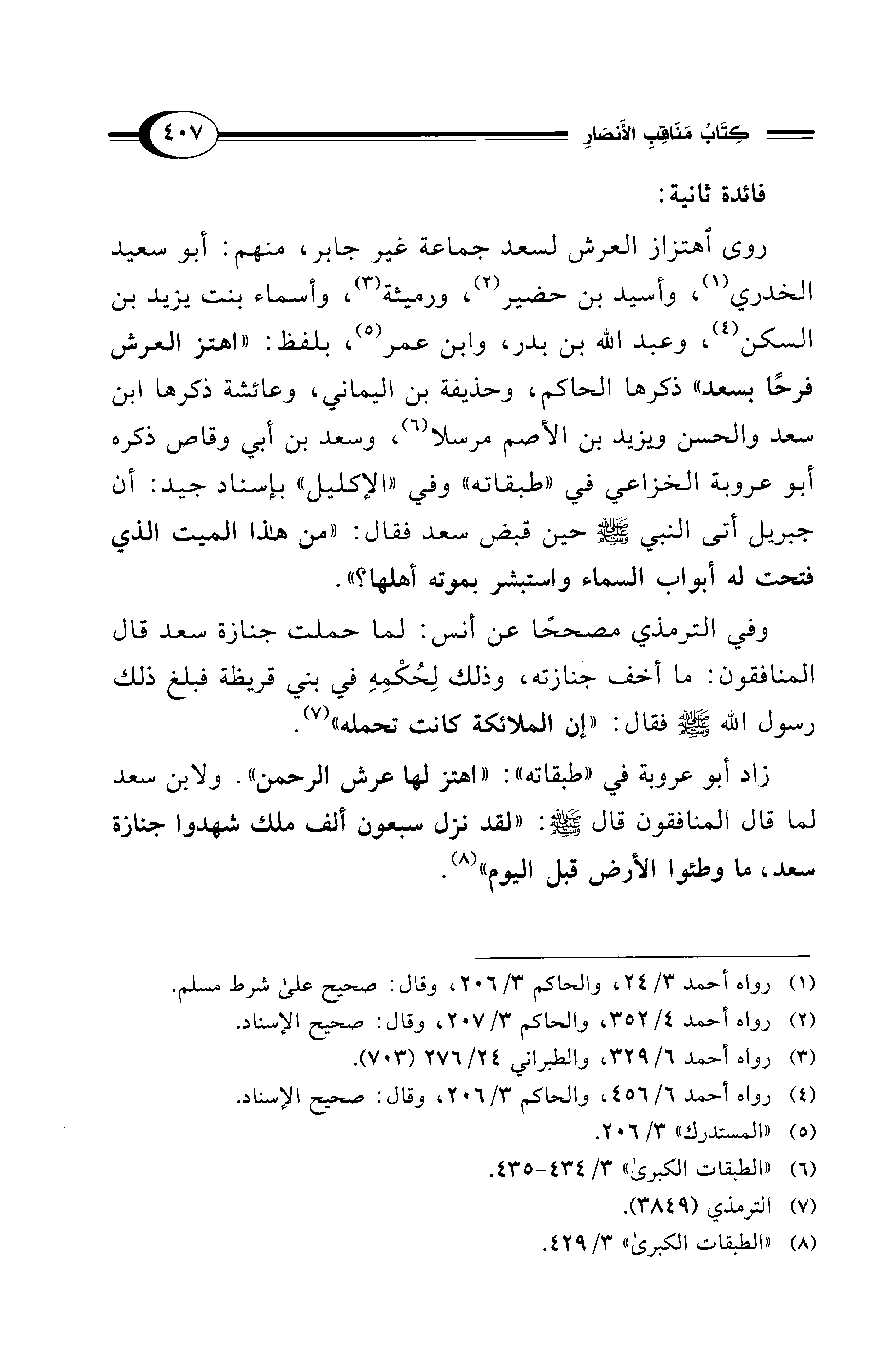 زاد أبو عروبة في "طبقاته": "اهتز لها عرش الرحمن". ولابن سعد لما قال المنافقون قال - صلى الله عليه وسلم -: "لقد نزل سبعون ألف ملك شهدوا جنازة سعد، ما وطئوا الأرض قبل اليوم" (¬8).